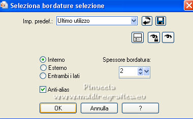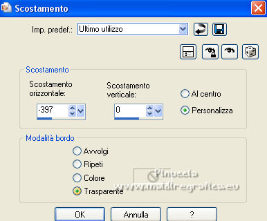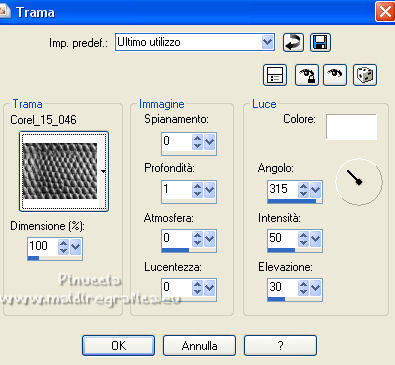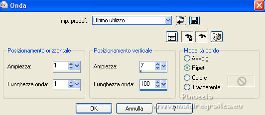 qui puoi trovare qualche risposta ai tuoi dubbi. Se l'argomento che ti interessa non è presente, ti prego di segnalarmelo. Questo tutorial è stato realizzato con Corel19 e tradotto con CorelX7, CorelX2 e CorelX3, ma può essere eseguito anche con le altre versioni di PSP. Dalla versione X4, il comando Immagine>Rifletti è stato sostituito con Immagine>Capovolgi in orizzontale, e il comando Immagine>Capovolgi con Immagine>Capovolgi in verticale. Nelle versioni X5 e X6, le funzioni sono state migliorate rendendo disponibile il menu Oggetti. Con la nuova versione X7, sono tornati Rifletti>Capovolgi, ma con nuove varianti. Vedi la scheda sull'argomento qui traduzione in francese/traduction en français qui/ici Versioni/Versions quiOccorrente: Un misted e un tube a scelta. Il resto del materiale qui Per i tubes usati grazie Jewel. (in questa pagina trovi i links ai siti dei creatori di tubes) Filtri: se hai problemi con i filtri, consulta la mia sezione filtri qui Filters Unlimited 2.0 qui Tramages - Wee Scratches qui VM Extravaganza - Transmission qui Carolaine and Sensibility - CS-LDots qui Flaming Pear - Flood qui AAA Filters - Foto Frame qui I filtri Tramages e VM Extravaganza si possono usare da soli o importati in Filters Unlimited (come fare vedi qui) Se un filtro fornito appare con questa icona ![]() non esitare a cambiare modalità di miscelatura e opacità secondo i colori utilizzati. ![]() Metti le selezioni nella cartella Selezioni. 1. Imposta il colore di primo piano con #042046, e il colore di sfondo con il colore #aec1d6. ![]() Apri una nuova immagine trasparente 1000 x 650 pixels. Riempi l'immagine trasparente con il colore di primo piano #042046.2. Selezione>Seleziona tutto. Apri il tuo misted e vai a Modifica>Copia. Torna al tuo lavoro e vai a Modifica>Incolla nella selezione. Selezione>Deseleziona. 3. Effetti>Effetti di immagine>Motivo unico, con i settaggi standard. ![]() 4. Regola>Sfocatura>Sfocatura gaussiana - raggio 30. ![]() 5. Effetti>Plugins>Tramages - Wee Scratches. ![]() Regola>Messa a fuoco>Metti a fuoco. Chiudi il livello Raster 1. 6. Livelli>Nuovo livello raster. Selezione>Carica/Salva selezione>Carica selezione da disco. Cerca e carica la selezione selwave_1. ![]() Riempi la selezione con il colore di primo piano # 042046.7. Effetti>Effetti di trama>Trama - seleziona la trama Pelle di serpente o Corel_15_046 ![]() 8. Selezione>Modifica>Seleziona bordature selezione. ![]() Livelli>Nuovo livello raster. Riempi con il colore di sfondo #aec1d6.9. Effetti>Effetti 3D>Smusso a incasso. ![]() Livelli>Unisci>Unisci giù. Selezione>Deseleziona. 10. Effetti>Effetti 3D>Sfalsa ombra. ![]() 11. Livelli>Nuovo livello raster. Selezione>Carica/Salva selezione>Carica selezione da disco. Cerca e carica la selezione selwave_2. ![]() Riempi la selezione con il colore di primo piano #042046.Selezione>Deseleziona. 12. Effetti>Plugins>VM Extravaganza - Transmission. ![]() 13. Effetti>Effetti di distorsione>Onda. ![]() 14. Effetti>Plugins>Carolaine and Sensibility - CS_LDots. ![]() Regola>Messa a fuoco>Metti a fuoco. 15. Effetti>Effetti 3D>Sfalsa ombra. ![]() 16. Livelli>Disponi>Sposta giù. ![]() 17. Attiva il livello superiore. Apri il tube Deco Wave e vai a Modifica>Copia. Torna al tuo lavoro e vai a Modifica>Incolla come nuovo livello. Effetti>Effetti di immagine>Scostamento. ![]() 18. Riapri e attiva il livello raster 1. Livelli>Nuovo livello raster. Selezione>Seleziona tutto. Attiva nuovamente il tuo misted e vai a Modifica>Copia. Torna al tuo lavoro e vai a Modifica>Incolla nella selezione. Selezione>Deseleziona. 19. Effetti>Plugins>Flaming Pear - Flood ![]() Adatta i settaggi al tuo paesaggio; per il mio esempio ho usato un colore dell'immagine, e ho impostato Brilliance a 42 ![]() Cambia la modalità di miscelatura di questo livello in Luminanza (esistente), o altro. 20. Attiva il livello superiore. Apri il tube Thingyamauvethingy e vai a Modifica>Copia. Torna al tuo lavoro e vai a Modifica>Incolla come nuovo livello. Effetti>Effetti di immagine>Scostamento, con i settaggi precedenti. ![]() 21. Effetti>Effetti 3D>Sfalsa ombra. ![]() Regola>Messa a fuoco>Metti a fuoco. 22. Livelli>Unisci>Unisci visibile. 23. Effetti>Plugins>AAA Frames - Foto Frame. ![]() 24. Modifica>Copia. 25. Immagine>Aggiungi bordatura, 1 pixel, simmetriche, colore scuro. Immagine>Aggiungi bordatura, 10 pixels, simmetriche, colore chiaro. Immagine>Aggiungi bordatura, 1 pixel, simmetriche, colore scuro. 26. Selezione>Seleziona tutto. Immagine>Aggiungi bordatura, 40 pixels, simmetriche, colore bianco #ffffff. 27. Selezione>Inverti. Modifica>Incolla nella selezione. 28. Regola>Sfocatura>Sfocatura gaussiana - raggio 30. ![]() 29. Effetti>Plugins>Graphics Plus - Cross Shadow, con i settaggi standard. ![]() 30. Effetti>Plugins>Filters Unlimited 2.0 - Tile & Mirror - Mirrore & Scaled. ![]() Selezione>Deseleziona. 31. Apri il tuo tube e vai a Modifica>Copia. Torna al tuo lavoro e vai a Modifica>Incolla come nuovo livello. Immagine>Ridimensiona, se e quanto necessario, tutti i livelli non selezionato. Posiziona il tube al centro.Effetti>Effetti 3D>Sfalsa ombra, a scelta. 32. Firma il tuo lavoro su un nuovo livello. Livelli>Unisci>Unisci tutto. Immagine>Ridimensiona, 1000 pixels di larghezza, tutti i livelli selezionato. Salva in formato jpg. ![]() Puoi scrivermi se hai problemi o dubbi, o trovi un link che non funziona, o soltanto per un saluto. |