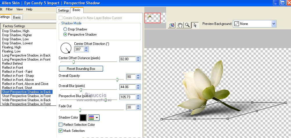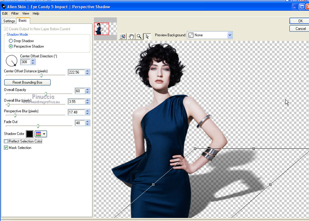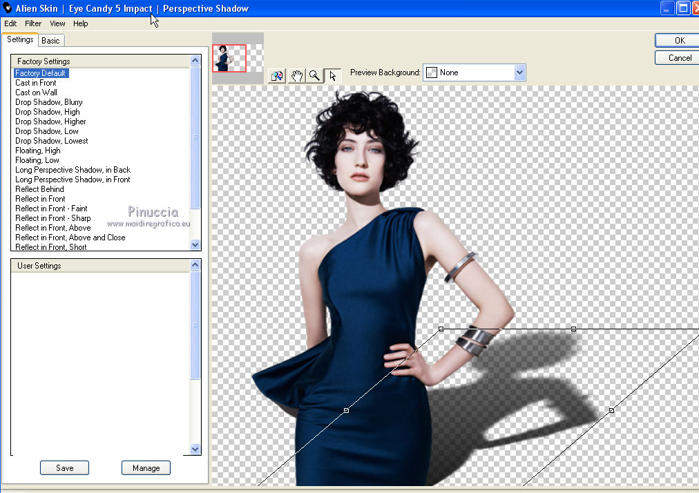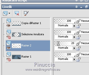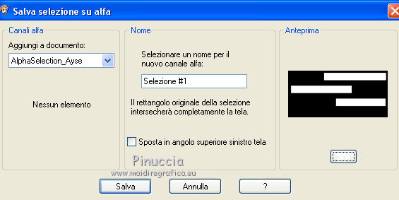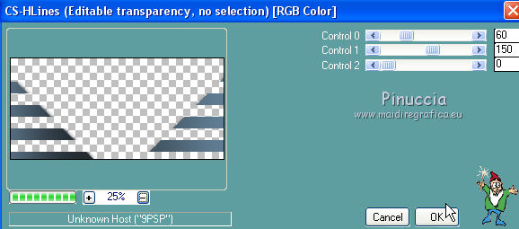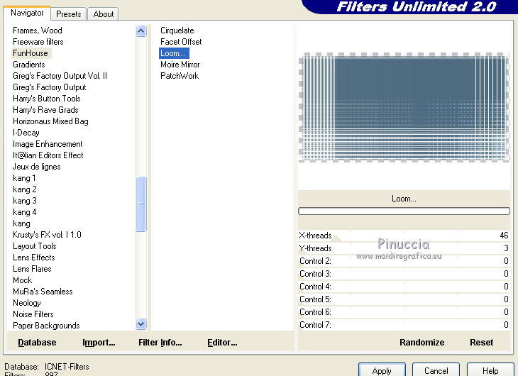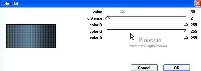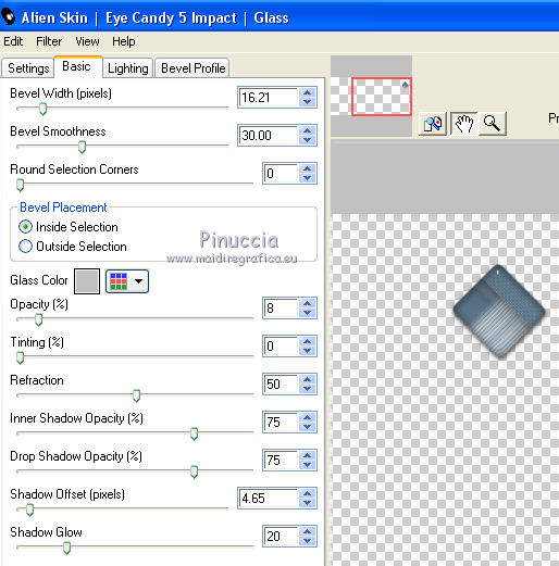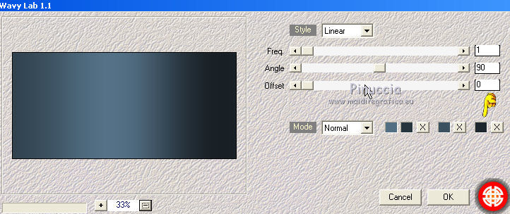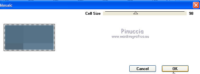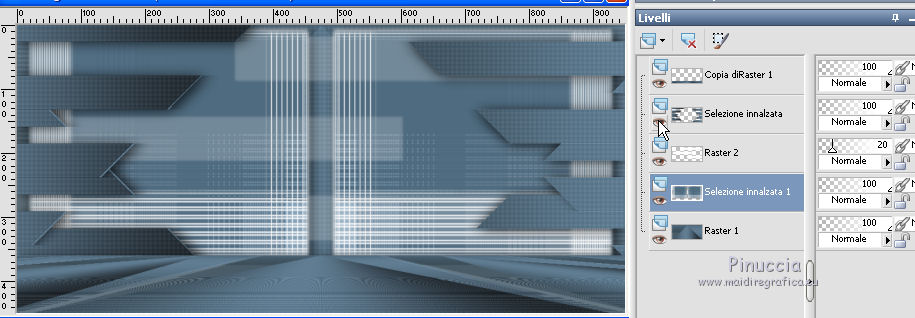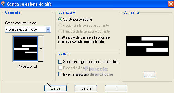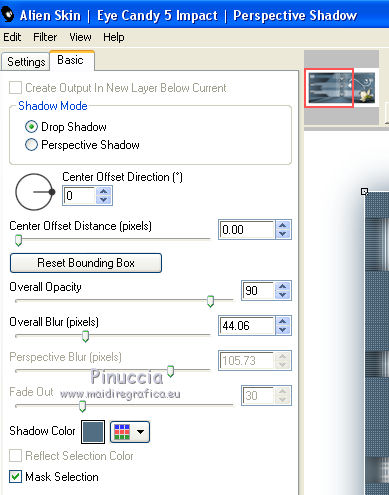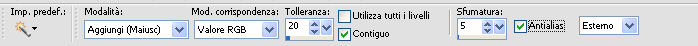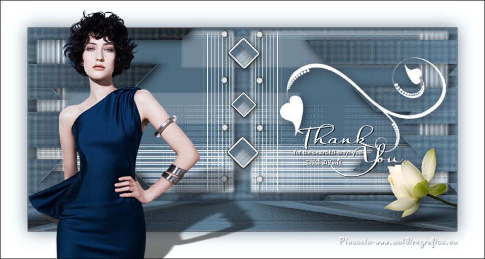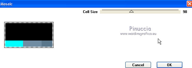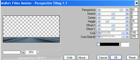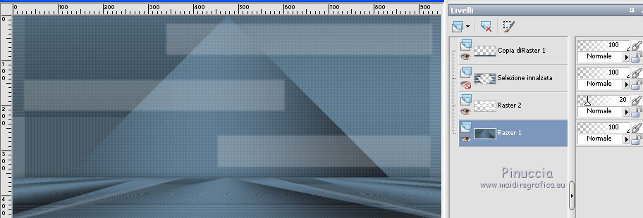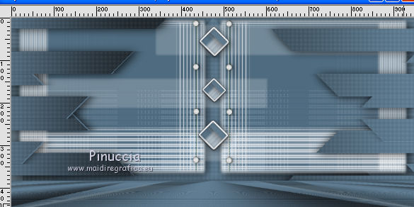 qui puoi trovare qualche risposta ai tuoi dubbi. Se l'argomento che ti interessa non è presente, ti prego di segnalarmelo. Questo tutorial è stato realizzato con Corel2018 e tradotto con Corel X, ma può essere realizzato anche con le altre versioni di PSP. Dalla versione X4, il comando Immagine>Rifletti è stato sostituito con Immagine>Capovolgi in orizzontale, e il comando Immagine>Capovolgi con Immagine>Capovolgi in verticale. Nelle versioni X5 e X6, le funzioni sono state migliorate rendendo disponibile il menu Oggetti. Con la nuova versione X7, sono tornati Rifletti>Capovolgi, ma con nuove varianti. Vedi la scheda sull'argomento qui traduzione in francese qui le vostre versioni qui Occorrente: Materiale qui Il tube della donna è di Cady. (in questa pagina trovi i links ai siti dei creatori di tubes) Filtri in caso di dubbi, ricorda di consultare la mia sezione filtri qui Filters Unlimited 2.0 qui Mehdi - Wavy Lab 1.1 qui Penta.com - Color dot qui Carolaine and Sensibility - CS-HLines qui Mura's Meister - Perspective Tiling qui Alien Skin Eye Candy 5 Impact - Perspective Shadow, Glass qui Mock - Mosaic qui Funhouse - Loom qui Simple - Top Bottom Wrap (bonus) qui Simple - Blintz qui I filtri Penta.com, Mock, Simple e Funhouse si possono usare da soli o importati in Filters Unlimited (come fare vedi qui) Se un filtro fornito appare con questa icona ![]() non esitare a cambiare modalità di miscelatura e opacità secondo i colori utilizzati. Metti il pennello nella cartella Pennelli. Attenzione, il pennello è composto da due files che non devono essere separati. (nel materiale trovi anche il file in formato psp) Vedi gli appunti sui pennelli qui 1. Apri una nuova immagine trasparente 950 x 450 pixels. 2. Imposta il colore di primo piano con #27353e, e il colore di sfondo con #526e83. ![]() 3. Effetti>Plugins>Mehdi - Wavy Lab 1.1. Questo filtro crea gradienti con i colori della paletta: il primo è il colore di sfondo, il secondo quello di primo piano. Degli altri due colori creati dal filtro cambia l'ultimo con #1d262d. ![]() 4. Effetti>Plugins>Penta.com - Color Dot. ![]() 5. Effetti>Plugins>Simple - Top Bottom Wrap. Effetti>Plugins>Simple - Blintz. Questi filtri, se usati soli, si applicano senza finestre. Risultato ![]() 6. Attiva lo strumento Selezione a mano libera , da punto a punto![]() e seleziona il rettangolo al centro ![]() Selezione>Innalza selezione a livello. Selezione>Deseleziona. 7. Effetti>Effetti 3D>Sfalsa ombra. ![]() 8. Effetti>Plugins>Carolaine and Sensibility - CS-HLines. ![]() 9. Livelli>Duplica. Immagine>Capovolgi. Livelli>Unisci>Unisci giù. 10. Effetti>Effetti 3D>Sfalsa ombra. ![]() 11. Attiva il livello Raster 1. Livelli>Duplica. Effetti>Plugins>Mura's Meister - Perspective Tiling. ![]() Livelli>Disponi>Sposta su. 12. Effetti>Effetti 3D>Sfalsa ombra. ![]() 13. Chiudi i due livelli inferiori e attiva il livello Raster 1. ![]() 14. Livelli>Nuovo livello raster. ![]() 15. Apri "Ayse AlphaSelection.jpg">. Attiva lo strumento Bacchetta magica ![]() ![]() Clicca nei rettangoli bianchi per selezionarli. ![]() Selezione>Carica/Salva selezione>Salva selezione su canale alfa. ![]() 16. Minimizza la selezione e torna al tuo lavoro. Selezione>Carica/Salva selezione>Carica selezione da canale alfa. La selezione appena salvata è subito disponibile. Devi soltanto cliccare Carica. ![]() Imposta il colore di primo piano con il colore bianco #ffffff. Riempi la selezione con il colore bianco #ffffff.![]() Selezione>Deseleziona. Abbassa l'opacità di questo livello al 20%. ![]() 17. Riapri e attiva il livello Raster 1. ![]() 18. Attiva lo strumento Selezione , rettangoloTraccia un rettangolo come nell'esempio ![]() Selezione>Innalza selezione a livello. 19. Effetti>Plugins>Mock - Mosaic. ![]() non preoccuparti dei colori che vedi nella schermata. Nella versione eseguita con PSPX ho avuto questo ![]() In entrambi i casi, il risultato è stato questo. ![]() 20. Effetti>Plugins>Filters Unlimited 2.0 - Funhouse - Loom ![]() Attenzione, se stai usando la versione software di Unlimited, avrai un risultato differente. Per ottenere il risultato del tutorial, ho usato la versione di Unlimited che non si installa, ma è composta da files in formato 8bf (la trovi qui) (scompatta in una cartella e aggiungi questa cartella ai Percorsi Files, dopo aver rimosso il filtro esistente nei Percorsi. Successivamente, potrai sempre fare l'operazione inversa) Selezione>Deseleziona. 21. Attiva lo strumento Puntatore ![]() e usa i nodi centrali per allargare l'immagine come nell'esempio. ![]() 22. Per riflettere l'immagine nella stessa posizione: Immagine>Capovolgi>Capovolgi in orizzontale (nelle versioni più recenti di PSP). Se stai usando una versione precedente: Selezione>Seleziona tutto. Selezione>Mobile. Selezione>Immobilizza Immagine>Rifletti ![]() Selezione>Deseleziona. 23. Livelli>Duplica. Immagine>Rifletti. Livelli>Unisci>Unisci giù. ![]() Effetti>Effetti 3D>Sfalsa ombra. ![]() 24. Riapri il livello ancora chiuso (Selezione innalzata). ![]() prima di unire i livelli, ho apportato questa variante. A te decidere Attiva il livello del filtro Mura's. Strumento Puntatore ![]() e spingi un po' più in basso il nodo centrale superiore. ![]() Livelli>Unisci>Unisci visibile. 25. Attiva lo strumento Selezione , rettangoloTraccia un piccolo rettangolo in alto a destra. ![]() Selezione>Innalza selezione a livello. Selezione>Deseleziona. Immagine>Ruota per gradi - 45 gradi a destra ![]() ![]() 26. Effetti>Plugins>Alien Skin Eye Candy 5 Impact - Glass Factory Default con i seguenti settaggi Glass Color #c0c0c0 ![]() Sposta la figura in alto al centro.![]() 27. Selezione>Seleziona tutto Selezione>Mobile. Selezione>Immobilizza ![]() Livelli>Nuovo livello raster. Riempi con il colore bianco #ffffff.Selezione>Modifica>Contrai - 5 pixels. ![]() Premi sulla tastiera il tasto CANC ![]() Selezione>Deseleziona. Effetti>Effetti di bordo>Aumenta. Livelli>Unisci>Unisci giù. Immagine>Ridimensiona, all'80%, tutti i 