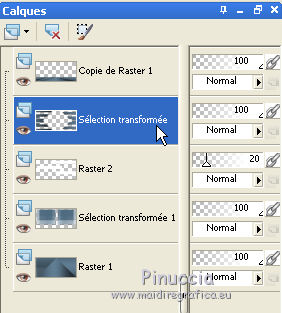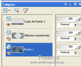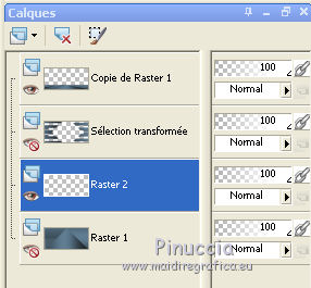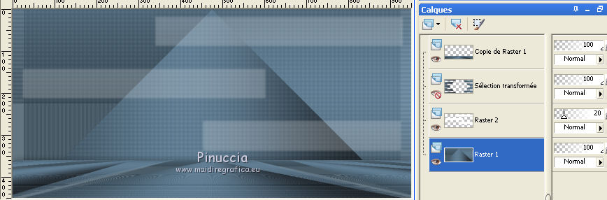 Le tutoriel a été réalisé avec Corel 2018 et traduit avec CorelX2 et CorelX5, mais il peut également être exécuté avec les autres versions. Suivant la version utilisée, vous pouvez obtenir des résultats différents. Depuis la version X4, la fonction Image>Miroir a été remplacée par Image>Renverser horizontalement, et Image>Renverser avec Image>Renverser verticalement. Dans les versions X5 et X6, les fonctions ont été améliorées par la mise à disposition du menu Objets. Avec la nouvelle version X7 nous avons encore Miroir et Renverser, mais avec nouvelles différences. Consulter, si vouz voulez, mes notes ici Certaines dénominations ont changées entre les versions de PSP. Les plus frequentes différences: ![]() traduction italienne ici vos versions ici Nécessaire pour réaliser ce tutoriel: Matériel ici Le tube de la femme est de Cady (dans cette page vous trouvez les liens aux sites des tubers. Modules Externes. consulter, si nécessaire, ma section de filtre ici Filters Unlimited 2.0 ici Mehdi - Wavy Lab 1.1 ici Penta.com - Color dot ici Carolaine and Sensibility - CS-HLines ici Mura's Meister - Perspective Tiling ici Alien Skin Eye Candy 5 Impact - Perspective Shadow, Glass ici Mock - Mosaic ici Funhouse - Loom ici Simple - Top Bottom Wrap (bonus) ici Simple - Blintz ici Filtres Toadies et Simple peuvent être utilisés seuls ou importés dans Filters Unlimited. voir comment le faire ici). Si un filtre est fourni avec cette icône, ![]() Si vous voulez utiliser vos propres couleurs, n'hésitez pas à changer le mode et l'opacité des calques Placer le pinceau dans le dossier Pinceaux. Attention, le pinceau se compose de deux files qui on ne doit séparer. Dans le zip vous trouvez aussi le pinceau en formato psp. 1. Ouvrir une nouvelle image transparente 950 x 450 pixels. 2. Placer en avant plan la couleur #27353e, et en arrière plan la couleur #526e83. ![]() 3. Effets>Modules Externes>Mehdi - Wavy Lab 1.1. Ce filtre crée dégradés avec les couleur de la palette: La première est la couleur d'arrière plan, la deuxième est la couleur d'avant plan. Des autres deux couleurs créées par le filtre, changer la dernière avec #1d262d. ![]() 4. Effets>Modules Externes>Penta.com - Color Dot. ![]() 5. Effets>Modules Externes>Simple - Top Bottom Wrap. Effets>Modules Externes>Simple - Blintz. Ces filtres, si utilisés seuls, s'appliquent sans fenêtre Résultat ![]() 6. Activer l'outil Sélection au lasso , point à point![]() et sélectionner le rectangle central ![]() Sélections>Transformer la sélection en calque. Sélections>Désélectionner tout. 7. Effets>Effets 3D>Ombre portée. ![]() 8. Effets>Modules Externes>Carolaine and Sensibility - CS-HLines. ![]() 9. Calques>Dupliquer. Image>Renverser. Calques>Fusionner>Fusionner le calque de dessous. 10. Effets>Effets 3D>Ombre portée. ![]() 11. Vous positionner sur le calque Raster 1. Calques>Dupliquer. Effets>Modules Externes>Mura's Meister - Perspective Tiling. ![]() Calques>Agencer>Déplacer vers le haut. 12. Effets>Effets 3D>Ombre portée. ![]() 13. Fermer les deux calques du bas de la pile et vous positionner sur le calque Raster 1. ![]() 14. Calques>Nouveau calque raster. ![]() 15. Ouvrir "Ayse AlphaSelection.jpg">. Activer l'outil Baguette magique ![]() ![]() et cliquer dans les rectangles blancs pour les sélectionner. ![]() Sélections>Charger/Enregistrer une sélection>Enregistrer sur un canal alpha. ![]() 16. Minimiser la sélection et revenir sur votre travail. Sélections>Charger/Enregistrer une sélection>Charger à partir d'un canal alpha. La sélections que vous avez enregistrée précédemment est immédiatement disponible. Vous devez seulement cliquer sur Charger. ![]() Placer en avant plan la couleur blanche #ffffff. Remplir la sélection avec la couleur blanche #ffffff.![]() Sélections>Désélectionner tout. Réduire l'opacité de ce calque à 20%. 17. Re-ouvrir et vous positionner sur le calque Raster 1. ![]() 18. Activer l'outil Sélection , rectangle![]() Tracer un rectangle comme ci-dessous. ![]() Sélections>Transformer la sélection en calque. 19. Effets>Modules Externes>Mock - Mosaic. ![]() ne vous inquiètez pas si les couleurs ne sont pas comme le miennes. Dans la version faite avec PSPX j'ai obtenu ceci ![]() En tout cas, le résultat a été ceci. ![]() 20. Effets>Modules Externes>Filters Unlimited 2.0 - Funhouse - Loom ![]() Attetion, si vous travaillez avec la version software de Unlimited, le résultat sera différent. Pour obtenir le résultat du tutorial, j'ai utilisé la version de Unlimited qui n'a pas besoin d'installation, parce que elle est composée par files en format 8bf (vous la trouvez ici) (dezipper dans un dossier et ajouter ce dossier dans les Emplacement des Fichiers, après avoir supprimé le filtre déjà existente. Ensuite, vous pourrez toujours faire l'opération contraire) Sélections>Désélectionner tout. 21. Activer l'outil Sélecteur ![]() et utiliser les noeuds centraux pour enlarger l'image comme ci-dessous. ![]() 22. Pour reflechir l'image sur la même position: Image>Renverser>Renverser horizontalement (dans les nouvelles versions de PSP) Si vous travaillez avec une version précédente: Sélections>Sélectionner tout. Sélections>Flottante. Sélections>Statique. Image>Miroir. ![]() Sélections>Désélectionner tout. 23. Calques>Dupliquer. Image>Miroir. Calques>Fusionner>Fusionner le calque de dessous. ![]() Effets>Effets 3D>Ombre portée. ![]() 24. Re ouvrir le calque encore fermé (Sélection transformée). ![]() avant de fusionner les calques, j'ai apporté cette variante; à vous décider. Vous positionner sur le calque du filtre Mura's. Outil Sélecteur ![]() et pousser un peu plus en bas le noeud central supérieur. ![]() Calques>Fusionner>Calques visibles. 25. Activer l'outil Sélection , rectangle,![]() Tracer un petit rectangle en haut à droite. ![]() Sélections>Transformer la sélection en calque. Sélections>Désélectionner tout. Image>Rotatio
