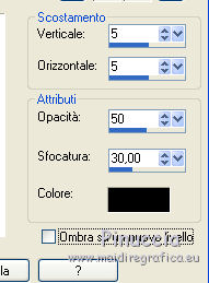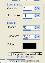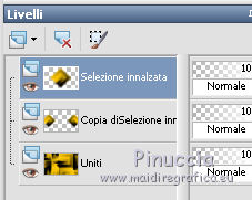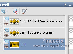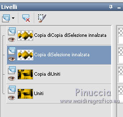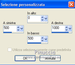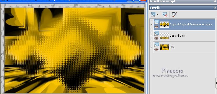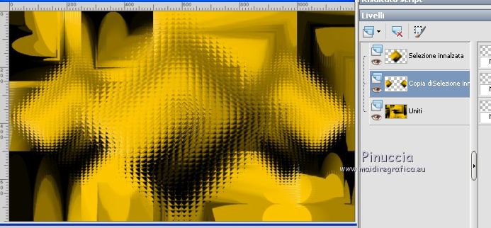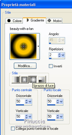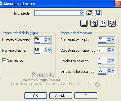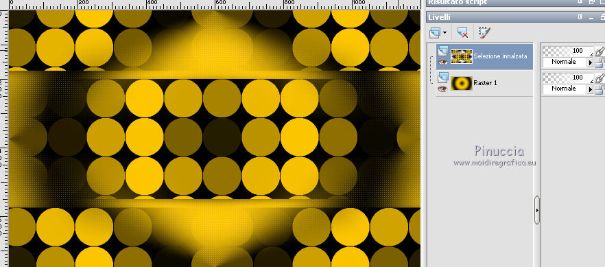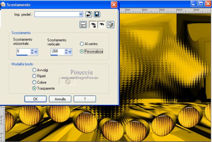 qui puoi trovare qualche risposta ai tuoi dubbi. Se l'argomento che ti interessa non è presente, ti prego di segnalarmelo. Questo tutorial è stato realizzato con Corel2018 e tradotto con Corel X, ma può essere realizzato anche con le altre versioni di PSP. Dalla versione X4, il comando Immagine>Rifletti è stato sostituito con Immagine>Capovolgi in orizzontale, e il comando Immagine>Capovolgi con Immagine>Capovolgi in verticale. Nelle versioni X5 e X6, le funzioni sono state migliorate rendendo disponibile il menu Oggetti. Con la nuova versione X7, sono tornati Rifletti>Capovolgi, ma con nuove varianti. Vedi la scheda sull'argomento qui traduzione in francese qui le vostre versioni qui Occorrente: Un tube a scelta Il resto del materiale qui Il tube della donna è SMart. Il resto del materiale è di Erina. (in questa pagina trovi i links ai siti dei creatori di tubes) Filtri in caso di dubbi, ricorda di consultare la mia sezione filtri qui Mehdi - Sorting Tiles qui CPK Designs - CK Pegs qui Carolaine and Sensibility - CS-LDots qui Mura's Meister - Perspective Tiling qui Alien Skin Eye Candy 5 Impact - Perspective Shadow qui I filtri CPK Designs. si possono usare da soli o importati in Filters Unlimited (come fare vedi qui) Se un filtro fornito appare con questa icona ![]() non esitare a cambiare modalità di miscelatura e opacità secondo i colori utilizzati. Metti il gradiente Beauty with a fan nella cartella Gradienti. 1. Apri una nuova immagine trasparente 1200 x 750 pixels Imposta il colore di primo piano con il colore nero #000000, e il colore di sfondo con #fcc601 ![]() Passa il colore di primo piano a Gradiente, e seleziona il gradiente Beauty with a fan, stile Sprazzo di luce. ![]() Riempi l'immagine trasparente con il gradiente.2. Regola>Sfocatura>Sfocatura gaussiana, raggio 35. ![]() 3. Attiva lo strumento Selezione , rettangolo,e traccia un rettangolo di 350 pixels (200-550 pixels) ![]() oppure Selezione personalizzata ![]() ![]() Selezione>innalza selezione a livello. Effetti>Plugins>CPK Designs - CK Pegs ![]() se usi l'effetto in Unlimited, potresti ottenere un risultato differente Effetti>Effetti 3D>Sfalsa ombra. ![]() Selezione>Deseleziona. 4. Attiva il livello Raster 1. Effetti>Plugins>Carolaine and Sensibility - CS-LDots ![]() 5. Attiva il livello Selezione innalzata. Effetti>Effetti di immagine>Motivo unico, con i settaggi standard. ![]() ![]() Livelli>Unisci>Unisci visibile. 6. Effetti>Plugins>Mehdi - Sorting Tiles. ![]() 7. Attiva lo strumento Selezione , rettangolo,e traccia un rettangolo come nell'esempio. ![]() oppure Selezione personalizzata ![]() ![]() Selezione>Innalza selezione a livello. Selezione>Deseleziona. 8. Immagine>Ruota per gradi - 45 gradi a sinistra. ![]() Posiziona correttamente l'immagine:Effetti>Effetti di immagine>Scostamento ![]() ![]() Effetti>Effetti di trama>Mosaico di vetro. ![]() Livelli>Duplica. Immagine>Ridimensiona, al 65%, tutti i livelli non selezionato. ![]() Sposta la figura a sinistra.![]() Livelli>Duplica. Immagine>Rifletti. Livelli>Unisci>Unisci giù. Livelli>Disponi>Sposta giù. ![]() Attiva il livello superiore Selezione innalzata ![]() Livelli>Unisci>Unisci giù. Livelli>Duplica. 10. Attiva il livello inferiore, Uniti. ![]() Livelli>Duplica. Attiva il livello soprastatante Copia di Selezione innalzata. ![]() Livelli>Unisci>Unisci giù. 11. Effetti>Plugins>Mura's Meister - Perspective Tiling. ![]() 12. Attiva il livello superiore. ![]() Attiva lo strumento Puntatore ![]() in modalità Scala ![]() spingi il nodo inferiore centrale verso l'alto fino a 650 pixels. ![]() Effetti>Effetti 3D>Sfalsa ombra. ![]() 13. Apri il tube Erina_padlozat_decort e vai a Modifica>Copia. Torna al tuo lavoro e vai a Modifica>Incolla come nuovo livello. Effetti>Effetti di immagine>Scostamento. ![]() Effetti>Effetti 3D>Sfalsa ombra. ![]() 14. Apri il tube Virag_decort e vai a Modifica>Copia. Torna al tuo lavoro e vai a Modifica>Incolla come nuovo livello. Spostalo a destra.![]() Effetti>Plugins>Alien Skin Eye Candy 5 Impact - Perspective Shadow. Seleziona il preset Reflet in front, Faint ![]() con i seguenti settaggi ![]() Livelli>Disponi>Sposta giù. 15. Attiva il livello superiore. Apri il tube della donna e vai a Modifica>Copia. Torna al tuo lavoro e vai a Modifica>Incolla come nuovo livello. Immagine>Ridimensina, al 140%, tutti i livelli non selezionato. Spostalo a sinistra.![]() Effetti>Plugins>Alien Skin Eye Candy 5 Impact - Perspective Shadow. ![]() 16. Apri il testo Elegant_woman e vai a Modifica>Copia. Torna al tuo lavoro e vai a Modifica>Incolla come nuovo livello. Spostalo in alto a destra.![]() Effetti>Effetti 3D>Sfalsa ombra. ![]() 17. Immagine>Aggiungi bordatura, 1 pixel, simmetriche, colore bianco. Immagine>Aggiungi bordatura, 3 pixels, simmetriche, colore di sfondo. Immagine>Aggiungi bordatura, 1 pixel, simmetriche, colore nero. Selezione>Seleziona tutto. Immagine>Aggiungi bordatura, 70 pixels, simmetriche, colore bianco. Effetti>Plugins>Alien Skin Eye Candy 5 Impact - Perspective Shadow. Shadow Color: colore di sfondo #fcc601 ![]() Selezione>Deseleziona. 18. Apri Erina_frame_decort e vai a Modifica>Copia. Torna al tuo lavoro e vai a Modifica>Incolla come nuovo livello. Spostalo sul bordo in alto a destra.![]() Effetti>Effetti 3D>Sfalsa ombra, con i settaggi precedenti. ![]() Livelli>Duplica. Immagine>Rifletti. Immagine>Capovolgi. ![]() Immagine>Ridimensiona, 950 pixels di larghezza, tutti i livelli selezionato. Firma il tuo lavoro e salva in formato jpg. Piccola nota sul watermark. Non chiedo mai di mettere il watermark nelle versioni fatte seguendo le mie traduzioni. Ma, se decidi di utilizzare il watermark fornito dall'autore, apprezzerei che anche il mio lavoro fosse rispettato. Per questo, ho aggiunto al materiale il mio watermark. ![]() ![]() Puoi scrivermi se hai problemi o dubbi, o trovi un link che non funziona, o soltanto per un saluto. 2 Maggio 2018 |