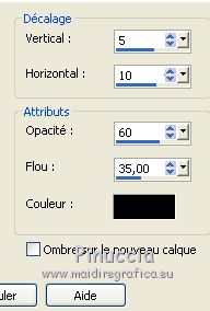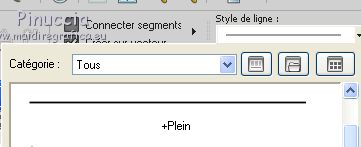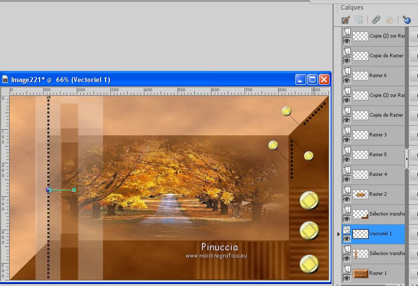 Le tutoriel a été réalisé avec Corel 2018 et traduit avec CorelX2 et CorelX5, mais il peut également être exécuté avec les autres versions. Suivant la version utilisée, vous pouvez obtenir des résultats différents. Depuis la version X4, la fonction Image>Miroir a été remplacée par Image>Renverser horizontalement, et Image>Renverser avec Image>Renverser verticalement. Dans les versions X5 et X6, les fonctions ont été améliorées par la mise à disposition du menu Objets. Avec la nouvelle version X7 nous avons encore Miroir et Renverser, mais avec nouvelles différences. Consulter, si vouz voulez, mes notes ici Certaines dénominations ont changées entre les versions de PSP. Les plus frequentes différences: ![]() traduction italienne ici vos versions ici Nécessaire pour réaliser ce tutoriel: Matériel ici (dans cette page vous trouvez les liens aux sites des tubers. Modules Externes. consulter, si nécessaire, ma section de filtre ici Filters Unlimited 2.0 qui Mura's Meister - Cloud ici &<Bkg Designer sf10I> - Cruncher (à importer dans Unlimited) ici Carolaine and Sensibility - CS-HLines ici ![]() Si vous voulez utiliser vos propres couleurs, n'hésitez pas à changer le mode et l'opacité des calques Les dernière versions de PSP ont des outils limités. Si vous ne trouvez pas la ligne de style Points dans votre PSP, ici vous trouvez le dossier de PSP12. 1. Placer en avant plan la couleur #6d3d23, et en arrière plan la couleur #c28042. ![]() Ouvrir une nouvelle image transparente 950 x 550. 2. Effets>Modules Externes>Mura's Meister - Cloud ![]() Ce filtre fonctionne avec les couleurs de la palette Styles et Textures, mais garde en mémoire les premières paramètres utilisés des l'ouverture de PSP. Donc, si vous avec déjà utilisé le filtre, pour être sûr d'avoir vos couleurs, cliquer sur Reset. Le résultat est aléatoire et pour cette raison il ne serait pas comme le mien. Pour changer le résultat, cliquer sur la fenêtre de prévisualisation, jusqu'à obtenir le résultat préféré. 3. Effets>Modules Externes>Filters Unlimited 2.0 - Buttons & Frames - Rectangular Button. ![]() 4. Ouvrir le tube du paysage de Lily, effacer le watermark et Édition>Copier. Revenir sur votre travail et Édition>Coller comme nouveau calque. Activer l'outil Sélecteur ![]() et adapter le tube à l'effet Unlimited ![]() ![]() 5. Placer en avant plan la couleur noire #000000, et en arrière plan la couleur blanche #ffffff. ![]() Activer l'outil Stylo ![]() ligne de style +Plein, largeur 1 ![]() ![]() Tenir enfoncée la touche shift pour obtenir des lignes droites, et tracer les lignes comme ci-dessous ![]() Calques>Convertir en calque raster. 6. Ouvrir erina_button et Édition>Copier. Revenir sur votre travail et Édition>Coller comme nouveau calque. Image>Redimensionner, à 50%, redimensionner tous les calques décoché. Déplacer le tube en haut à droite.![]() Calques>Dupliquer, 2 fois et positionner comme ci-dessous.![]() 7. Activer à nouveau l'outil Stylo ![]() changer style de ligne (points) et largeur (6 pixels). ![]() ![]() Toujours avec la couleur noire, tracer deux lignes comme ci-dessous. ![]() Calques>Convertir en calque raster. 8. Vous positionner sur le calque Raster 1. Activer l'outil Sélection , rectangle,et tracer un rectangle en bas à droite, comme ci-dessous. ![]() Sélections>Transformer la sélection en calque. Sélections>Désélectionner tout. 9. Effets>Modules Externes>Carolaine and Sensibility - CS-HLines ![]() Calques>Dupliquer. Image>Rotation libre - 90 degrés à droite ![]() Positionner bien le rectangle comme ci-dessous![]() Calques>Fusionner>Fusionner le calque de dessous. 10. Édition>Coller comme nouveau calque (le tube erina_button est toujours en mémoire). Calques>Agencer>Placer en haut de la pile. Calques>Dupliquer - 2 fois, et positionner les 3 boutons à droite, comme ci-dessous.![]() 11. Activer à nouveau le calque Raster 1. Activer l'outil Sélection , rectangle,et tracer un rectangle à gauche, comme ci-dessous ![]() Sélections>Transformer la sélection en calque. Sélections>Désélectionner tout. 12. Effets>Modules Externes>Filters Unlimited 2.0 - &<Bkg Designer sf10I> - Cruncher, par défaut. ![]() 13. Activer à nouveau l'outil Stylo , comme précédemmentstyle de ligne Point, largeur 6 ![]() et tracer une ligne comme ci-dessous ![]() ![]() Calques>Convertir en calque raster. Calques>Agencer>Placer en haut de la pile. Calques>Dupliquer. Déplacer la ligne un peu plus à droite,en utilisant la flechè sur le clavier ![]() Calques>Fusionner>Fusionner le calque de dessous. Calques>Dupliquer. Placer cette ligne au centre de la deuxième bande.![]() 14. Inverser les couleurs pour avoir la couleur blanche en avant plan. ![]() Outil Stylo comme précédemment (ligne de style Points, largeur 6)tracer une ligne verticale au centre des lignes noires. ![]() Calques>Convertir en calque raster. 15. Ouvrir le tube Virag-decor - Édition>Copier. Revenir sur votre travail et Édition>Coller comme nouveau calque. Image>Redimensionner, 1 fois à 50% et 1 fois à 70%, redimensionner tous les calques décoché. Calques>Dupliquer - 2 fois. Positionner les tubes sur la ligne blanche.![]() Pour mon exemple, j'ai ajouté cette étape (à vous décider si suivre ou non) En bas du tutoriel la version en suivant le tutoriel original sans cette étape Placer en avant plan la couleur noire. Activer l'outil Stylo , ligne de style +Plein, largeur 1,et tracer deux lignes comme ci-dessous ![]() Calques>Convertir en calque raster. Calques>Dupliquer. Déplacer ces lignes à droite.![]() 16. Image>Ajouter des bordures, 1 pixel, symétrique, couleur noire. Image>Ajouter des bordures, 70 pixels, symétrique, couleur blanche. 17. Sélections>Sélectionner tout. Calques>Nouveau calque raster. Remplir avec la couleur noire.Sélections>Modifier>Contracter - 1 pixel. ![]() Presser CANC sur le clavier ![]() Image>Redimensionner, à 95%, redimensionner tous les calques déc