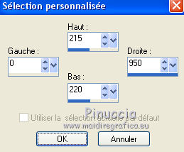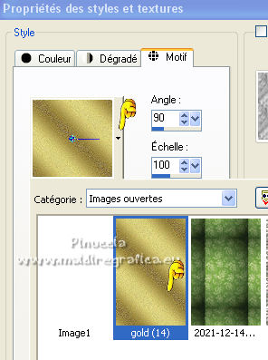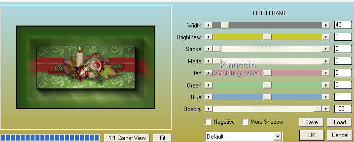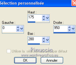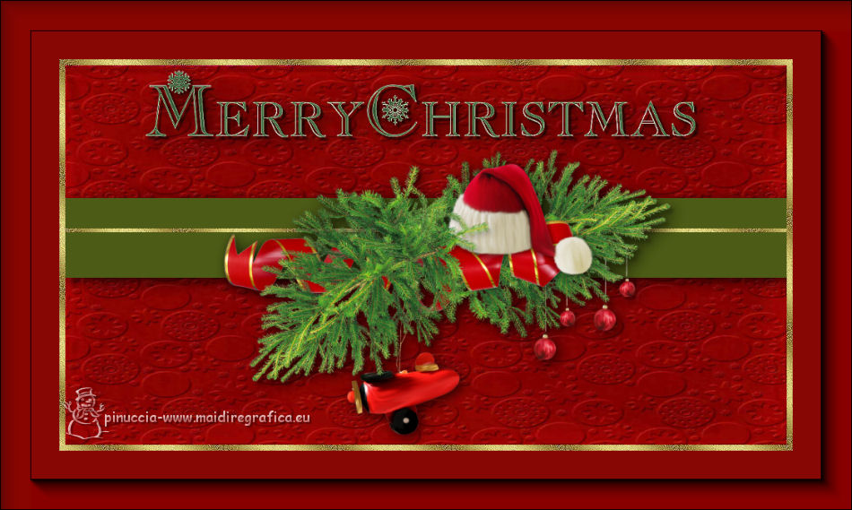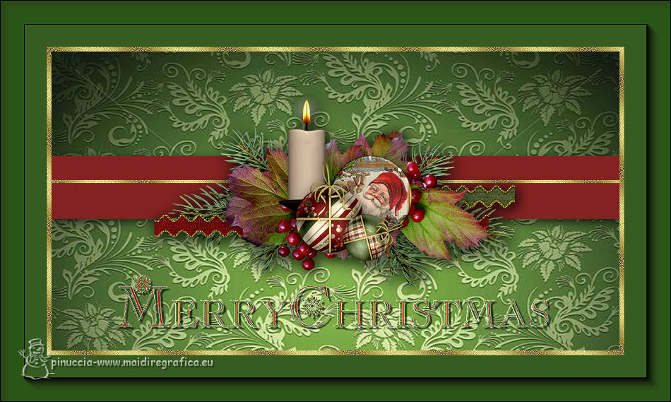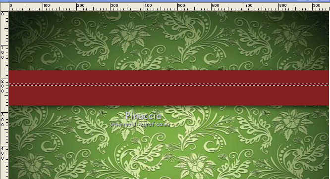 Le tutoriel a été réalisé avec Corel 2020 et traduit avec CorelX2 et CorelX5, mais il peut également être exécuté avec les autres versions. Suivant la version utilisée, vous pouvez obtenir des résultats différents. Depuis la version X4, la fonction Image>Miroir a été remplacée par Image>Renverser horizontalement, et Image>Renverser avec Image>Renverser verticalement. Dans les versions X5 et X6, les fonctions ont été améliorées par la mise à disposition du menu Objets. Avec la nouvelle version X7 nous avons encore Miroir et Renverser, mais avec nouvelles différences. Consulter, si vouz voulez, mes notes ici Certaines dénominations ont changées entre les versions de PSP. Les plus frequentes différences: ![]() traduction italienne ici vos versions ici![]() Nécessaire pour réaliser ce tutoriel: Matériel ici (dans cette page vous trouvez les liens aux sites des tubers. Modules Externes. consulter, si nécessaire, ma section de filtre ici AAA Frames - Foto Frame ici ![]() Si vous voulez utiliser vos propres couleurs, n'hésitez pas à changer le mode et l'opacité des calques ![]() Ouvrir le motif or gold(14) in PSP et le minimiser avec le reste du matériel. Placer en avant plan la couleur #842221. Placer en arrière plan Motif, et sélectionner le motif or gold(14) avec ces réglages ![]() 1. Ouvrir une nouvelle image arrière plan blanc 950 x 500 pixels. Sélections>Sélectionner tout. Ouvrir l'image verte d'arrière plan et Édition>Copier. Revenir sur votre travail et Édition>Coller dans la sélection. Sélections>Désélectionner tout. 2. Calques>Nouveau calque raster. Activer l'outil Sélection , rectangle,et tracer un rectangle horizontal comme ci-dessous. ![]() Pour moi: Sélection personnalisée ![]() ![]() 3. Remplir la sélection avec la couleur d'avant plan #842221.Sélections>Désélectionner tout. Effets>Effets 3D>Ombre portée. ![]() 4. Calques>Nouveau calque raster. Activer à nouveau l'outil Sélection , rectangle,et tracer un rectangle plus mince. ![]() Pour moi: Sélection personnalisée ![]() ![]() Remplir la sélection avec le motif or d'arrière plan.Sélections>Désélectionner tout. Calques>Fusionner>Calques visibles. Ouvrir le tube de la ghirlande et Édition>Copier. Revenir sur votre travail et Édition>Coller comme nouveau calque. Image>Redimensionner, 1 fois à 70% et 1 fois à 80%, redimensionner tous les calques décoché. Positionner bien le tube au centre.Effets>Effets 3D>Ombre portée, comme précédemment. ![]() 5. Image>Ajouter des bordures, 8 pixels, symétrique, couleur blanche. Activer l'outil Baguette magique ![]() et cliquer dans le bord blanc pour le sélectionner. Remplir la sélection avec le motif or.Sélections>Désélectionner tout. Image>Ajouter des bordures, 78 pixels, symétrique, couleur blanche. Sélectionner le bord avec la baguette magique ![]() Placer en avant plan une couleur de votre image; pour moi #375c21, et remplir la sélection avec la couleur d'avant plan.Garder sélectionné. 6. Effets>Modules Externes>AAA Frames - Foto Frame. ![]() Sélections>Désélectionner tout. 7. Ouvrir le wordart et Édition>Copier. Revenir sur votre travail et Édition>Coller comme nouveau calque. Image>Redimensionner, à 80%, redimensionner tous les calques décoché. Déplacer le wordart en bas, au centre.8. Signer votre travail sur un nouveau calque. Ajouter, si vous voulez, les watermarks de l'auteur et du traducteur. Image>Redimensionner, à 950 pixels de largeur, redimensionner tous les calques coché. Calques>Fusionner>Tous et enregistrer en jpg. ![]() ![]() Vous pouvez m'écrire pour n'importe quel problème, ou doute, ou si vous trouvez un link modifié, ou seulement pour me dire que ce tutoriel vous a plu. 20 Décembre 2021 |