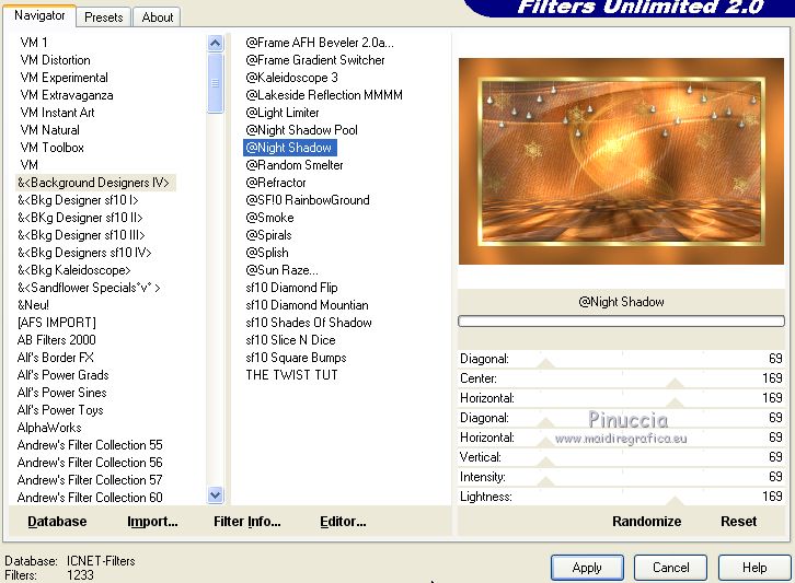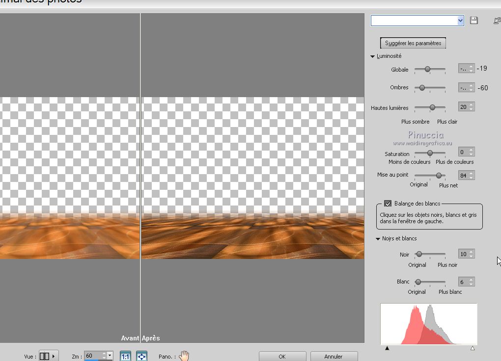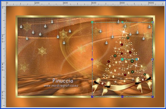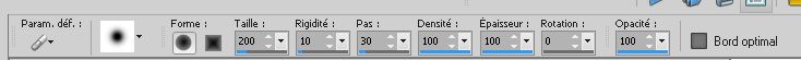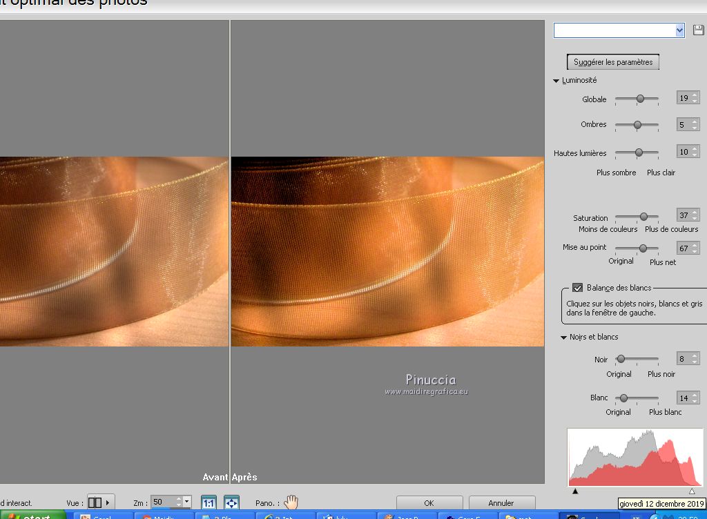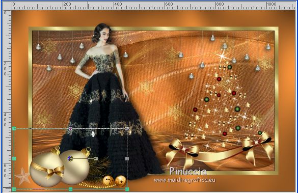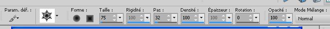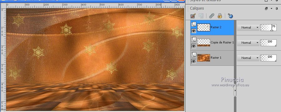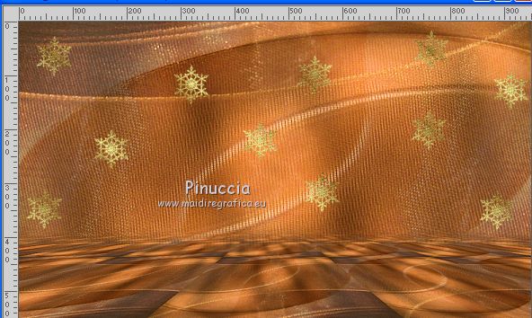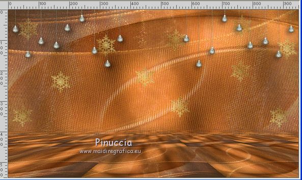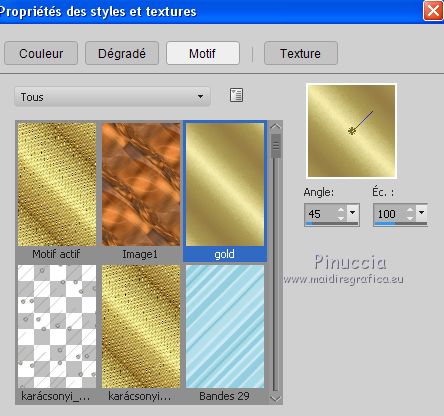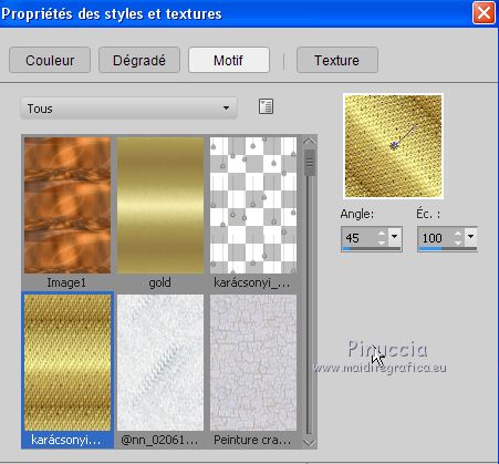 Le tutoriel a été réalisé avec Corel 2018 et traduit avec CorelX2 et CorelX5, mais il peut également être exécuté avec les autres versions. Suivant la version utilisée, vous pouvez obtenir des résultats différents. Depuis la version X4, la fonction Image>Miroir a été remplacée par Image>Renverser horizontalement, et Image>Renverser avec Image>Renverser verticalement. Dans les versions X5 et X6, les fonctions ont été améliorées par la mise à disposition du menu Objets. Avec la nouvelle version X7 nous avons encore Miroir et Renverser, mais avec nouvelles différences. Consulter, si vouz voulez, mes notes ici Certaines dénominations ont changées entre les versions de PSP. Les plus frequentes différences: ![]() traduction italienne ici vos versions ici Nécessaire pour réaliser ce tutoriel: Matériel ici Pour le tube merci sMart. (dans cette page vous trouvez les liens aux sites des tubers. Modules Externes. consulter, si nécessaire, ma section de filtre ici Filters Unlimited 2.0 ici Mura's Meister - Perspective Tiling ici &<Background Designer IV> - @Night Shadow (à importer dans Unlimited) ici ![]() Si vous voulez utiliser vos propres couleurs, n'hésitez pas à changer le mode et l'opacité des calques Placer le pinceau dans le dossier Pinceaux. Attention, le pinceau se compose de deux files qui on ne doit séparer. Ouvrir les motifs or dans PSP et les minimiser avec le reste du matériel. 1. Ouvrir une nouvelle image transparente 950 x 550. 2. Sélections>Sélectionner tout. Ouvrir l'image Organza aranybarna szalag.jpg - Édition>Copier. Revenir sur votre travail et Édition>Coller dans la sélection. Sélections>Désélectionner tout. 3. Effets>Modules Externes>Filters Unlimited 2.0 - &<Background Designer IV> - @Night Shadow, par défaut ![]() 4. Réglage>Traitement optimal des photos. ![]() le résultat de cet effet peut être différent selon les couleurs, et la version de PSP utilisée. Si nécessaire, régler les settages à votre convenance (voir la traduction italienne et, au bas du tutoriel, la version obtenue avec PSPX) 5. Calques>Dupliquer. Image>Miroir. Image>Renverser. Réduire l'opacité de ce calque à 50%. ![]() 6. Calques>Dupliquer. Effets>Modules Externes>Mura's Meister - Perspective Tiling ![]() Activer l'outil Gomme avec ces règlages![]() appliquer l'outil sur l'effet pour dégrader la ligne du bord avec l'arrière plan. ![]() ***** si vous n'aimez pas utiliser cet outil, activer l'outil Baguette magique , progressivité 40,cliquer sur la partie trasparente au dessus de l'effet Mura pour la sélectionner, presser 2-3 fois CANC sur le clavier ![]() Sélections>Désélectionner tout ***** 7. Rester positionné sur le calque de l'effet Mura. Réglage>Traitement optimal des photos. ![]() 8. Vous positionner sur le calque du bas de la pile. Réglage>Traitement optimal des photos. ![]() Cela devrait donner un meilleur éclairage a l'image. Comme écrit précédemment, si nécessiare, vous pouvez adapter les règlages en fonction de vos couleurs et de votre version de PSP. 9. Placer en avant plan Motif et chercher, sous la catégorie Images Ouvertes, le motif or karacsonyi... dans les nouvelles versions les images ouvertes sont au dessus de la liste des images ![]() Placer en arrière plan Motif et chercher, sous la catégorie Images Ouvertes, le deuxième motif or gold, mêmes réglages ![]() ![]() 10. Activer l'outil Pinceau ![]() chercher et sélectionner le pinceau Snowflakes, taille 75 ![]() Vous positionner sur le calque du haut de la pile. Calques>Nouveau calque raster. Appliquer le pinceau plusieures fois, comme ci-dessous, en cliquant avec la touche gauche de la souris pour utiliser le motif d'avant plan. ![]() Réduire l'opacité de ce calque à 70%. ![]() 11. Ouvrir le tube karacsonyi_diszt - Édition>Copier. Revenir sur votre travail et Édition>Coller comme nouveu calque. Déplacer le tube en haut à gauche.Effets>Effets 3D>Ombre portée. ![]() Calques>Dupliquer. Image>Miroir. Calques>Fusionner>Fusionner le calque de dessous. ![]() 12. Vous positionner sur le calque de dessous du pinceau. Ouvrir le tube fatyol dekor - Édition>Copier. Revenir sur votre travail et Édition>Coller comme nouveu calque. Positionner ![]() bien le tube au centre.![]() 13. Image>Ajouter des bordures, 1 pixel, symétrique, couleur noire #000000. Image>Ajouter des bordures, 15 pixels, symétrique, couleur blanche #ffffff. Activer l'outil Baguette magique ![]() et cliquer sur le bord blanc pour le sélectionner. Remplir la sélection avec le motif or d'arrière plan.Sélections>Désélectionner tout. 14. Placer en avant plan la couleur #945824. Sélections>Sélectionner tout. Image>Ajouter des bordures, 65 pixels, symétrique, n'importe quelle couleur. Sélections>Inverser. Remplir la sélection avec la couleur d'avant plan.Effets>Modules Externes>Filters Unlimited 2.0 - &<Background Designer IV> - @Night Shadow, par défaut ![]() Sélections>Désélectionner tout. 15. Ouvrir le tube karacsonyfa - Édition>Copier. Revenir sur votre travail et Édition>Coller comme nouveu calque. Positionner ![]() bien le tube à droite.![]() 16. Ouvrir le tube della donna, effacer le watermark, - Édition>Copier. Revenir sur votre travail et Édition>Coller comme nouveu calque. Positionner ![]() bien le tube à gauche.![]() Effets>Effets 3D>Ombre portée. ![]() 17. Ouvrir le tube karacsonyi gomb dekort, - Édition>Copier. Revenir sur votre travail et Édition>Coller comme nouveu calque. Déplacer ![]() le tube en bas à gauche.![]() Effets>Effets 3D>Ombre portée, comme précédemment. ![]() 18. Signer votre travail sur un nouveau calque. Calques>Fusionner>Tous. 19. Image>Redimensionner, 950 pixels de largeur, redimensionner tous les calques coché. Enregistrer en jpg. Version avec PSPX ![]() Version avec tubes de Isa ![]() ![]() Vous pouvez m'écrire pour n'importe quel problème, ou doute, ou si vous trouvez un link modifié, ou seulement pour me dire que ce tutoriel vous a pl