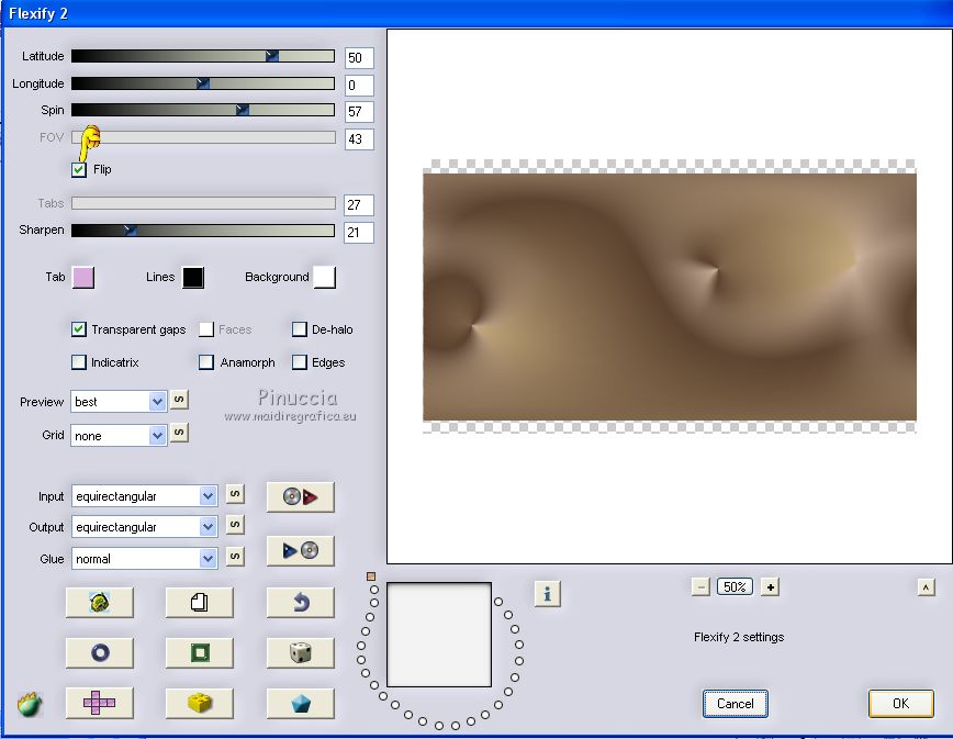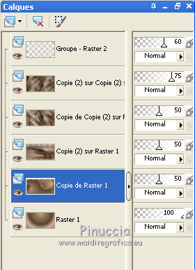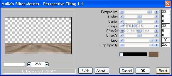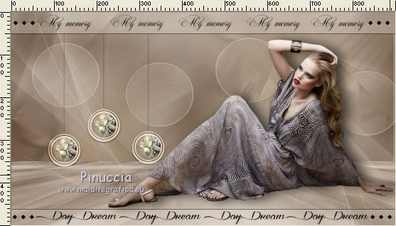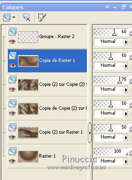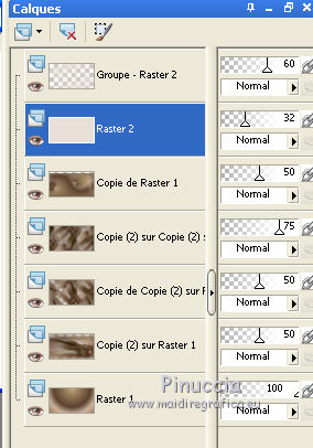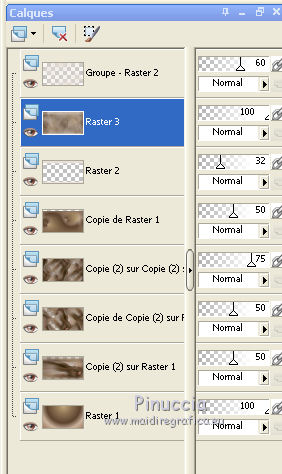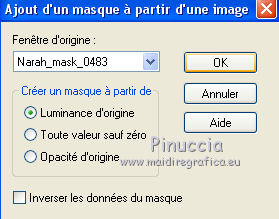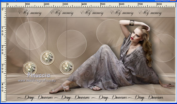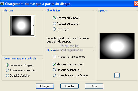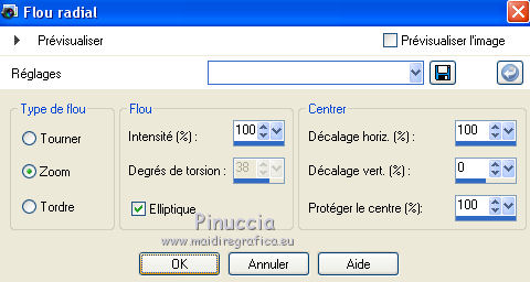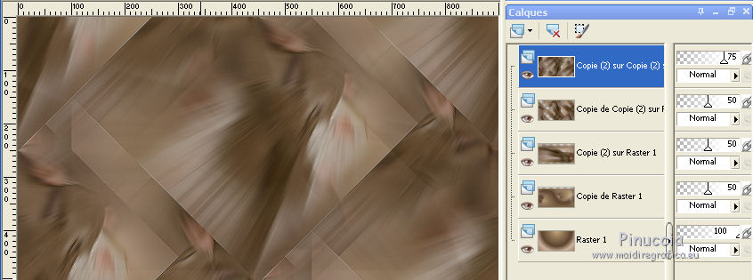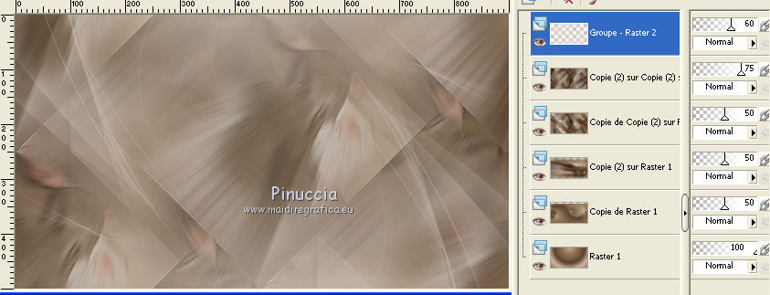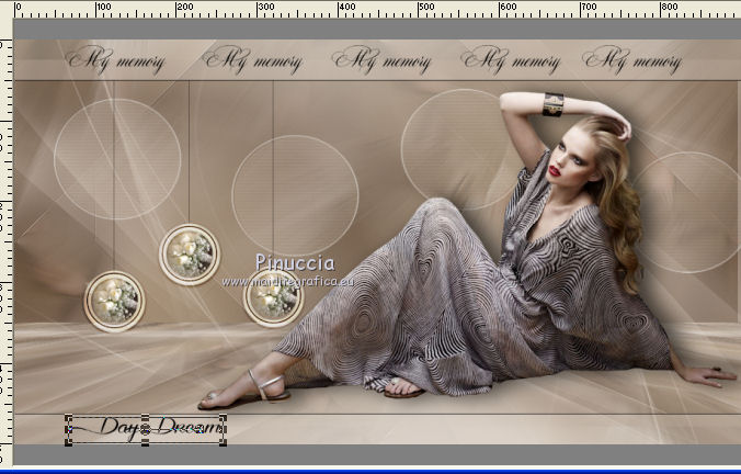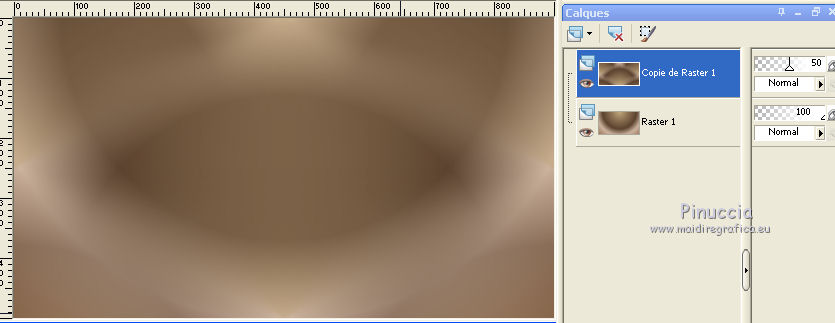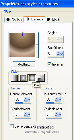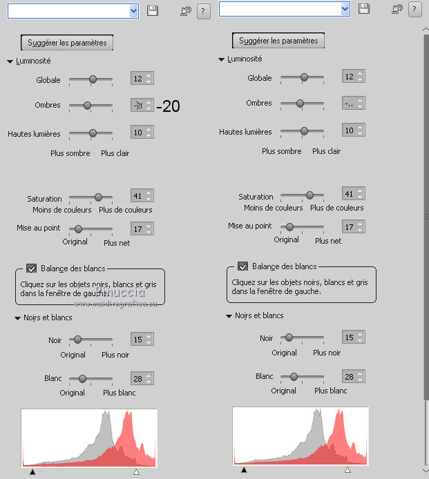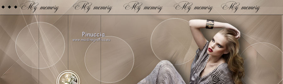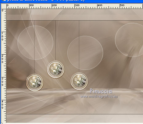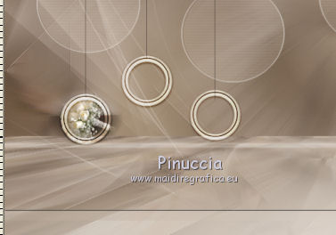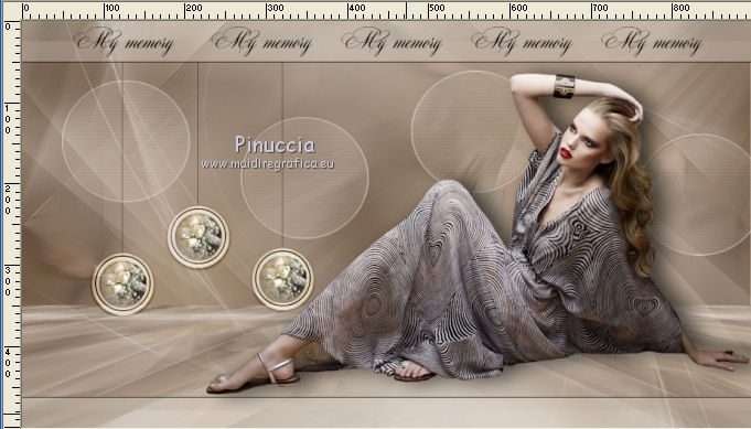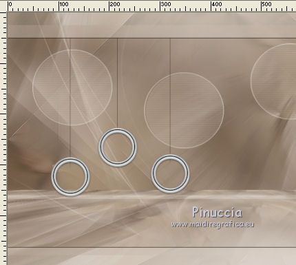 Le tutoriel a été réalisé avec Corel 2018 et traduit avec CorelX2 et CorelX5, mais il peut également être exécuté avec les autres versions. Suivant la version utilisée, vous pouvez obtenir des résultats différents. Depuis la version X4, la fonction Image>Miroir a été remplacée par Image>Renverser horizontalement, et Image>Renverser avec Image>Renverser verticalement. Dans les versions X5 et X6, les fonctions ont été améliorées par la mise à disposition du menu Objets. Avec la nouvelle version X7 nous avons encore Miroir et Renverser, mais avec nouvelles différences. Consulter, si vouz voulez, mes notes ici Certaines dénominations ont changées entre les versions de PSP. Les plus frequentes différences: ![]() traduction italienne ici vos versions ici Nécessaire pour réaliser ce tutoriel: Matériel ici Merci pour le tube S.Anna et pour le masque Narah. (dans cette page vous trouvez les liens aux sites des tubers. Modules Externes. consulter, si nécessaire, ma section de filtre ici Filters Unlimited 2.0 ici Flaming Pear - Flexify 2 ici Mura's Meister - Perspective Tiling ici FM Tile Tools - Blend Emboss ici Simple - Blintz, Diamonds ici ![]() Si vous voulez utiliser vos propres couleurs, n'hésitez pas à changer le mode et l'opacité des calques Dans les nouvelles versions de PSP il peut arriver de ne pas trouver les lignes de style. Je les ai ajouté au matérial. Si vous ne les trouvez dans votre PSP, placer les lignes fournies dans le dossier Style de ligne. Placer le dégradé dans le dossier Dégradés. Placer le masque 20-20 dans le dossier Masques. Ouvrir le masque de Narah dans PSP et le minimiser avec le reste du matériel. 1. Ouvrir une nouvelle image transparente 900 x 500 pixels. Choisir une couleur claire et une couleur foncée de votre matériel. Pour moi: couleur d'avant plan #e8e0d8 couleur d'arrière plan #745c45. ![]() Remplir l'image transparente avec la couleur foncée.Placer en avant plan le dégradé et sélectionner le dégradé AntiquedCopper, stile Halo. ![]() Remplir l'image transparente du dégradé.2. Calques>Dupliquer. Image>Renverser. Réduire l'opacité de ce calque à 50%. 3. Effets>Effets d'image>Mosaïque sans jointures, par défaut. ![]() Vous devriez avoir ce-ci ![]() 4. Effets>Modules Externes>Flaming Pear - Flexify 2. Attention, Flip est coché. ![]() 5. Calques>Dupliquer. Sélections>Sélectionner tout. Ouvrir le tube kep_png_hegedu et Édition>Copier. Revenir sur votre travail et Édition>Coller dans la sélection. Sélections>Désélectionner tout. 6. Réglage>Flou>Flou radial. ![]() 7. Calques>Dupliquer. Effets>Modules Externes>Simple - Diamonds. Effets>Modules Externes>Simple - Blintz. 8. Calques>Dupliquer. Image>Renverser. 9. Effets>Effets d'image>Mosaïque sans jointures, par défaut. ![]() Effets>Effets de bords>Accentuer. Réduire l'opacité de ce calque à 75%. 10. Effets>Modules Externes>FM Tile Tools - Blend Emboss, par défaut. ![]() Vous devriez avoir ce-ci. ![]() 11. Placer en avant plan la Couleur. Calques>Nouveau calque raster. Remplir le calque avec la couleur d'avant plan #e8e0d8.Calques>Nouveau calque de masque>A partir d'une image. Ouvrir le menu deroulant sous la fenêtre d'origine et vous verrez la liste des images ouvertes. Sélectionner le masque Narah_mask_0483. ![]() Calques>Fusionner>Fusionner le groupe. 12. Calques>Dupliquer. Image>Miroir. Image>Renverser. Calques>Fusionner>Fusionner le calque de dessous. Réduire l'opacité de ce calque à 60%. ![]() Vous positionner sur le calque Copie di Raster 1. ![]() Calques>Agencer>Déplacer vers le haut - 3 fois. ![]() 14. Calques>Nouveau calque raster. Remplir le calque avec la couleur d'avant plan #e8e0d8.Réduire l'opacité de ce calque à 32%. ![]() 15. Activer l'outil Sélection , rectangle,et tracer un rectangle comme ci-dessous. ![]() Presser CANC sur le clavier ![]() ![]() Sélections>Désélectionner tout. 16. Édition>Copie Spéciale>Copier avec fusion. Édition>Coller comme nouveau calque. ![]() 17. Effets>Modules Externes>Mura's Meister - Perspective Tiling. ![]() 18. Vous positionner sur le calque du haut de la pile. Activer l'outil Stylo ![]() style de ligne +Plein, largeur 1 pixel ![]() Placer en avant plan la couleur noire. Tracer deux lignes comme ci-dessous. ![]() Calques>Convertir en calque raster. Calques>Dupliquer. Calques>Fusionner>Fusionner le calque de dessous. 19. Calques>Fusionner>Calques visibles. Ouvrir le tube erina_koralakzatospng, effacer le watermark, et Édition>Copier. Revenir sur votre travail et Édition>Coller comme nouveau calque. Image>Redimensionner, à 75%, redimensionner tous les calques décoché. 20. Ouvrir le tube erina_blinds, effacer le watermark, et Édition>Copier. Revenir sur votre travail et Édition>Coller comme nouveau calque. Image>Redimensionner, à 75%, redimensionner tous les calques décoché. Positionner le tube eligné sur les cercles.![]() Calques>Fusionner>Fusionner le calque de dessous. Déplacer l'image en haut,et la réduire un peu avec l'outil Sélecteur ,comme ci-dessous. ![]() 21. Activer à nouveau l'outil Stylo , mêmes réglages,et traces des lignes verticale comme ci-dessous (toujours avec la couleur noire). ![]() 22. Ouvrir le tube erina_karika_decor - Édition>Copier. Revenir sur votre travail et Édition>Coller comme nouveau calque. Image>Redimensionner, à 65%, redimensionner tous les calques décoché. Déplacer le tube au dessous de la première ligne.![]() 23. Calques>Dupliquer, 2 fois et positionner les anneaux au dessous des autres lignes.![]() Assurez-vous d'être positionné sur le calque du haut. Calques>Fusionner>Fusionner le calque de dessous - 2 fois. Placer le calque en mode Luminance (héritée). 24. Ouvrir l'image du bouquet blanc. (si vous voulez chercher autres images semblables, vous pouvez cercher sur https://pinterest.com or autres sites, en frappant "bouquet de roses blanches"). Calques>Transformer le calque d'arrière plan. Calques>Charger/Enregistrer un masque>C