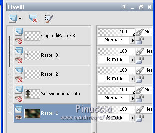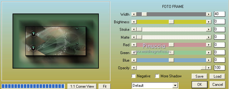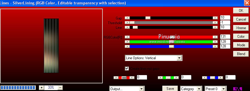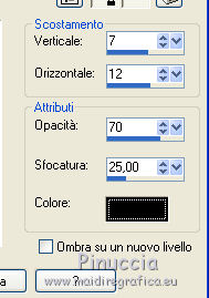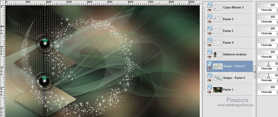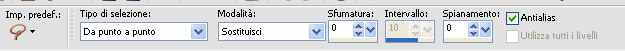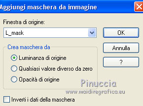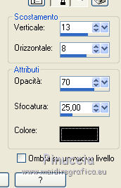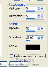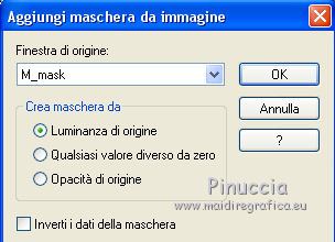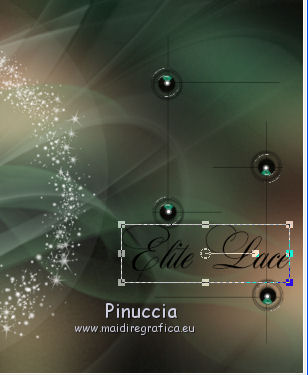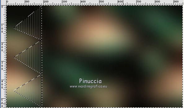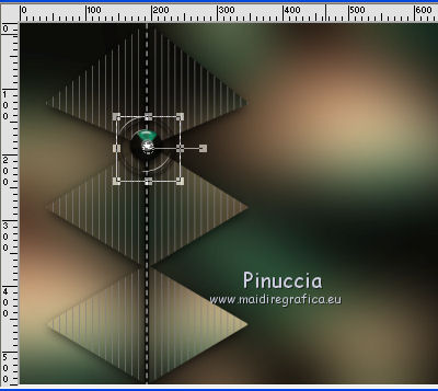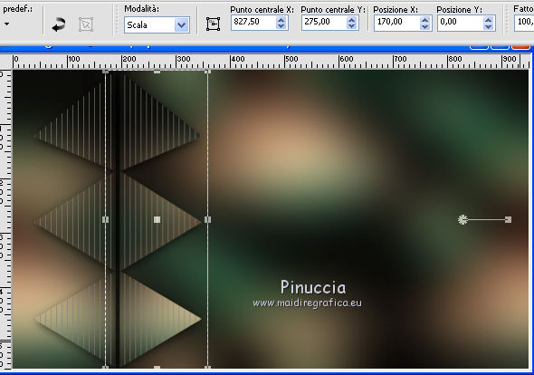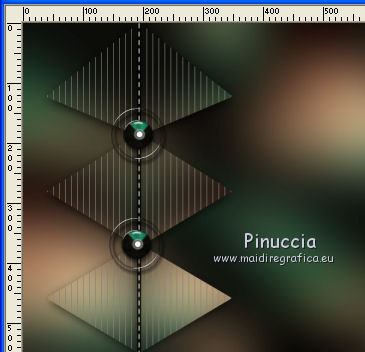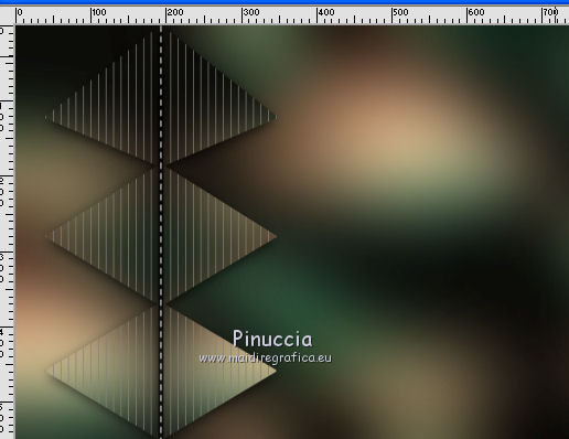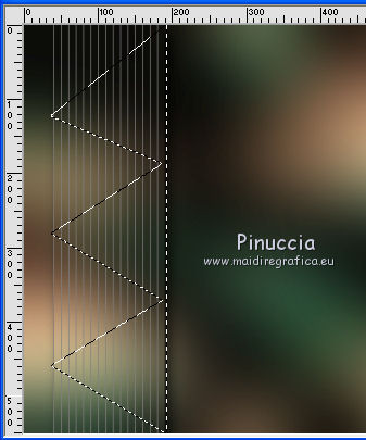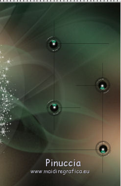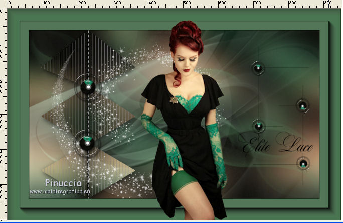 qui puoi trovare qualche risposta ai tuoi dubbi. Se l'argomento che ti interessa non è presente, ti prego di segnalarmelo. Questo tutorial è stato realizzato con Corel2018 e tradotto con Corel X, ma può essere realizzato anche con le altre versioni di PSP. Dalla versione X4, il comando Immagine>Rifletti è stato sostituito con Immagine>Capovolgi in orizzontale, e il comando Immagine>Capovolgi con Immagine>Capovolgi in verticale. Nelle versioni X5 e X6, le funzioni sono state migliorate rendendo disponibile il menu Oggetti. Con la nuova versione X7, sono tornati Rifletti>Capovolgi, ma con nuove varianti. Vedi la scheda sull'argomento qui traduzione in francese qui le vostre versioni qui Occorrente: Materiale qui Per il tube grazie sMart. Il resto del materiale è di Erina (in questa pagina trovi i links ai siti dei creatori di tubes) Filtri in caso di dubbi, ricorda di consultare la mia sezione filtri qui AP 01 Innovations - Lines SilverLining qui AAA Frames - Foto Frame qui ![]() non esitare a cambiare modalità di miscelatura e opacità secondo i colori utilizzati. Apri le maschere in PSP e minimizzale con il resto del materiale. 1. Apri una nuova immagine trasparente 950 x 550 pixels. Imposta il colore di primo piano con il colore nero #000000. Riempi l'immagine trasparente con il colore nero.2. Livelli>Nuovo livello raster. Selezione>Seleziona tutto. Apri il tube della donna, cancella il watermark e vai a Modifica>Copia. Minimizza il tube. Torna al tuo lavoro e vai a Modifica>Incolla nella selezione. Selezione>Deseleziona. 3. Effetti>Effetti di immagine>Motivo unico, con i settaggi standard. ![]() 4. Regola>Sfocatura>Sfocatura gaussiana - raggio 50. ![]() 5. Livelli>Unisci>Unisci giù. 6. Attiva lo strumento Selezione , rettangoloe traccia un rettangolo come nell'esempio: da 40 a 190 pixels: ![]() 7. Selezione>Innalza selezione a livello. 8. Effetti>Plugins>AP 01 Innovations - Lines SilverLining ![]() 9. Effetti>Effetti 3D>Sfalsa ombra. ![]() 10. Attiva lo strumento Selezione a mano libera ![]() ![]() e traccia le linee come nell'esempio ![]() 11. Selezione>Inverti. Premi sulla tastiera il tasto CANC ![]() ![]() Selezione>Deseleziona. 12. Effetti>Effetti 3D>Sfalsa ombra. ![]() 13. Livelli>Duplica. Immagine>Rifletti. Sposta la figura a sinistra,o attiva lo strumento Puntatore ![]() e imposta Posizione X a 170,00 ![]() Livelli>Unisci>Unisci giù. 14. Attiva lo strumento Penna , stile Linea Trattino, larghezza 2,![]() Imposta il colore di primo piano con il colore bianco. Traccia una linea verticale tra le due figure ![]() Livelli>Converti in livello raster. 15. Apri il tube Erina-button e vai a Modifica>Copia. Torna al tuo lavoro e vai a Modifica>Incolla come nuovo livello. Posiziona il tube come nell'esempioSe necessario, puoi ridurre il tube usando lo strumento Puntatore ![]() ![]() Livelli>Duplica. Sposta il bottone più in basso![]() 16. Attiva il livello inferiore Raster 1, e, per vedere meglio chiudi gli altri livelli ![]() 17. Apri Swirl_deco e vai a Modifica>Copia. Torna al tuo lavoro e vai a Modifica>Incolla come nuovo livello. Immagine>Ridimensiona, 2 volte al 90%, tutti i livelli non selezionato. Posiziona il tube a sinistra.![]() Abbassa l'opacità di questo livello al 50%. Livelli>Disponi>Sposta su ![]() 18. Attiva nuovamente il livello Raster 1. Imposta il colore di primo piano con un colore scuro del tube; per l'esempio #527658, e il colore di sfondo con un colore più chiaro; per l'esempio #bdd7c4. ![]() Livelli>Nuovo livello raster. Riempi con il colore scuro #527658.19. Livelli>Nuovo livello maschera>Da immagine Apri il menu sotto la finestra di origine e vedrai la lista dei files aperti. Seleziona la maschera M. ![]() Livelli>Unisci>Unisci gruppo. Abbassa l'opacità di questo livello al 50%. Effetti>Effetti 3D>Sfalsa ombra. ![]() 20. Livelli>Nuovo livello raster. Riempi con il colore chiaro #bdd7c4.Livelli>Nuovo livello maschera>Da immagine Apri il menu sotto la finestra di origine e seleziona la maschera L. ![]() Livelli>Unisci>Unisci gruppo. Abbassa l'opacità di questo livello al 50%. Effetti>Effetti 3D>Sfalsa ombra. ![]() 21. Livelli>Visualizza>Tutto. ![]() 22. Attiva il livello superiore. Attiva lo strumento Penna , stile linea Pieno, larghezza 1,![]() Traccia delle linee orizzontali e verticali come mostrato nell'esempio: premi il tasto della maiuscola per avere delle linee perfettamente diritte. ![]() Livelli>Converti in livello raster. 23. Attiva nuovamente il tube Erina_button e vai a Modifica>Copia. Torna al tuo lavoro e vai a Modifica>Incolla come nuovo livello. Riduci il tube con lo strumento Puntatore ![]() (per il mio esempio ho ridimensionato il tube al 50%). Effetti>Effetti 3D>Sfalsa ombra, con i settaggi precedenti. ![]() Livelli>Duplica, e posiziona correttamente i bottoni.![]() 24. Assicurati di essere posizionato sul livello superiore. Livelli>Unisci>Unisci giù - 2 volte. Livelli>Duplica. Immagine>Capovolgi. Immagine>Rifletti. Posiziona correttamente il duplicato![]() 25. Apri il file di testo e vai a Modifica>Copia. Torna al tuo lavoro e vai a Modifica>Incolla come nuovo livello. Spostalo in basso a destra.![]() 26. Immagine>Aggiungi bordatura, 1 pixel, simmetriche, colore nero. Selezione>Seleziona tutto. Immagine>Aggiungi bordatura, 70 pixels, simmetriche, colore scuro #527658. Selezione>Inverti. Effetti>Plugins>AAA Frames - Foto Frame. ![]() 27. Immagine>Ridimensiona, 950 pixels di larghezza, tutti i livelli selezionato. 28. Attiva nuovamente il tube della donna e vai a Modifica>Copia. Torna al tuo lavoro e vai a Modifica>Incolla come nuovo livello. Immagine>Ridimensiona, al 120%, tutti i livelli non selezionato. Posiziona correttamente il tube.![]() Effetti>Effetti 3D>Sfalsa ombra. ![]() 29. Firma il tuo lavoro su un nuovo livello. Livelli>Unisci>Unisci tutto e salva in formato jpg. ![]() Puoi scrivermi se hai problemi o dubbi, o trovi un link che non funziona, o soltanto per un saluto. 5 agosto 2019 |