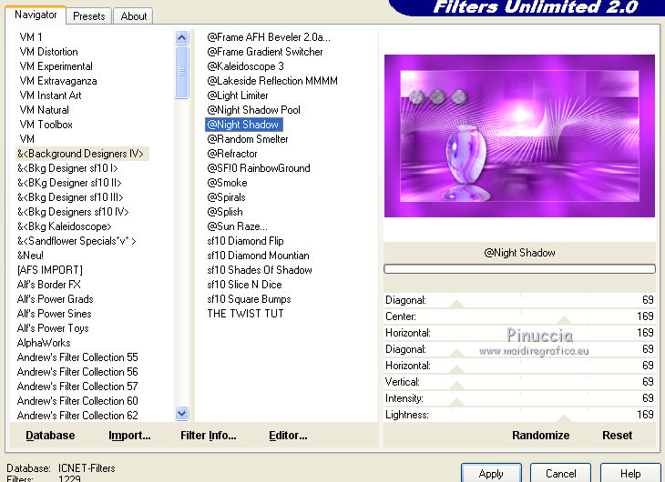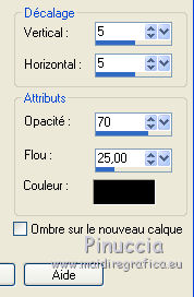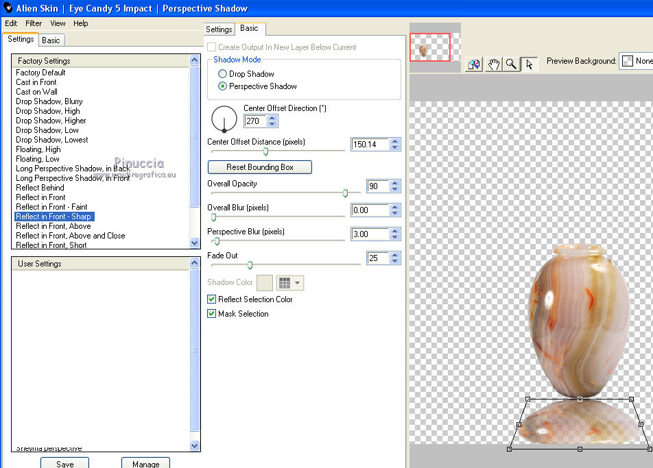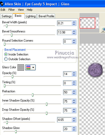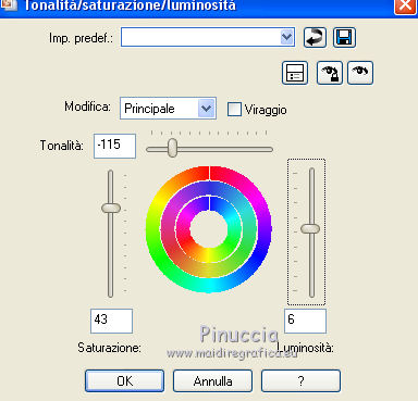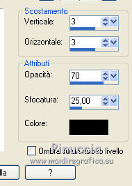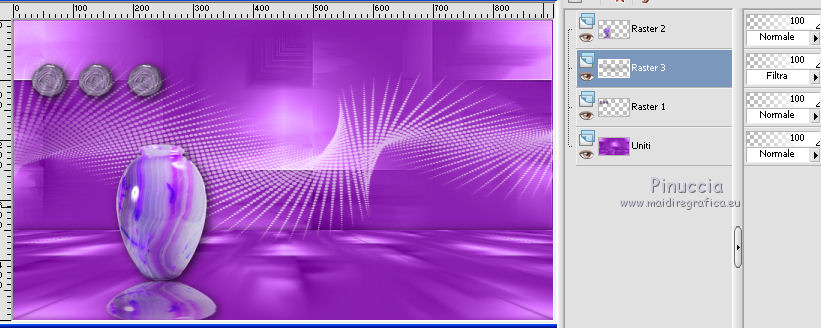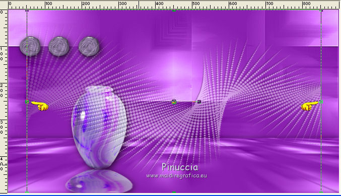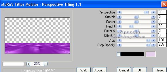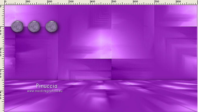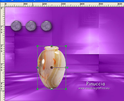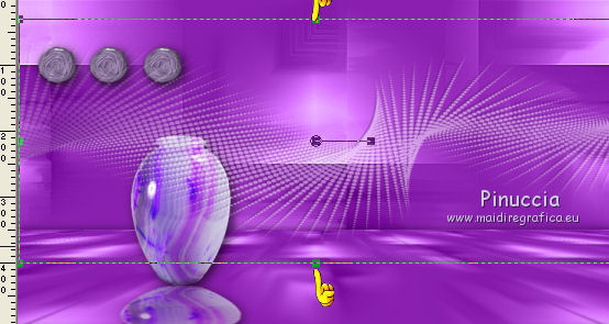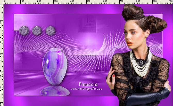 qui puoi trovare qualche risposta ai tuoi dubbi. Se l'argomento che ti interessa non è presente, ti prego di segnalarmelo. Questo tutorial è stato realizzato con Corel2018 e tradotto con Corel X, ma può essere realizzato anche con le altre versioni di PSP. Dalla versione X4, il comando Immagine>Rifletti è stato sostituito con Immagine>Capovolgi in orizzontale, e il comando Immagine>Capovolgi con Immagine>Capovolgi in verticale. Nelle versioni X5 e X6, le funzioni sono state migliorate rendendo disponibile il menu Oggetti. Con la nuova versione X7, sono tornati Rifletti>Capovolgi, ma con nuove varianti. Vedi la scheda sull'argomento qui traduzione in francese qui le vostre versioni qui Occorrente: Materiale qui Il resto del materiale è di Erina (in questa pagina trovi i links ai siti dei creatori di tubes) Filtri in caso di dubbi, ricorda di consultare la mia sezione filtri qui Filters Unlimited 2.0 qui Alien Skin Eye Candy 5 Impact - Perspective Shadow, Glass qui Mura's Meister - Perspective Tiling qui &<Background Designer IV> - @Nigh Shadow (da importare in Unlimited) qui ![]() non esitare a cambiare modalità di miscelatura e opacità secondo i colori utilizzati. 1. Apri una nuova immagine trasparente 900 x 500 pixels. Scegli dal tuo tube un colore scuro e un colore chiaro. Per il mio esempio: colore di primo piano #8a20b0 colore di sfondo #e6d1ed. ![]() Riempi l'immagine trasparente con il colore scuro.2. Apri la maschera "Maswk" e vai a Modifica>Copia. Torna al tuo lavoro e vai a Modifica>Incolla come nuovo livello. Cambia la modalità di miscelatura di questo livello in Luminanza (esistente). Effetti>Effetti di bordo>Aumenta. Livelli>Unisci>Unisci giù. 3. Livelli>Duplica. Regola>Sfocatura>Sfocatura gaussiana - raggio 6. ![]() 4. Effetti>Plugins>Mura's Meister - Perspective Tiling. ![]() 5. Effetti>Effetti 3D>Sfalsa ombra, colore nero. ![]() 6. Livelli>Unisci>Unisci visibile. 7. Apri Rose Deco e vai a Modifica>Copia. Torna al tuo lavoro e vai a Modifica>Incolla come nuovo livello. Regola>Tonalità e saturatione>Tonalità/Saturazione/Luminosità. ![]() adatta i settaggi ai tuoi colori 8. Immagine>Ridimensiona, al 16%, tutti i livelli non selezionato. Effetti>Effetti di immagine>Scostamento. ![]() 9. Effetti>Plugins>Alien Skin Eye Candy 5 Impact - Glass. ![]() 10. Effetti>Effetti 3D>Sfalsa ombra, colore nero. ![]() 11. Livelli>Duplica - 2 volte, e posiziona correttamente le rose.![]() Assicurati di essere posizionato sul livello superiore. Livelli>Unisci>Unisci giù - 2 volte, per avere le rose su un solo livello. 12. Apri il tube del vaso e vai a Modifica>Copia. Torna al tuo lavoro e vai a Modifica>Incolla come nuovo livello. Immagine>Ridimensiona, al 70%, tutti i livelli non selezionato. Sposta il vaso a sinistra.![]() 25. Effetti>Plugins>Alien Skin Eye Candy 5 Impact - Perspective Shadow. adatta i settaggi alla posizione del tuo tube. Per l'esempio: Reflect in Front-Sharp ![]() Regola>Tonalità e Saturatione>Tonalità/Saturazione/Luminosità, con i settaggi precedenti. ![]() 26. Effetti>Effetti 3D>Sfalsa ombra, colore nero. ![]() 27. Apri Swirl e vai a Modifica>Copia. Torna al tuo lavoro e vai a Modifica>Incolla come nuovo livello. Immagine>Capovolgi. 28. Attiva lo strumento Puntatore ![]() e tira i nodi a destra e a sinistra fino ai bordi ![]() e con i nodi in alto e in basso stringi il tube nella barra centrale. ![]() 29. Effetti>Effetti 3D>Sfalsa ombra, colore nero. ![]() Cambia la modalità di miscelatura di questo livello in Filtra. Livelli>Disponi>Sposta giù (sotto il livello del vaso) ![]() 30. Immagine>Aggiungi bordatura, 1 pixel, simmetriche, colore chiaro #e6d1ed. Selezione>Seleziona tutto. Immagine>Aggiungi bordatura, 60 pixels, simmetriche, colore scuro #8a20b0. Selezione>Inverti. Effetti>Plugins>Filters Unlimited 2.0 - &<Background Designer IV> - @Nigh Shadow. ![]() Selezione>Deseleziona. 31. Apri il tube della donna, cancella il watermark, e vai a Modifica>Copia. Torna al tuo lavoro e vai a Modifica>Incolla come nuovo livello. Immagine>Ridimensiona, all'80%, tutti i livelli non selezionato. Spostalo a destra.![]() Effetti>Effetti 3D>Sfalsa ombra, colore nero. ![]() 32. Firma il tuo lavoro su un nuovo livello. Livelli>Unisci>Unisci tutto e salva in formato jpg. ![]() ![]() Puoi scrivermi se hai problemi o dubbi, o trovi un link che non funziona, o soltanto per un saluto. 5 Agosto 2019 |