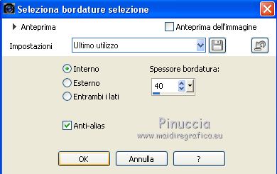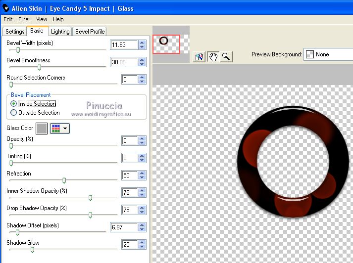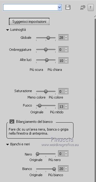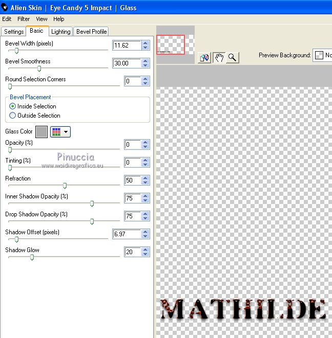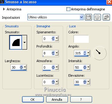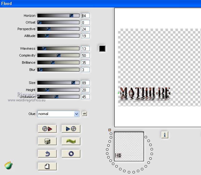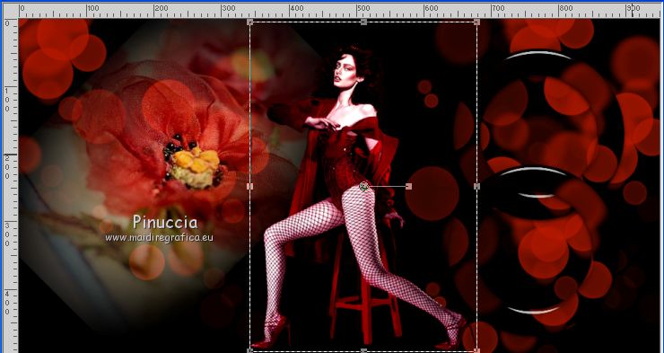 qui puoi trovare qualche risposta ai tuoi dubbi. Se l'argomento che ti interessa non è presente, ti prego di segnalarmelo. Questo tutorial è stato tradotto con Corel X e CorelX2, ma può essere realizzato anche con le altre versioni di PSP. Dalla versione X4, il comando Immagine>Rifletti è stato sostituito con Immagine>Capovolgi in orizzontale, e il comando Immagine>Capovolgi con Immagine>Capovolgi in verticale. Nelle versioni X5 e X6, le funzioni sono state migliorate rendendo disponibile il menu Oggetti. Con la nuova versione X7, sono tornati Rifletti>Capovolgi, ma con nuove varianti. Vedi la scheda sull'argomento qui traduzione in francese qui le vostre versioni qui Occorrente: Un tube a scelta. Il resto del materiale qui Per il tube grazie Suizabella. (in questa pagina trovi i links ai siti dei creatori di tubes) Filtri in caso di dubbi, ricorda di consultare la mia sezione filtri qui Alien Skin Eye Candy 5 Impact - Glass, Perspective Tiling qui Flaming Pear - Flood ici ![]() non esitare a cambiare modalità di miscelatura e opacità secondo i colori utilizzati. Metti il pennello nella cartella Pennelli. Attenzione, il pennello è composto da due files che non devono essere separati. Vedi gli appunti sui pennelli qui Se hai problemi con il pennello, Apri il file in jpg del pennello ed esportalo con la tua versione di PSP: File>Esporta>Pennello personalizzato, assegna un nome al pennello e ok. Se stai usando una versione meno recente, riceverai questo messaggio ![]() In questo caso, prima di esportare il pennello, dovrai ridimensionare il file secondo la tua versione di PSP (fino alla versione PSPX la dimensione massima è di 500 pixels; da PSP11 a PSPX7 la dimensione massima consentita è di 999 pixels; in seguito è passata a 1200 pixels fino ai 1500 pixels delle ultime versioni. 1. Apri una nuova immagine trasparente 950 x 500 pixels. Imposta il colore di primo piano con il colore rosso #e32400, e il colore di sfondo con il colore nero #000000. ![]() Riempi l'immagine trasparente con il colore nero.2. Livelli>Nuovo livello raster. Attiva lo strumento Pennello ![]() cerca e seleziona il pennello Dotti2 - e adatta la dimensione alla tua versione di PSP. ![]() Applica il pennello una volta a sinistra e una volta a destra, pressappoco come nell'esempio. ![]() 3. Livelli>Unisci>Unisci giù. 4. Apri il tube smArt deco, e vai a Modifica>Copia. Torna al tuo lavoro e vai a Modifica>Incolla come nuovo livello. Immagine>Ruota per gradi - 45 gradi a destra. ![]() Posiziona / correttamente il tube.![]() 5. Attiva il livello inferiore, Raster 1. Modifica>Copia. Modifica>Incolla come nuova immagine, e continua su questa immagine. Attiva lo strumento Selezione , cerchio![]() Traccia un cerchio pressappoco come nell'esempio. ![]() Selezione>Modifica>Seleziona bordature selezione. ![]() Selezione>Innalza selezione a livello. Chiudi il livello inferiore. ![]() Effetti>Plugins>Alien Skin Eye Candy 5 Impact - Glass. ![]() Selezione>Deseleziona. 6. Modifica>Copia. Torna al tuo lavoro, attiva il livello superiore e vai a Modifica>Incolla come nuovo livello. Livelli>Duplica. Posiziona / correttamente le immaginiAssicurati di essere posizionato sul livello superiore. Livelli>Unisci>Unisci giù. ![]() 7. Apri il tuo tube e vai a Modifica>Copia. Torna al tuo lavoro e vai a Modifica>Incolla come nuovo livello. Immagine>Ridimensiona, se e quanto necessario, tutti i livelli non selezionato. Posiziona / il tube al centro![]() 8. Effetti>Plugins>Alien Skin Eye Candy 5 Impact - Perspective Shadow. Preset Reflect in Front con i seguenti settaggi ![]() 9. Colori della tua paletta. ![]() Attiva lo strumento Testo , font Neurotoxin,dimensione 20 punti, pennellata 1 ![]() Scrivi Mathilde in basso a sinistra. ![]() Livelli>Converti in livello Raster Effetti>Effetti 3D>Smusso a incasso. ![]() Effetti>Plugins>Alien Skin Eye Candy 5 Impact - Glass ![]() Ora le lettere sono diventate un po' più scure, ma le schiariremo: Regola>Correzione fotografica intelligente ![]() Posiziona / correttamente il testo![]() Effetti>Plugins>Flaming Pear - Flood ![]() Firma il tuo lavoro su un nuovo livello. Aggiungi, se vuoi, il watermark dell'autore; in questo caso, non dimenticare il watermark del traduttore. Livelli>Unisci>Unisci tutto e salva in formato jpg. Versione con tubes di Luz Cristina e Cal ![]() ![]() Puoi scrivermi se hai problemi o dubbi, o trovi un link che non funziona, o soltanto per un saluto. 1 Aprile 2021 |
