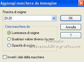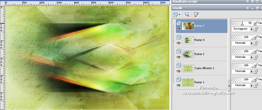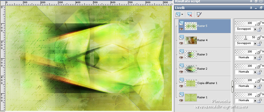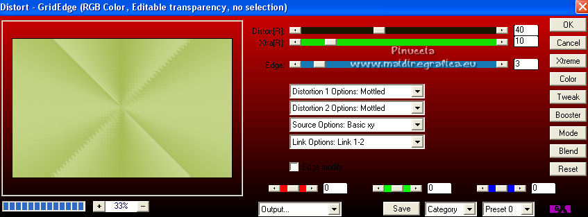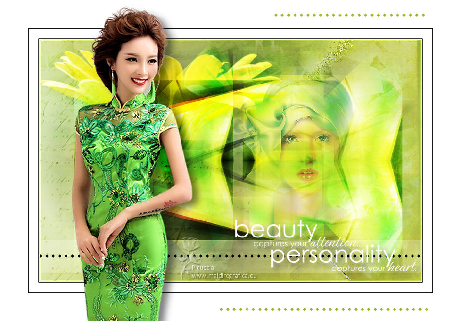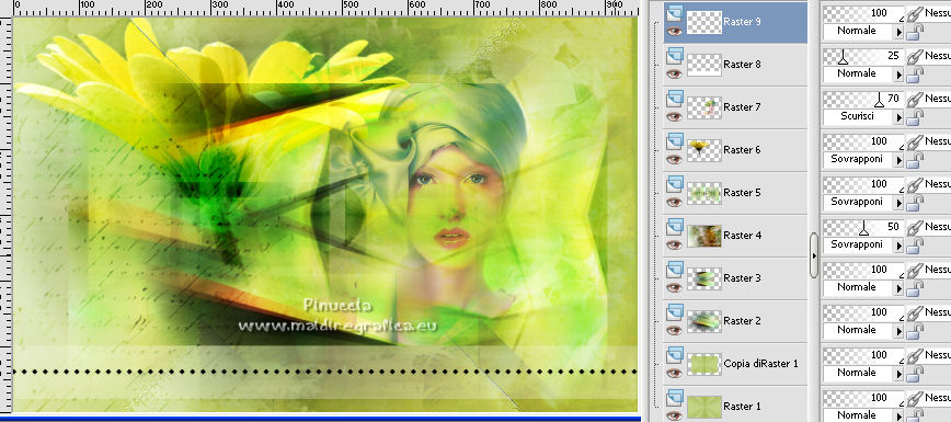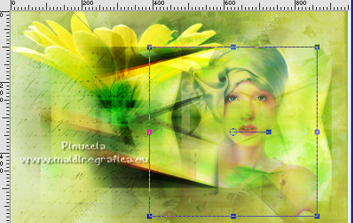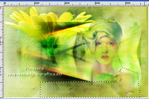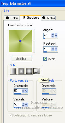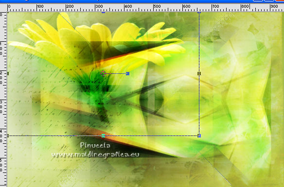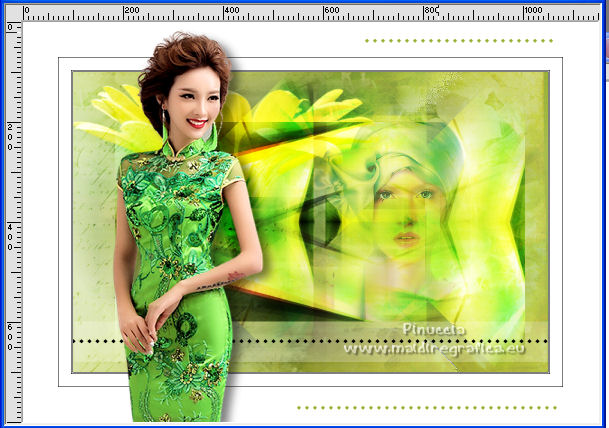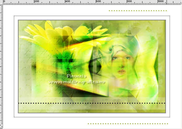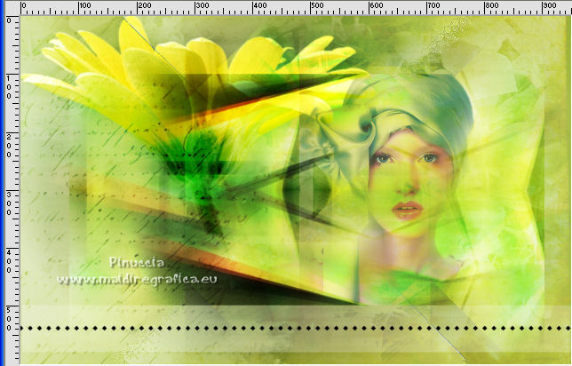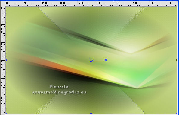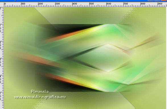 qui puoi trovare qualche risposta ai tuoi dubbi. Se l'argomento che ti interessa non è presente, ti prego di segnalarmelo. Questo tutorial è stato tradotto con Corel X e CorelX2, ma può essere realizzato anche con le altre versioni di PSP. Dalla versione X4, il comando Immagine>Rifletti è stato sostituito con Immagine>Capovolgi in orizzontale, e il comando Immagine>Capovolgi con Immagine>Capovolgi in verticale. Nelle versioni X5 e X6, le funzioni sono state migliorate rendendo disponibile il menu Oggetti. Con la nuova versione X7, sono tornati Rifletti>Capovolgi, ma con nuove varianti. Vedi la scheda sull'argomento qui traduzione in francese qui le vostre versioni quiOccorrente: Materiale qui Per i tube grazie SMart e Patry. Il resto del materiale è di Erina. (in questa pagina trovi i links ai siti dei creatori di tubes) Filtri in caso di dubbi, ricorda di consultare la mia sezione filtri qui AP 16 - Distort qui ![]() non esitare a cambiare modalità di miscelatura e opacità secondo i colori utilizzati. Nelle ultime versioni di PSP non c'è il gradiente di primo piano/sfondo (Corel_06_029) Puoi usare i gradienti delle versioni precedenti. Trovi qui i gradienti Corel X. Apri la maschera in PSP e minimizzala con il resto del materiale. 1. Apri una nuova immagine trasparente 950 x 600 pixels. Imposta il colore di primo piano con #d0db9b, e il colore di sfondo con il colore #9bae3e. ![]() Passa il colore di primo piano a Gradiente di primo piano/sfondo, stile Radiale. ![]() Riempi l'immagine trasparente con il gradiente.2. Effetti>Effetti di bordo>Aumenta. 3. Effetti>Effetti di riflesso>Specchio rotante, con i settaggi standard. ![]() 4. Livelli>Duplica. Immagine>Capovolgi. Abbassa l'opacità di questo livello al 50%. Livelli>Unisci>Unisci giù. 5. Effetti>Plugins>AP16 [Power Blend] - Distort-GridEdge ![]() Effetti>Effetti di bordo>Aumenta. 6. Livelli>Duplica. Immagine>Ridimensiona, al 78%, tutti i livelli non selezionato. 7. Apri l'immagine in jpg green_dark_lines_light_Abstract. Livelli>Innalza livello di sfondo. Livelli>Nuovo livello maschera>Da immagine. Apri il menu sotto la finestra di origine e vedrai la lista dei files aperti. Seleziona la maschera 20-20. ![]() Livelli>Unisci>Unisci gruppo. 8. Modifica>Copia. Torna al tuo lavoro e vai a Modifica>Incolla come nuovo livello. Attiva lo strumento Puntatore ![]() modalità Scala ![]() e tira i nodi centrali fino ai bordi ![]() 9. Apri il tube GreenDark.png e vai a Modifica>Copia. Torna al tuo lavoro e vai a Modifica>Incolla come nuovo livello. ![]() 10. Livelli>Nuovo livello raster. Selezione>Seleziona tutto. Apri texture_74.jpg e vai a Modifica>Copia. Torna al tuo lavoro e vai a Modifica>Incolla nella selezione. Selezione>Deseleziona. Cambia la modalità di miscelatura di questo livello in Sovrapponi, e abbassa l'opacità al 50%. ![]() 11. Apri il tube 1_dekort e vai a Modifica>Copia. Torna al tuo lavoro e vai a Modifica>Incolla come nuovo livello. Cambia la modalità di miscelatura di questo livello in Sovrapponi. ![]() 12. Apri il tube Yellow_flower e vai a Modifica>Copia. Torna al tuo lavoro e vai a Modifica>Incolla come nuovo livello. Cambia la modalità di miscelatura di questo livello in Sovrapponi. Con lo strumento Puntatore ![]() sposta il tube in alto a sinistra ![]() 13. Apri il tube PatryMists_Fleurs, e vai a Modifica>Copia. Torna al tuo lavoro e vai a Modifica>Incolla come nuovo livello. Spostalo in basso a destra.Cambia la modalità di miscelatura di questo livello in Scurisci, e abbassa l'opacità al 70%. ![]() Attiva lo strumento Selezione a mano libera ![]() e seleziona la parte del tube che non deve essere visibile (se preferisci, puoi anche usare lo strumento Gomma .![]() Se usi la Selezione, premi sulla tastiera il tasto CANC ![]() Selezione>Deseleziona. 14. Imposta il colore di primo piano con il colore bianco #ffffff. Attiva lo strumento Selezione , rettangolo,e traccia un rettangolo in basso, come nell'esempio. ![]() Riempi la selezione con il colore bianco.Abbassa l'opacità di questo livello al 25%. 15. Attiva lo strumento Penna ,stile di linea Rombo, dimensione 8 pixels. ![]() Imposta il colore di primo piano con il colore nero #000000. Tenendo premuto il tasto della maiuscola, traccia una linea in mezzo alla striscia bianca. ![]() Livelli>Converti in livello raster. ![]() 16. Attiva nuovamente il tube 1_dekort e vai a Modifica>Copia. Torna al tuo lavoro e vai a Modifica>Incolla come nuovo livello. Cambia la modalità di miscelatura di questo livello in Sovrapponi. 17. Immagine>Aggiungi bordatura, 1 pixel, simmetriche, colore #000000. Immagine>Aggiungi bordatura, 2 pixels, simmetriche, colore #ffffff. Immagine>Aggiungi bordatura, 1 pixel, simmetriche, colore #000000. Immagine>Aggiungi bordatura, 25 pixels, simmetriche, colore #ffffff. Immagine>Aggiungi bordatura, 1 pixel, simmetriche, colore #000000. Immagine>Aggiungi bordatura, 70 pixels, simmetriche, colore #ffffff. 18. Attiva nuovamente lo strumento Penna , con i settaggi precedenti.![]() Imposta il colore di primo piano con #98b534. Traccia due linee sui bordi in alto e in basso a destra ![]() Livelli>Converti in livello raster. 19. Apri il tube della donna e vai a Modifica>Copia. Torna al tuo lavoro e vai a Modifica>Incolla come nuovo livello. Per il mio esempio: Immagine>Ridimensiona, 1 volta al 150% e una volta al 120%, tutti i livelli non selezionato. Sposta il tube a sinistra.![]() Effetti>Effetti 3D>Sfalsa ombra, colore nero. ![]() 20. Apri il wordart Beauty_feliratot e vai a Modifica>Copia. Torna al tuo lavoro e vai a Modifica>Incolla come nuovo livello. Spostalo in basso a destra.![]() Facoltativo: Immagine>Immagine negativa. Effetti>Effetti 3D>Sfalsa ombra, colore nero. ![]() 21. Immagine>Ridimensiona, a 950 pixels di larghezza, tutti i livelli selezionato. Aggiungi, se vuoi, i watermark dell'autore e del traduttore. Firma il tuo lavoro e salva in formato jpg. Versione con tubes di Anna.br. ![]() ![]() Puoi scrivermi se hai problemi o dubbi, o 