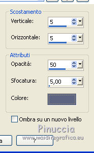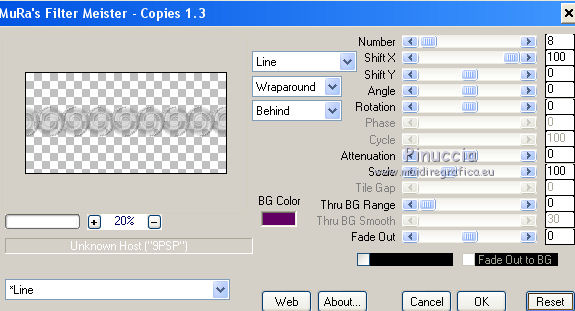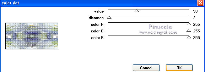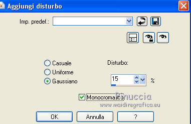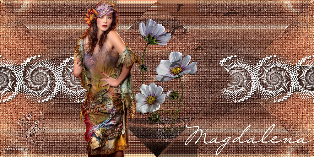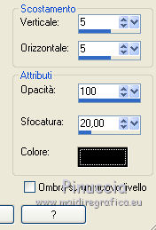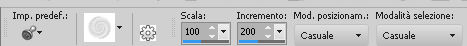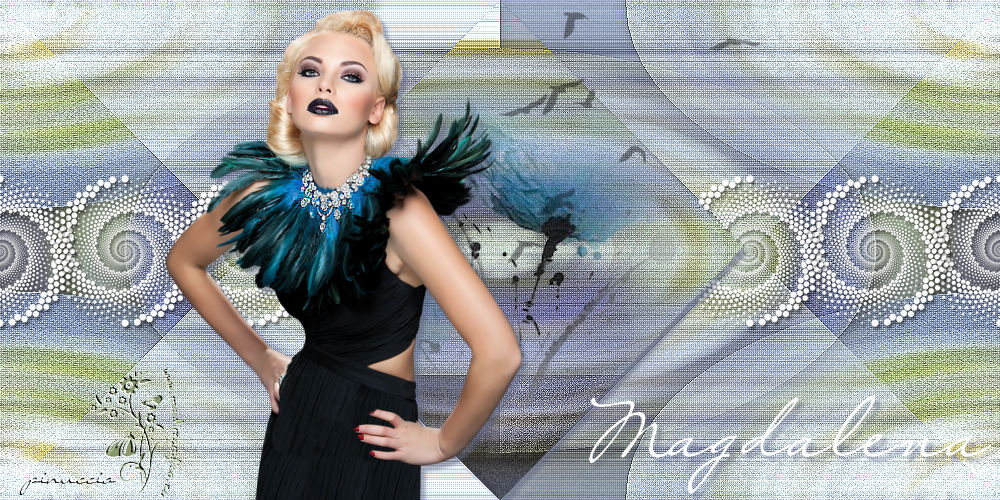 qui puoi trovare qualche risposta ai tuoi dubbi. Se l'argomento che ti interessa non è presente, ti prego di segnalarmelo. Questo tutorial è stato realizzato con Corel2018 e tradotto con Corel X, ma può essere realizzato anche con le altre versioni di PSP. Dalla versione X4, il comando Immagine>Rifletti è stato sostituito con Immagine>Capovolgi in orizzontale, e il comando Immagine>Capovolgi con Immagine>Capovolgi in verticale. Nelle versioni X5 e X6, le funzioni sono state migliorate rendendo disponibile il menu Oggetti. Con la nuova versione X7, sono tornati Rifletti>Capovolgi, ma con nuove varianti. Vedi la scheda sull'argomento qui Occorrente: Un tube a scelta. Il resto del materiale qui Il tube usato è di Maryse Filtri in caso di dubbi, ricorda di consultare la mia sezione filtri qui Filters Unlimited 2.0 qui Penta.com - Color dot qui Mura's Meister - Copies qui Mura's Meister - Perspective Tiling qui Simple - Pizza Slice Mirror qui I filtri Penta.com si possono usare da soli o importati in Filters Unlimited (come fare vedi qui) Se un filtro fornito appare con questa icona ![]() Apri i file "decor" e "uccelli" ed esportali come Ornamento (File>Esporta>Ornamento) Apri il file di testo "magdalena" ed esportalo come pennello (file>Esporta>Pennello personalizzato). 1. Apri una nuova immagine trasparente 1000 x 500 pixels. 2. Selezione>Seleziona tutto. Apri una delle immagini in jpg (per il mio esempio ho scelto l'immagine n.3) e vai a Modifica>Copia. Torna al tuo lavoro e vai a Modifica>Incolla nella selezione. Selezione>Deseleziona. 3. Regola>Sfocatura>Sfocatura radiale. ![]() 4. Effetti>Effetti di riflesso>Specchio rotante, con i settaggi standard. ![]() Risultato ![]() Il risultato sarà diverso secondo l'immagine usata per cominciare. 5. Immagine>Capovolgi. Puoi saltare il passaggio, in base al tuo risultato. Per l'immagine usata, non è stato necessario. Con l'immagine 5, invece sì. ![]() Livelli>Duplica. 6. Regola>Aggiungi/Rimuovi disturbo>Aggiungi disturbo. ![]() 7. Attiva lo strumento Selezione , Ellisse,![]() e traccia un'ellisse al centro dell'immagine ![]() Livelli>Unisci>Unisci giù. Selezione>Innalza selezione a livello. Selezione>Deseleziona. 8. Effetti>Effetti 3D>Sfalsa ombra. ![]() 9. Effetti>Effetti di immagine>Motivo unico, con i settaggi standard. ![]() 10. E' attivo il livello Selezione innalzata. Effetti>Plugins>Simple - Pizza Slice Mirror. Livelli>Duplica. Immagine>Rifletti. Abbassa l'opacità di questo livello al 50%. Livelli>Unisci>Unisci giù. 11. Effetti>Effetti 3D>Sfalsa ombra. ![]() Effetti>Effetti di bordo>Aumenta. 12. Effetti>Plugins>Penta.com - Color Dot, con i settaggi standard. ![]() 13. Apri il tube del fiore e vai a Modifica>Copia. Torna al tuo lavoro e vai a Modifica>Incolla come nuovo livello. Immagine>Ridimensiona, al 130%, tutti i livelli non selezionato. Posiziona correttamente il tube al centro.14. Livelli>Nuovo livello raster. Attiva lo strumento Ornamento ![]() Cerca e seleziona l'ornamento degli uccelli ![]() e applica l'ornamento in alto a destra ![]() Abbassa l'opacità di questo livello al 40%. 15. Livelli>Nuovo livello raster. Cerca l'ornamento decor ![]() e applicalo al centro dell'immagine. 16. Effetti>Plugins>Mura's Meister - Copies. ![]() 17. Attiva lo strumento Selezione a mano libera ![]() ![]() e traccia una selezione del rombo centrale ![]() Sei sempre sul livello dell'ornamento. Premi sulla tastiera il tasto CANC ![]() Effetti>Effetti 3D>Sfalsa ombra, colore #5d6481. ![]() Selezione>Deseleziona. 18. Imposta il colore di primo piano con un colore scelto dal tuo lavoro. Livelli>Nuovo livello raster. Attiva lo strumento Pennello ![]() cerca e seleziona il pennello Magdalena e applicalo in basso a destra con il tuo colore. se preferisci, puoi semplicemente copiare/incollare come nuovo livello il file fornito. 19. Effetti>Effetti 3D>Sfalsa ombra, con i settaggi precedenti. ![]() 20. Apri il tube della donna e vai a Modifica>Copia. Torna al tuo lavoro e vai a Modifica>Incolla come nuovo livello. Posiziona correttamente il tube.Effetti>Effetti 3D>Sfalsa ombra, con i settaggi precedenti. ![]() 21. Firma il tuo lavoro. Livelli>Unisci>Unisci tutto e salva in formato jpg. Versione con l'immagine n. 5. Il tube è di Mina ![]() ![]() Le vostre versioni. Grazie ![]() Marygraphics ![]() Olimpia ![]() Puoi scrivermi se hai problemi o dubbi, o trovi un link che non funziona, o soltanto per un saluto. 4 Novembre 2017 |