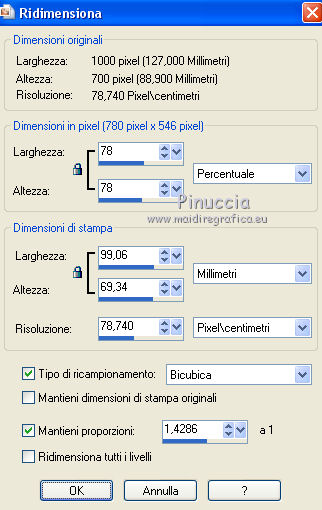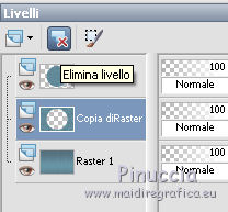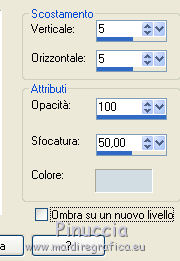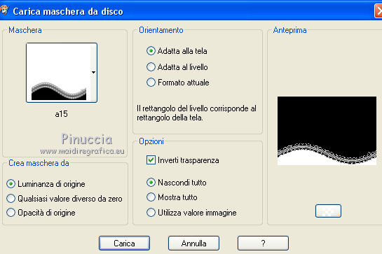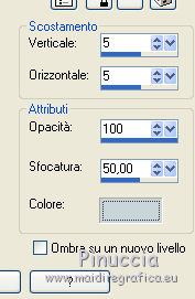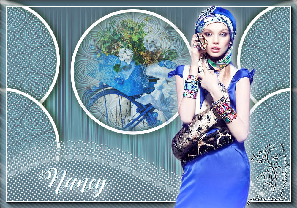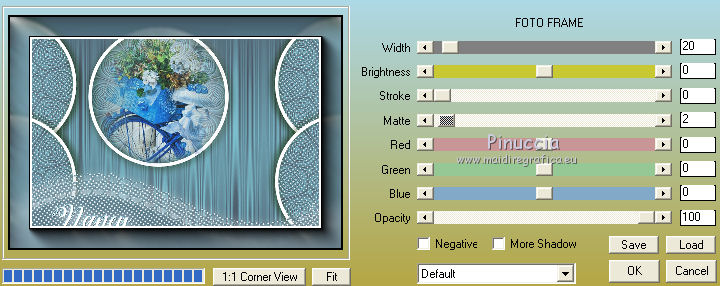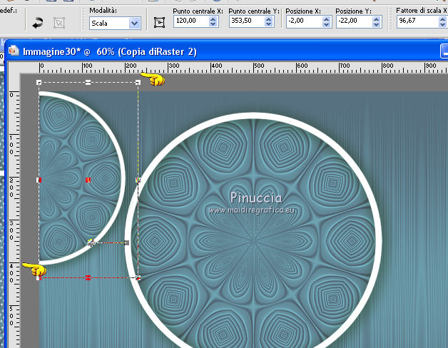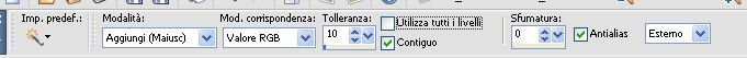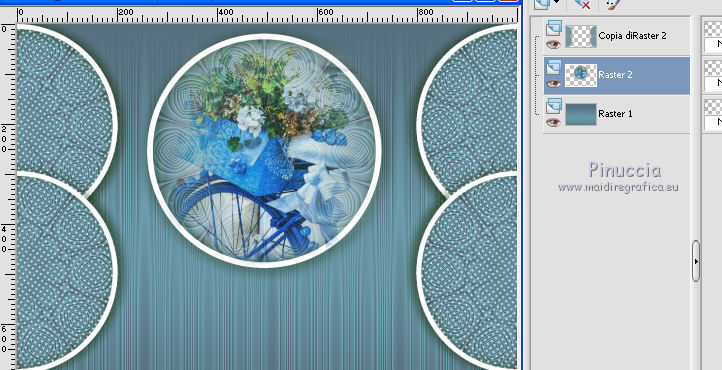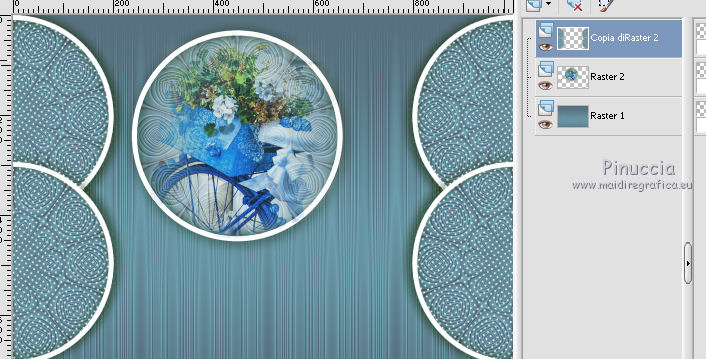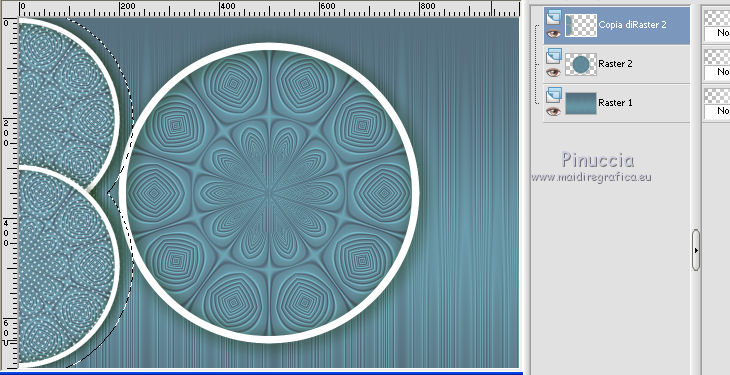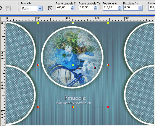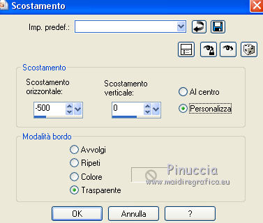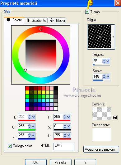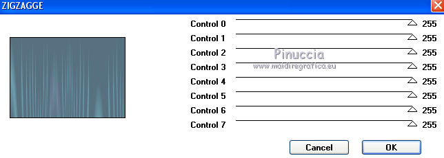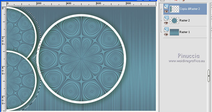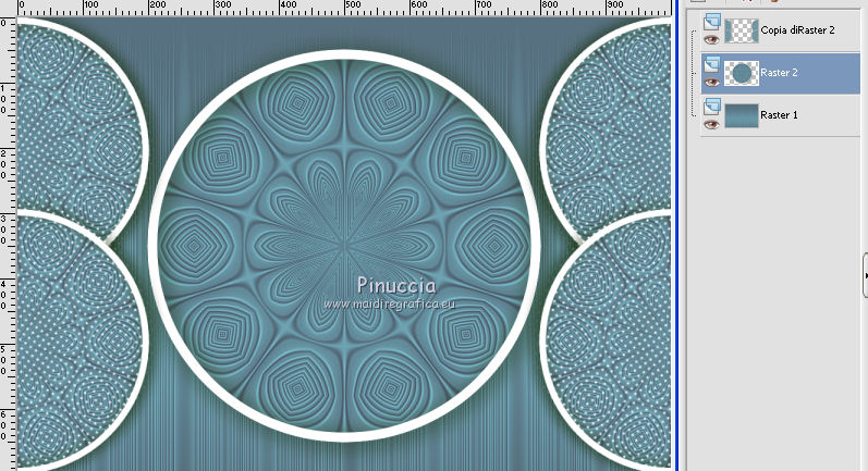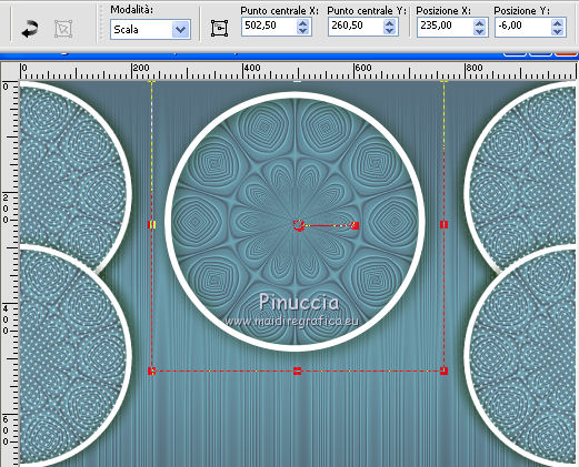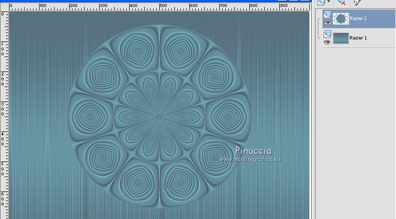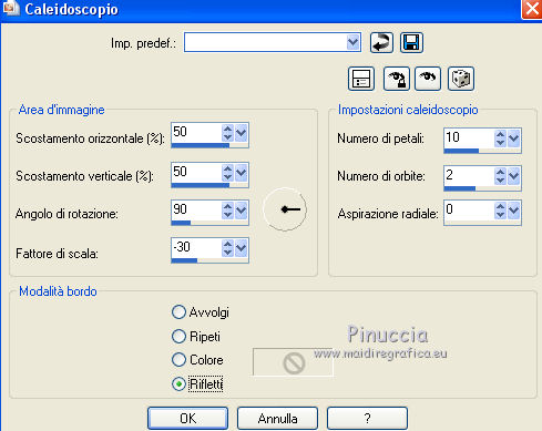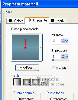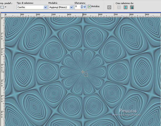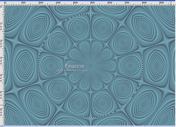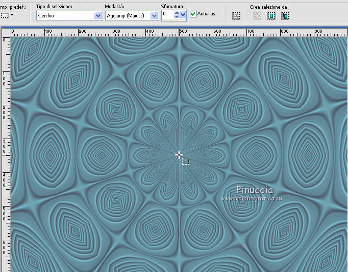 qui puoi trovare qualche risposta ai tuoi dubbi. Se l'argomento che ti interessa non è presente, ti prego di segnalarmelo. Questo tutorial è stato realizzato con Corel19 e tradotto con Corel X, ma può essere realizzato anche con le altre versioni di PSP. Dalla versione X4, il comando Immagine>Rifletti è stato sostituito con Immagine>Capovolgi in orizzontale, e il comando Immagine>Capovolgi con Immagine>Capovolgi in verticale. Nelle versioni X5 e X6, le funzioni sono state migliorate rendendo disponibile il menu Oggetti. Con la nuova versione X7, sono tornati Rifletti>Capovolgi, ma con nuove varianti. Vedi la scheda sull'argomento qui Occorrente: Un tube a scelta Il resto del materiale qui Il tube della donna è di Mina. Filtri in caso di dubbi, ricorda di consultare la mia sezione filtri qui Sybia qui AAA Frames - Foto Frame qui Filters Unlimited 2.0 qui I filtri Sybia si possono usare da soli o importati in Filters Unlimited (come fare vedi qui) Se un filtro fornito appare con questa icona ![]() non esitare a cambiare modalità di miscelatura e opacità secondo i colori utilizzati. Nelle ultime versioni di PSP non c'è il gradiente di primo piano/sfondo (Corel_06_029) Puoi usare i gradienti delle versioni precedenti. Trovi qui i gradienti Corel X. Metti la maschera nella cartella Maschere. 1. Apri una nuova immagine trasparente 1000 x 700 pixels. 2. Imposta il colore di primo piano con #577180, e il colore di sfondo con #6c9ead. ![]() Passa il colore di primo piano a Gradiente di primo piano/sfondo, stile Lineare. ![]() Riempi l'immagine trasparente con il gradiente.3. Effetti>Plugins>Sybia - Zigzagge ![]() Effetti>Effetti di bordo>Aumenta. 4. Livelli>Duplica. Effetti>Effetti di riflesso>Caleidoscopio. ![]() 5. Attiva lo strumento Selezione , cerchio,e, partendo dal centro ![]() traccia un cerchio come nell'esempio ![]() ![]() 6. Modifica>Taglia (questo comando, oltre a tagliare tiene anche in memoria) Selezione>Deseleziona. Modifica>Incolla come nuovo livello. 7. Attiva il livello sottostante ed eliminalo ![]() 8. Attiva il livello superiore. ![]() 9. Selezione>Seleziona tutto. Selezione>Mobile. Selezione>Immobilizza. 10. Imposta il colore di primo piano con il colore bianco #ffffff. Livelli>Nuovo livello raster. Riempi la selezione con il colore bianco.11. Selezione>Modifica>Contrai - 15 pixels. ![]() Premi sulla tastiera il tasto CANC ![]() Selezione>Deseleziona. 12. Effetti>Effetti 3D>Sfalsa ombra. ![]() 13.Livelli>Unisci>Unisci giù. Livelli>Duplica. Immagine>Ridimensiona, al 75%, tutti i livelli non selezionato. (per il mio esempio ho ridimensionato al 70%) ![]() 14. Effetti>Effetti di immagine>Scostamento. ![]() 15. Per posizionare il cerchio, attiva lo strumento Puntatore ![]() e impostalo come nell'esempio. ![]() Livelli>Duplica. Immagine>Capovolgi. Livelli>Unisci>Unisci giù. 16. Apri la paletta del colore di primo piano e seleziona Trama, imposta la trama Griglia con i seguenti settaggi ![]() La paletta dei colori ti apparirà così ![]() 17. Rimani posizionato sul livello Copia di Raster 2. Selezione>Seleziona tutto. Selezione>Mobile. Selezione>Immobilizza ![]() 18. Riempi la selezione con il colore tramato![]() Selezione>Deseleziona. 19. Selezione>Seleziona tutto. Immagine>Ritaglia la selezione. 20. Livelli>Duplica. Immagine>Rifletti. Livelli>Unisci>Unisci giù. 21. Attiva il livello Raster 2. ![]() Immagine>Ridimensiona, al 78%, tutti i livelli non selezionato. ![]() 22. Attiva lo strumento Puntatore ![]() e imposta come sotto ![]() 23. Rimani posizionato sul livello Raster 2. Apri il tube dei fiori e vai a Modifica>Copia. Torna al tuo lavoro e vai a Modifica>Incolla come nuovo livello. Posiziona correttamente il tubee abbassa l'opacità di questo livello al 73%. ![]() 24. Livelli>Unisci>Unisci giù. Rimani sempre posizionato sul livello Raster 2. ![]() per ottenere un migliore risultato, ho ridimensionato Immagine>Ridimensiona, al 90%, tutti i livelli non selezionato. 25. Attiva lo strumento Puntatore ![]() e posiziona come nell'esempio![]() 26. Attiva il livello superiore. ![]() 27. Livelli>Nuovo livello raster. Riporta il colore di primo piano al colore (#577180) e al Gradiente iniziali ![]() Riempi il livello con il gradiente.28. Livelli>Carica/Salva maschera>Carica maschera da disco. Cerca e carica la maschera a15 ![]() Livelli>Unisci>Unisci gruppo. 29. Attiva lo strumento Bacchetta magica , con i seguenti settaggi![]() clicca nella maschera per selezionarla (chiudo gli altri livelli per visualizzare meglio) ![]() Riempi con il colore tramato, cliccando 3 volte.![]() 30. Selezione>Deseleziona. Effetti 3D>Sfalsa ombra, colore #c8d5da ![]() 31. Attiva lo strumento Testo ![]() Per il mio esempio ho usato il font Watermelon Script qui ![]() Imposta il colore di primo piano con il colore scuro, e il colore di sfondo con il colore bianco. ![]() Scrivi il tuo testo. Livelli>Converti in livello raster. Selezione>Seleziona tutto. Selezione>Mobile. Selezione>Immobilizza. 32. Effetti>Effetti 3D>Smusso a rilievo. ![]() 33. Effetti>Effetti 3D>Sfalsa ombra, colore #d1dce3. ![]() 34. Livelli>Unisci>Unisci visibile. 35. Effetti>Plugins>AAA Frames - Foto Frame. ![]() 36. Apri il tube della donna e vai a Modifica>Copia. Torna al tuo lavoro e vai a Modifica>Incolla come nuovo livello. Immagine>Ridimensiona, se e quanto necessario, tutti i livelli non selezionato. Spostalo a destra.![]() Effetti>Effetti 3D>Sfalsa ombra, con i settaggi precedenti. ![]() 37. Firma il tuo lavoro. Livelli>Unisci>Unisci tutto e salva in formato jpg. ![]() Le vostre versioni. Grazie ![]() Gerda ![]() Pia ![]() Puoi scrivermi se hai problemi o dubbi, o trovi un link che non funziona, o soltanto per un saluto. 30 Aprile 2017 |