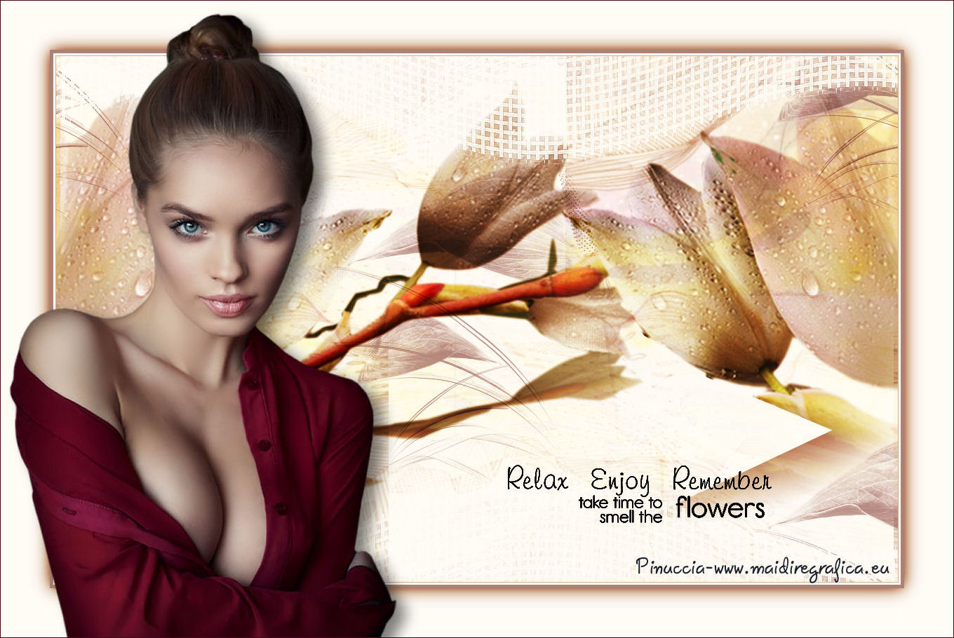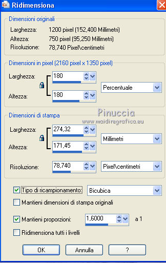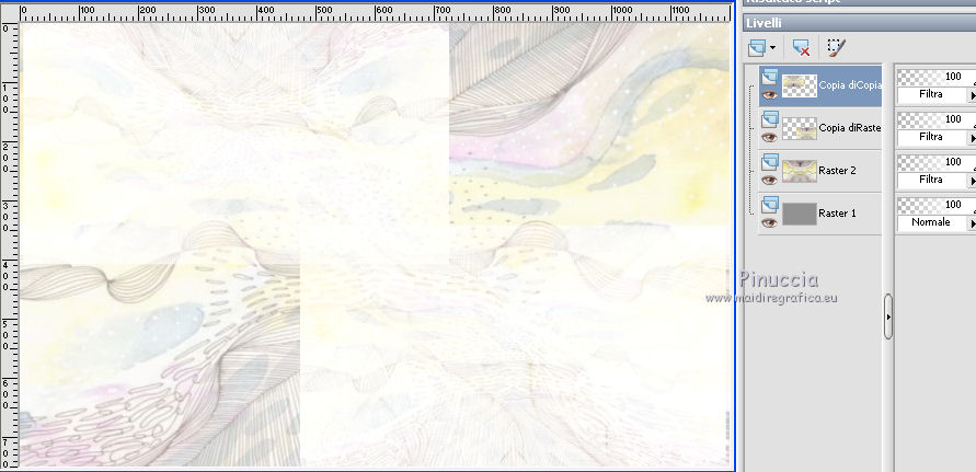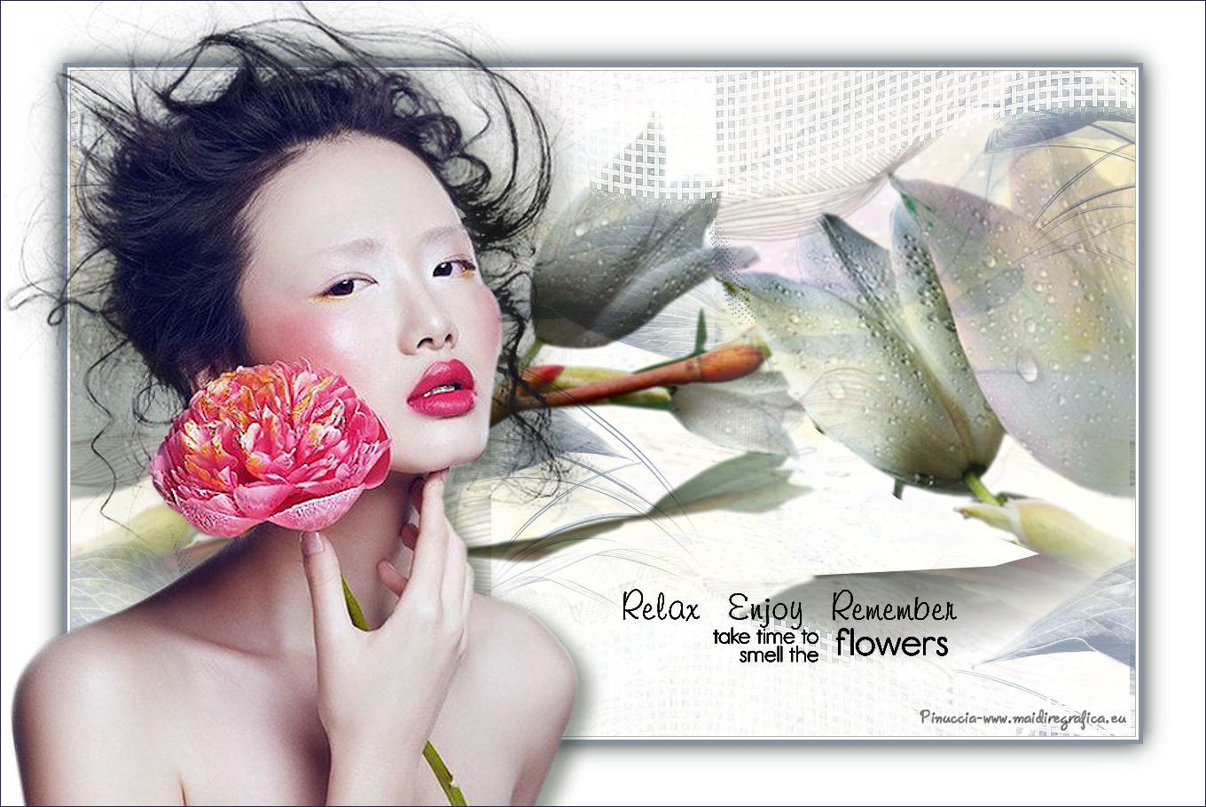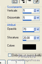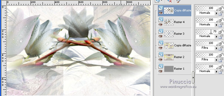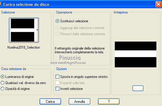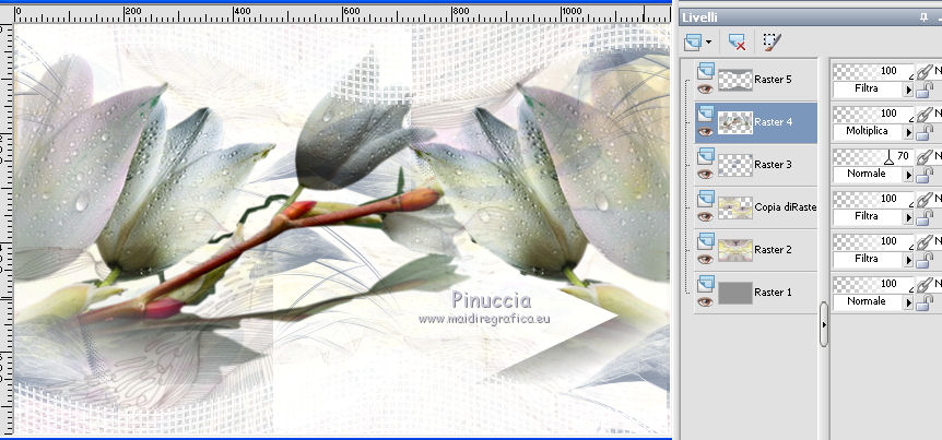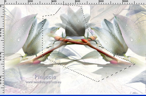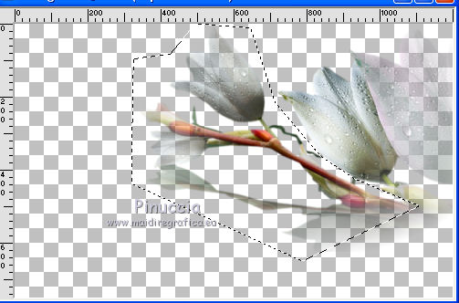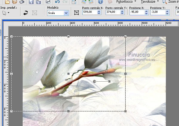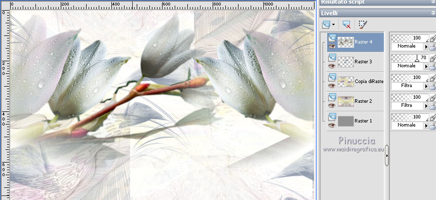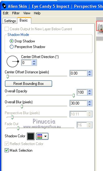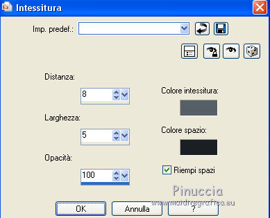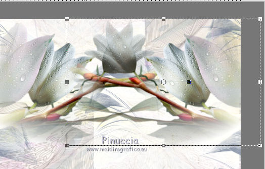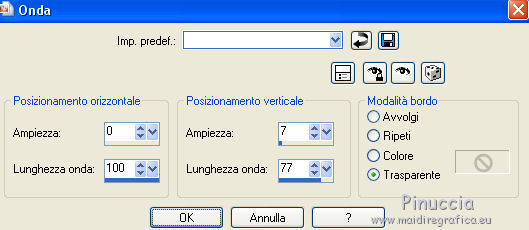 qui puoi trovare qualche risposta ai tuoi dubbi. Se l'argomento che ti interessa non è presente, ti prego di segnalarmelo. Questo tutorial è stato realizzato con Corel2018 e tradotto con Corel X, ma può essere realizzato anche con le altre versioni di PSP. Dalla versione X4, il comando Immagine>Rifletti è stato sostituito con Immagine>Capovolgi in orizzontale, e il comando Immagine>Capovolgi con Immagine>Capovolgi in verticale. Nelle versioni X5 e X6, le funzioni sono state migliorate rendendo disponibile il menu Oggetti. Con la nuova versione X7, sono tornati Rifletti>Capovolgi, ma con nuove varianti. Vedi la scheda sull'argomento qui traduzione in francese qui le vostre versioni qui Occorrente: Materiale qui I tubes sono di Beatriz e Drevers. (in questa pagina trovi i links ai siti dei creatori di tubes) ![]() non esitare a cambiare modalità di miscelatura e opacità secondo i colori utilizzati. Metti la selezione nella cartella Selezioni. 1. Apri una nuova immagine trasparente 1200 x 750 pixels. Imposta il colore di primo piano con #929292. ![]() 2. Selezione>Seleziona tutto. Livelli>Nuovo livello raster. Apri l'immagine di sfondo "background.jpg" e vai a Modifica>Copia. Torna al tuo lavoro e vai a Modifica>Incolla nella selezione. Selezione>Deseleziona. 3. Cambia la modalità di miscelatura di questo livello in Filtra. 4. Livelli>Duplica. Immagine>Ridimensiona, al 60%, tutti i livelli non selezionato. ![]() 5. Effetti>Effetti di immagine>Scostamento. ![]() Livelli>Duplica. Immagine>Capovolgi. Immagine>Rifletti. ![]() Livelli>Unisci>Unisci giù. 6. Apri il tube Drevers_Flower_Element01 e vai a Modifica>Copia. Torna al tuo lavoro e vai a Modifica>Incolla come nuovo livello. Effetti>Effetti di immagine>Motivo unico, con i settaggi standard. ![]() Abbassa l'opacità di questo livello al 70%. 7. Apri il tube Tulip e vai a Modifica>Copia. Torna al tuo lavoro e vai a Modifica>Incolla come nuovo livello. Immagine>Ridimensiona, al 180%, tutti i livelli non selezionato. ![]() Sposta il tube in alto a sinistra.![]() Livelli>Duplica. Immagine>Rifletti. Posiziona correttamente il tube come nell'esempio.![]() Dovresti avere questo ![]() 8. Attiva lo strumento Selezione a mano libera ![]() e seleziona il fiore al centro ![]() Puoi chiudere gli altri livelli per vedere meglio ![]() Premi sulla tastiera il tasto CANC .Selezione>Deseleziona. Livelli>Unisci>Unisci giù. ![]() 9. Livelli>Nuovo livello raster. Selezione>Carica/Salva selezione>Carica selezione da disco. Cerca e carica la selezione Noelina2018_Selection ![]() Riempi la selezione con il colore di primo piano #929292.Effetti>Effetti 3D>Sfalsa ombra. ![]() Cambia la modalità di miscelatura di questo livello in Filtra. Selezione>Deseleziona. 10. Effetti>Effetti di trama>Intessitura colore intessitura #565e66 - colore spazio #1b1f25. ![]() Effetti>Effetti di distorsione>Onda. ![]() Livelli>Duplica. Livelli>Unisci>Unisci giù. Effetti>Effetti di bordo>Aumenta. Attiva lo strumento Puntatore ![]() e sposta la figura in alto, come nell'esempio. ![]() 11. Livelli>Duplica. Immagine>Capovolgi. Livelli>Unisci>Unisci giù. Sposta i fiori un po' più in bassoe cambia la modalità di miscelatura di questo livello in Moltiplica. ![]() 12. Immagine>Aggiungi bordatura, 1 pixel, simmetriche, colore #b1b6b2. Immagine>Aggiungi bordatura, 3 pixels, simmetriche, colore #ffffff. Immagine>Aggiungi bordatura, 5 pixels, simmetriche, colore #8692a4. Selezione>Seleziona tutto. Immagine>Aggiungi bordatura, 70 pixels, simmetriche, colore #ffffff. 13. Effetti>Plugins>Alien Skin Eye Candy 5 Impact - Perspective Shadow. Shadow Color: #192020. ![]() Selezione>Deseleziona. 14. Apri il tube della donna di Beatriz e vai a Modifica>Copia. Torna al tuo lavoro e vai a Modifica>Incolla come nuovo livello. Immagine>Rifletti. Immagine>Ridimensiona, al 150%, tutti i livelli non selezionato. Sposta il tube a sinistra.Effetti>Effetti 3D>Sfalsa ombra. ![]() 15. Apri il wordart e vai a Modifica>Copia. Torna al tuo lavoro e vai a Modifica>Incolla come nuovo livello. Posiziona il testo a tuo piacimento.16. Livelli>Unisci>Unisci tutto. Firma il tuo lavoro e salva in formato jpg. Piccola nota sul watermark. Non chiedo mai di mettere il watermark nelle versioni fatte seguendo le mie traduzioni. Ma, se decidi di utilizzare il watermark fornito dall'autore, apprezzerei che anche il mio lavoro fosse rispettato. Per questo, ho aggiunto al materiale il mio watermark. ![]() Il tube di questo esempio è di Karine. ![]() ![]() Puoi scrivermi se hai problemi o dubbi, o trovi un link che non funziona, o soltanto per un saluto. 6 Aprile 2018 |