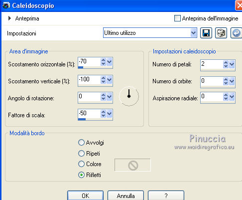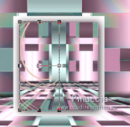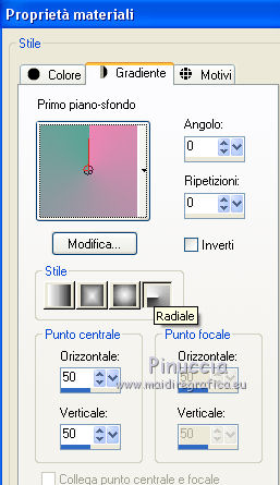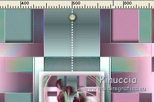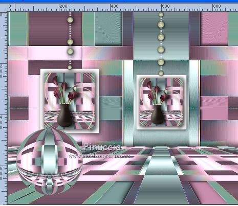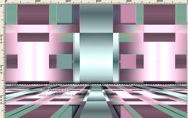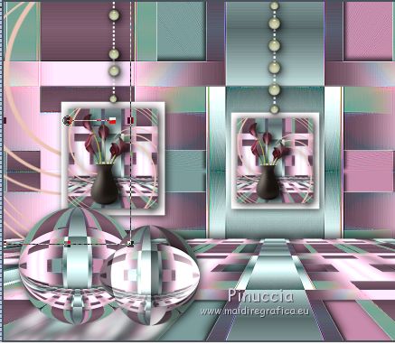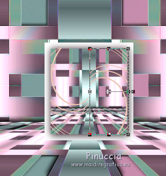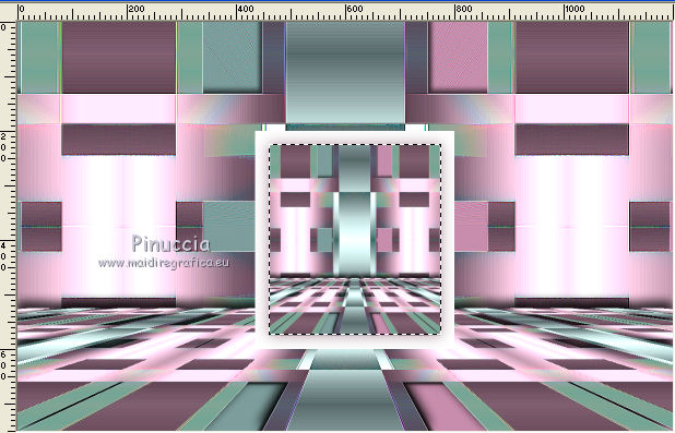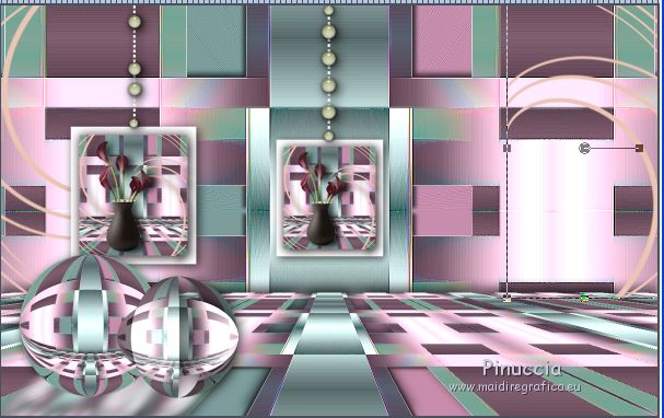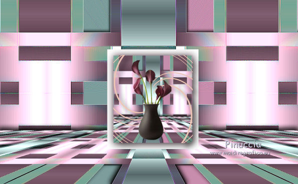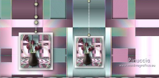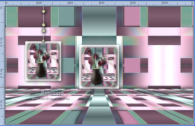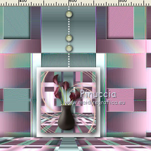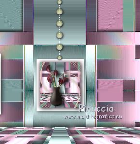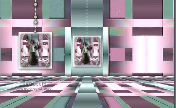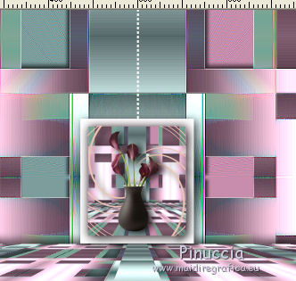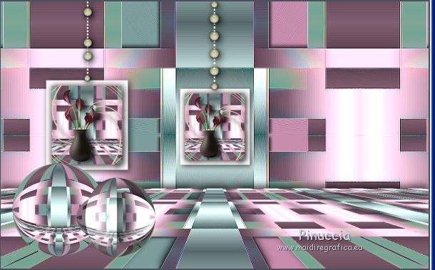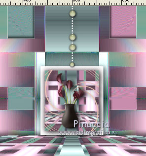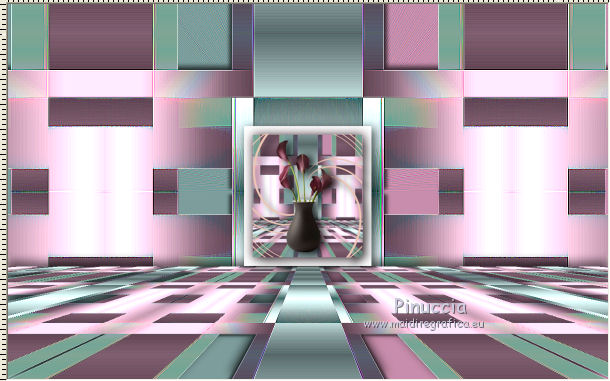 qui puoi trovare qualche risposta ai tuoi dubbi. Se l'argomento che ti interessa non è presente, ti prego di segnalarmelo. Questo tutorial è stato realizzato con Corel2018 e tradotto con Corel X, ma può essere realizzato anche con le altre versioni di PSP. Dalla versione X4, il comando Immagine>Rifletti è stato sostituito con Immagine>Capovolgi in orizzontale, e il comando Immagine>Capovolgi con Immagine>Capovolgi in verticale. Nelle versioni X5 e X6, le funzioni sono state migliorate rendendo disponibile il menu Oggetti. Con la nuova versione X7, sono tornati Rifletti>Capovolgi, ma con nuove varianti. Vedi la scheda sull'argomento qui traduzione in francese qui le vostre versioni qui Occorrente: Un tube a scelta. Il resto del materiale qui Il tube della donna è di Maryse Il tube del vaso è di Cibi-Bijoux (in questa pagina trovi i links ai siti dei creatori di tubes) Filtri in caso di dubbi, ricorda di consultare la mia sezione filtri qui Filters Unlimited 2.0 qui VM Natural qui Mehdi - Sorting Tiles qui Alien Skin Eye Candy 5 Impact - Perspective Shadow qui Mura's Meister - Perspective Tiling qui I filtri VM Natural si possono usare da soli o importati in Filters Unlimited (come fare vedi qui) Se un filtro fornito appare con questa icona ![]() non esitare a cambiare modalità di miscelatura e opacità secondo i colori utilizzati. Nelle ultime versioni di PSP non c'è il gradiente di primo piano/sfondo (Corel_06_029) Puoi usare i gradienti delle versioni precedenti. Trovi qui i gradienti Corel X. Metti il preset Emboss 3 nella cartella Impostazioni predefinite. Metti l'ornamento nella cartella Ornamenti. 1. Apri una nuova immagine trasparente 1200 x 750 pixels. Scegli due colori naturali in armonia con la tua immagine. Per l'esempio: imposta il colore di primo piano con #ee85b4, e il colore di sfondo con #57a595. ![]() Passa il colore di primo piano a Gradiente di primo piano/sfondo, stile Radiale. ![]() Riempi l'immagine trasparente con il gradiente.3. Livelli>Duplica. Immagine>Capovolgi. Abbassa l'opacità di questo livello al 50%. Livelli>Unisci>Unisci giù. Effetti>Effetti di bordo>Aumenta. Regola>Messa a fuoco>Accentua messa a fuoco. Effetti>Filtro definito dall'utente, seleziona il preset Emboss 3 e ok. ![]() Effetti>Effetti di bordo>Aumenta di più. Livelli>Duplica. 4. Effetti>Plugins>VM Natural - Weave Distortion. ![]() 5. Effetti>Plugins>Mehdi - Sorting Tiles. ![]() Effetti>Effetti 3D>Sfalsa ombra. ![]() 6. Effetti>Effetti di riflesso>Caleidoscopio. ![]() 7. Effetti>Effetti di distorsione>Stringi (nelle versioni più recenti è diventato Compressione). ![]() Effetti>Effetti di bordo>Aumenta di più. Livelli>Duplica. 8. Effetti>Plugins>Mura's Meister - Perspective Tiling. ![]() Effetti>Effetti 3D>Sfalsa ombra. ![]() 9. Attiva il livello sottostante, copia di Raster 1 ![]() Attiva lo strumento Selezione , rettangolo,![]() e traccia una selezione del "pavimento". ![]() Premi sulla tastiera il tasto CANC ![]() Selezione>Deseleziona. Livelli>Unisci>Unisci visibile. Modifica>Copia. 10. Livelli>Nuovo livello raster e approfitta della finestra per rinominare il livello "cornice". ![]() Attiva lo strumento Selezione ![]() (non importa il tipo di selezione impostato, perchè con la selezione personalizzata si ottiene sempre un rettangolo) clicca sull'icona Selezione personalizzata ![]() e imposta i seguenti settaggi. ![]() Imposta il colore di primo piano con il colore bianco #ffffff. Riempi la selezione con il colore bianco.Selezione>Modifica>Contrai - 25 pixels. ![]() Premi sulla tastiera il tasto CANC. Mantieni selezionato. 11. Effetti>Plugins>Alien Skin Eye Candy 5 Impact - Perspective Shadow Shadow Color: #ae8f9d. ![]() Modifica>Incolla nella selezione. ![]() Effetti>Effetti 3D>Sfalsa ombra. ![]() Selezione>Deseleziona. 14. Apri il tube Erina_Paloma decor e vai a Modifica>Copia. Torna al tuo lavoro e vai a Modifica>Incolla come nuovo livello. Attiva lo strumento Puntatore ![]() e adatta il tube nella metà sinistra della cornice. ![]() Livelli>Duplica. Immagine>Capovolgi. Immagine>Rifletti. Posiziona correttamente il tube nella metà destra della cornice.![]() Livelli>Unisci>Unisci giù. Effetti>Effetti 3D>Sfalsa ombra. ![]() 15. Apri il tube Deco_vase_arums_CibiBijoux e vai a Modifica>Copia. Torna al tuo lavoro e vai a Modifica>Incolla come nuovo livello. Immagine>Ridimensiona, al 70%, tutti i livelli non selezionato. Posiziona il tube nella cornice.![]() Effetti>Effetti 3D>Sfalsa ombra. ![]() Livelli>Unisci>Unisci giù - 2 volte. ![]() 16. Immagine>Ridimensiona, al 70%, tutti i livelli non selezionato. ![]() Effetti>Effetti 3D>Sfalsa ombra. ![]() Sposta la cornice al centro dell'immagine.![]() 17. Mantieni il colore di primo piano con il colore bianco #ffffff. Attiva lo strumento Penna , linea di stile Punto, larghezza 5![]() Traccia una linea verticale come nell'esempio. ![]() Livelli>Converti in livello raster. Effetti>Effetti 3D>Sfalsa ombra, con i settaggi precedenti. ![]() 18. Livelli>Nuovo livello raster. Attiva lo strumento Ornamento ![]() cerca e seleziona la perla ![]() Applica la prima perla sulla linea di punti ![]() Livelli>Duplica - 2 volte e posiziona correttamente le perle.![]() Imposta la scala a 70 ![]() e applica l'ultima perlina sulla cornice. ![]() Assicurati di essere posizionato sul livello superiore. Livelli>Unisci>Unisci giù - 3 volte, per avere le perline su un unico livello. ![]() Effetti>Effetti 3D>Sfalsa ombra, con i settaggi precedenti. ![]() Attiva il livello della cornice. Immagine>Ridimensiona, al 90%, tutti i livelli non selezionato. Livelli>Duplica. ![]() 19. Attiva il livello originale della cornice. Livelli>Disponi>Sposta su ![]() Attiva il livello superiore ![]() Livelli>Unisci>Unisci giù. Immagine>Ridimensiona, al 90%, tutti i livelli non selezionato. Livelli>Unisci>Unisci giù ![]() Sposta la cornice a sinistra.![]() Attiva il livello della copia. Immagine>Ridimensiona, all'85%, tutti i livelli non selezionato. ![]() Posiziona corretta