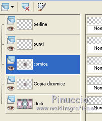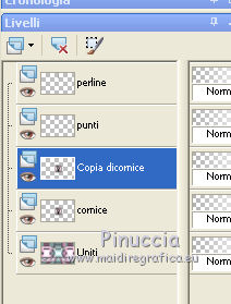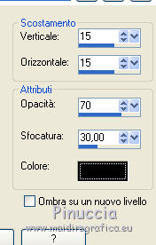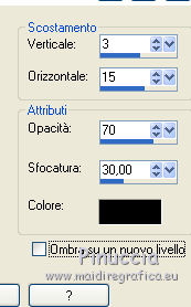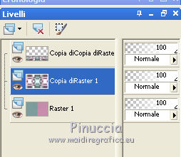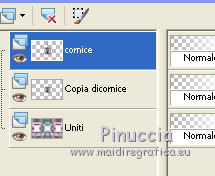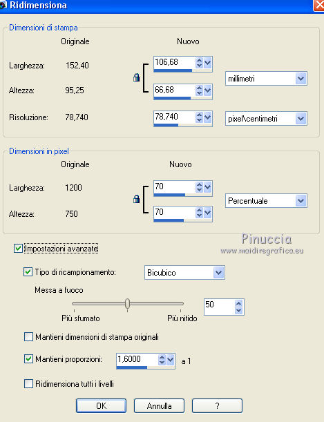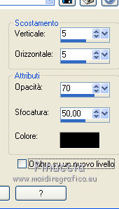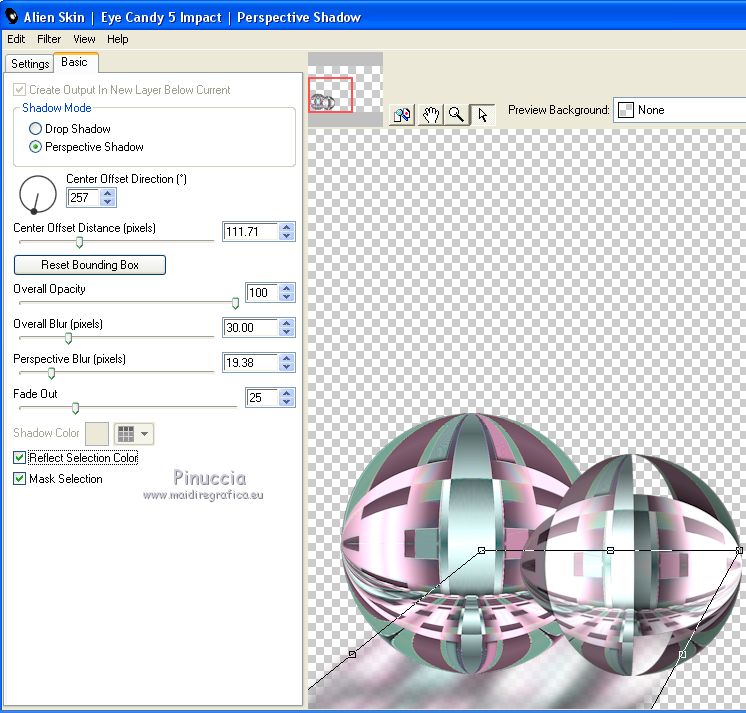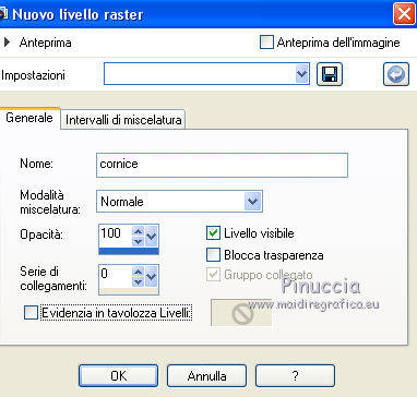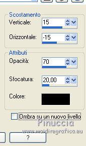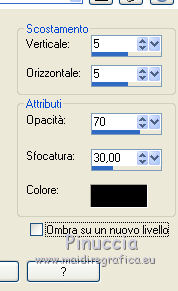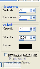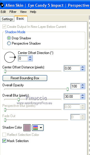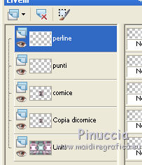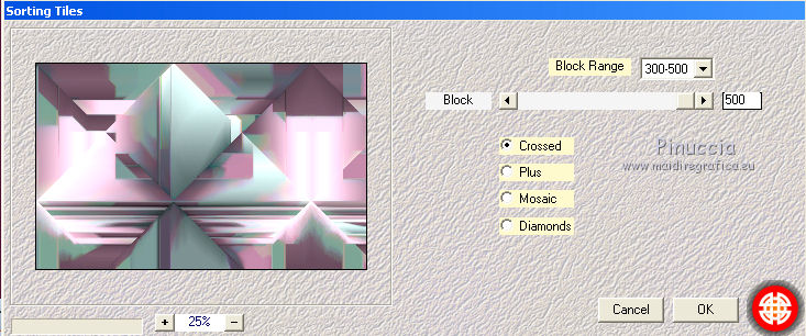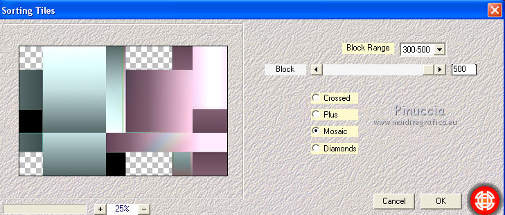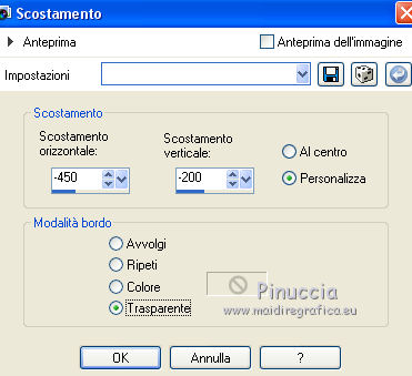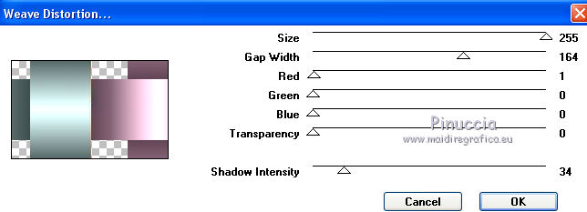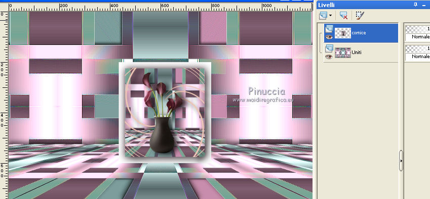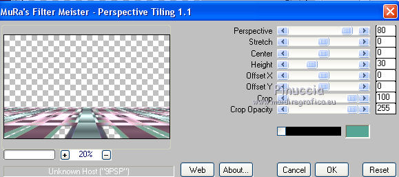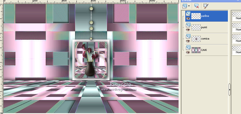 qui puoi trovare qualche risposta ai tuoi dubbi. Se l'argomento che ti interessa non è presente, ti prego di segnalarmelo. Questo tutorial è stato realizzato con Corel2018 e tradotto con Corel X, ma può essere realizzato anche con le altre versioni di PSP. Dalla versione X4, il comando Immagine>Rifletti è stato sostituito con Immagine>Capovolgi in orizzontale, e il comando Immagine>Capovolgi con Immagine>Capovolgi in verticale. Nelle versioni X5 e X6, le funzioni sono state migliorate rendendo disponibile il menu Oggetti. Con la nuova versione X7, sono tornati Rifletti>Capovolgi, ma con nuove varianti. Vedi la scheda sull'argomento qui traduzione in francese qui le vostre versioni qui Occorrente: Un tube a scelta. Il resto del materiale qui Il tube della donna è di Maryse Il tube del vaso è di Cibi-Bijoux (in questa pagina trovi i links ai siti dei creatori di tubes) Filtri in caso di dubbi, ricorda di consultare la mia sezione filtri qui Filters Unlimited 2.0 qui VM Natural qui Mehdi - Sorting Tiles qui Alien Skin Eye Candy 5 Impact - Perspective Shadow qui Mura's Meister - Perspective Tiling qui I filtri VM Natural si possono usare da soli o importati in Filters Unlimited (come fare vedi qui) Se un filtro fornito appare con questa icona ![]() non esitare a cambiare modalità di miscelatura e opacità secondo i colori utilizzati. Nelle ultime versioni di PSP non c'è il gradiente di primo piano/sfondo (Corel_06_029) Puoi usare i gradienti delle versioni precedenti. Trovi qui i gradienti Corel X. Metti il preset Emboss 3 nella cartella Impostazioni predefinite. Metti l'ornamento nella cartella Ornamenti. 1. Apri una nuova immagine trasparente 1200 x 750 pixels. Scegli due colori naturali in armonia con la tua immagine. Per l'esempio: imposta il colore di primo piano con #ee85b4, e il colore di sfondo con #57a595. ![]() Passa il colore di primo piano a Gradiente di primo piano/sfondo, stile Radiale. ![]() Riempi l'immagine trasparente con il gradiente.3. Livelli>Duplica. Immagine>Capovolgi. Abbassa l'opacità di questo livello al 50%. Livelli>Unisci>Unisci giù. Effetti>Effetti di bordo>Aumenta. Regola>Messa a fuoco>Accentua messa a fuoco. Effetti>Filtro definito dall'utente, seleziona il preset Emboss 3 e ok. ![]() Effetti>Effetti di bordo>Aumenta di più. Livelli>Duplica. 4. Effetti>Plugins>VM Natural - Weave Distortion. ![]() 5. Effetti>Plugins>Mehdi - Sorting Tiles. ![]() Effetti>Effetti 3D>Sfalsa ombra. ![]() 6. Effetti>Effetti di riflesso>Caleidoscopio. ![]() 7. Effetti>Effetti di distorsione>Stringi (nelle versioni più recenti è diventato Compressione). ![]() Effetti>Effetti di bordo>Aumenta di più. Livelli>Duplica. 8. Effetti>Plugins>Mura's Meister - Perspective Tiling. ![]() Effetti>Effetti 3D>Sfalsa ombra. ![]() 9. Attiva il livello sottostante, copia di Raster 1 ![]() Attiva lo strumento Selezione , rettangolo,![]() e traccia una selezione del "pavimento". ![]() Premi sulla tastiera il tasto CANC ![]() Selezione>Deseleziona. Livelli>Unisci>Unisci visibile. Modifica>Copia. 10. Livelli>Nuovo livello raster e approfitta della finestra per rinominare il livello "cornice". ![]() Attiva lo strumento Selezione ![]() (non importa il tipo di selezione impostato, perchè con la selezione personalizzata si ottiene sempre un rettangolo) clicca sull'icona Selezione personalizzata ![]() e imposta i seguenti settaggi. ![]() Imposta il colore di primo piano con il colore bianco #ffffff. Riempi la selezione con il colore bianco.Selezione>Modifica>Contrai - 25 pixels. ![]() Premi sulla tastiera il tasto CANC. Mantieni selezionato. 11. Effetti>Plugins>Alien Skin Eye Candy 5 Impact - Perspective Shadow Shadow Color: #ae8f9d. ![]() Modifica>Incolla nella selezione. ![]() Effetti>Effetti 3D>Sfalsa ombra. ![]() Selezione>Deseleziona. 14. Apri il tube Erina_Paloma decor e vai a Modifica>Copia. Torna al tuo lavoro e vai a Modifica>Incolla come nuovo livello. Attiva lo strumento Puntatore ![]() e adatta il tube nella metà sinistra della cornice. ![]() Livelli>Duplica. Immagine>Capovolgi. Immagine>Rifletti. Posiziona correttamente il tube nella metà destra della cornice.![]() Livelli>Unisci>Unisci giù. Effetti>Effetti 3D>Sfalsa ombra. ![]() 15. Apri il tube Deco_vase_arums_CibiBijoux e vai a Modifica>Copia. Torna al tuo lavoro e vai a Modifica>Incolla come nuovo livello. Immagine>Ridimensiona, al 70%, tutti i livelli non selezionato. Posiziona il tube nella cornice.![]() Effetti>Effetti 3D>Sfalsa ombra. ![]() Livelli>Unisci>Unisci giù - 2 volte. ![]() 16. Immagine>Ridimensiona, al 70%, tutti i livelli non selezionato. ![]() Effetti>Effetti 3D>Sfalsa ombra. ![]() Sposta la cornice al centro dell'immagine.![]() 17. Mantieni il colore di primo piano con il colore bianco #ffffff. Attiva lo strumento Penna , linea di stile Punto, larghezza 5![]() Traccia una linea verticale come nell'esempio. ![]() Livelli>Converti in livello raster. Effetti>Effetti 3D>Sfalsa ombra, con i settaggi precedenti. ![]() 18. Livelli>Nuovo livello raster. Attiva lo strumento Ornamento ![]() cerca e seleziona la perla ![]() Applica la prima perla sulla linea di punti ![]() Livelli>Duplica - 2 volte e posiziona correttamente le perle.![]() Imposta la scala a 70 ![]() e applica l'ultima perlina sulla cornice. ![]() Assicurati di essere posizionato sul livello superiore. Livelli>Unisci>Unisci giù - 3 volte, per avere le perline su un unico livello. ![]() Effetti>Effetti 3D>Sfalsa ombra, con i settaggi precedenti. ![]() Attiva il livello della cornice. Immagine>Ridimensiona, al 90%, tutti i livelli non selezionato. Livelli>Duplica. ![]() 19. Attiva il livello originale della cornice. Livelli>Disponi>Sposta su ![]() Attiva il livello superiore ![]() Livelli>Unisci>Unisci giù. Immagine>Ridimensiona, al 90%, tutti i livelli non selezionato. Livelli>Unisci>Unisci giù ![]() Sposta la cornice a sinistra.![]() Attiva il livello della copia. Immagine>Ridimensiona, all'85%, tutti i livelli non selezionato. ![]() Posiziona corretta