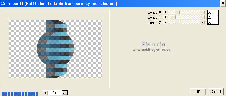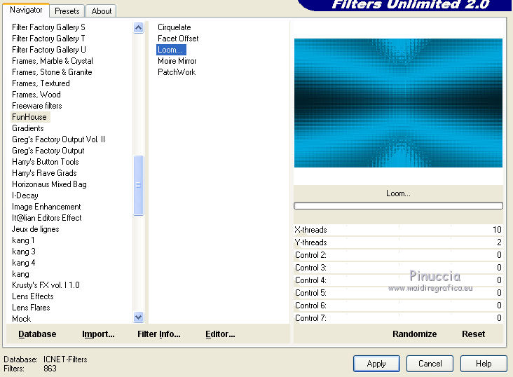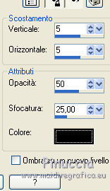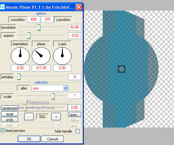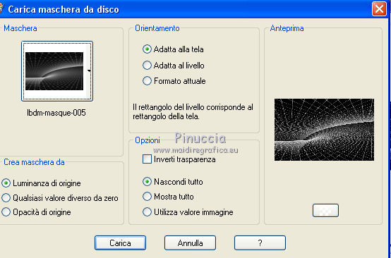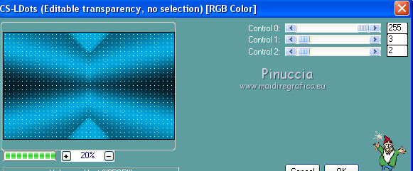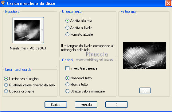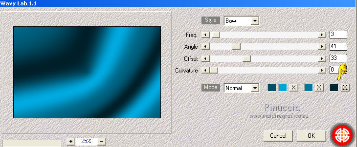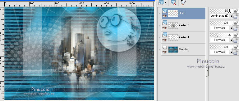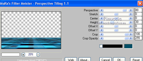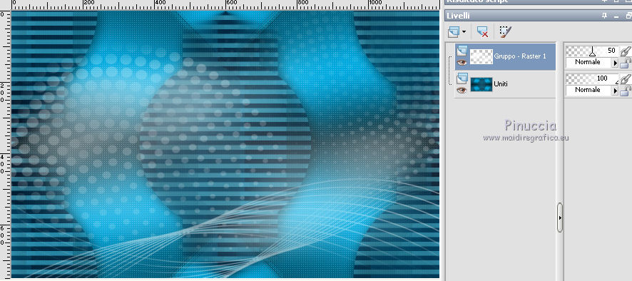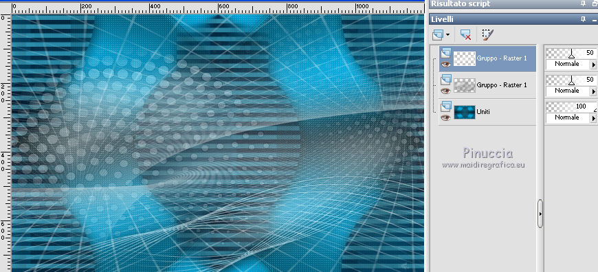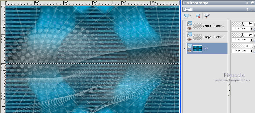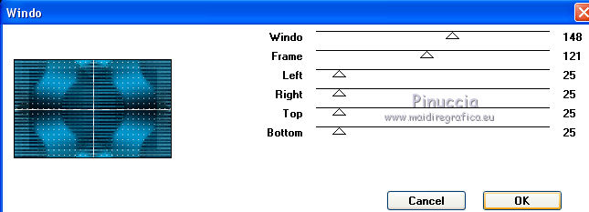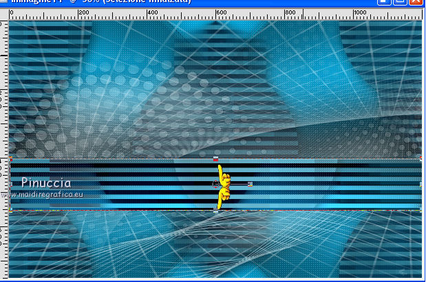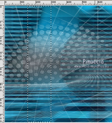 qui puoi trovare qualche risposta ai tuoi dubbi. Se l'argomento che ti interessa non è presente, ti prego di segnalarmelo. Questo tutorial è stato realizzato con Corel2018 e tradotto con Corel X, ma può essere realizzato anche con le altre versioni di PSP. Dalla versione X4, il comando Immagine>Rifletti è stato sostituito con Immagine>Capovolgi in orizzontale, e il comando Immagine>Capovolgi con Immagine>Capovolgi in verticale. Nelle versioni X5 e X6, le funzioni sono state migliorate rendendo disponibile il menu Oggetti. Con la nuova versione X7, sono tornati Rifletti>Capovolgi, ma con nuove varianti. Vedi la scheda sull'argomento qui traduzione in francese qui le vostre versioni qui Occorrente: Un tube a scelta Il resto del materiale qui Il tube della donna è Yoka. Il tube del paesaggio è di Thafs. Le maschere sono di Narah e Mary LBDM (in questa pagina trovi i links ai siti dei creatori di tubes) Filtri in caso di dubbi, ricorda di consultare la mia sezione filtri qui Filters Unlimited 2.0 qui CPK Designs - CK Pegs qui Carolaine and Sensibility - CS-LDots qui Alien Skin Eye Candy 5 Impact - Perspective Tiling qui Mura's Meister - Perspective Tiling qui Mehdi - Sorting Tiles qui I filtri CPK si possono usare da soli o importati in Filters Unlimited (come fare vedi qui) Se un filtro fornito appare con questa icona ![]() non esitare a cambiare modalità di miscelatura e opacità secondo i colori utilizzati. Metti le maschere nella cartella Maschere. 1. Apri una nuova immagine trasparente 1200 x 750 pixels. Imposta il colore di primo piano con #00a3d7 e il colore di sfondo con #004d65. ![]() 2. Effetti>Plugins>Mura's Meister - Wavy Lab 1.1 Questo filtro lavora con i colori della paletta: il primo è il colore di sfondo, il secondo quello di primo piano degli ultimi due colori creati dal filtro cambia l'ultimo con #002632. ![]() 3. Effetti>Plugins>Simple - Pizza Slice Mirror. 4. Effetti>Effetti di bordo>Aumenta. 5. Effetti>Effetti di riflesso>Specchio rotante, con i settaggi standard. ![]() 6. Effetti>Plugins>Filters Unlimited 2.0 - Funhouse - Loom, con i settaggi standard. ![]() 7. Effetti>Plugins>Carolaine and Sensibility - CS-LDots ![]() 8. Attiva lo strumento Selezione , Cerchio![]() Punta il mouse al centro della tela e traccia un cerchio come nell'esempio ![]() Selezione>Innalza selezione a livello. 9. Effetti>Plugins>Frischluft - Mosaic Plane ![]() con la versione precedente di questo filtro (1.0), il risultato sarà differente Selezione>Deseleziona. 10. Effetti>Plugins>CS-Linear-H ![]() 11. Effetti>Effetti di immagine>Motivo unico, con i settaggi standard. ![]() 12. Effetti>Effetti 3D>Sfalsa ombra. ![]() 13. Livelli>Unisci>Unisci visibile. 14. Imposta il colore di primo piano con il colore bianco. Livelli>Nuovo livello raster. Riempi il livello con il colore bianco.Livelli>Carica/Salva maschera>Carica maschera da disco. Cerca e carica la maschera Narah_mask_Abstract63 ![]() Livelli>Unisci>Unisci gruppo. Abbassa l'opacità di questo livello al 50%. ![]() 15. Effetti>Effetti di bordo>Aumenta di più. Effetti>Effetti 3D>Sfalsa ombra, con i settaggi precedenti. ![]() 16. Livelli>Nuovo livello raster. Riempi il livello con il colore bianco #ffffff.Livelli>Carica/Salva maschera>Carica maschera da disco. Cerca e carica la maschera lbdm-masque-005 ![]() Livelli>Unisci>Unisci gruppo. Abbassa l'opacità di questo livello al 50%. ![]() Effetti>Effetti 3D>Sfalsa ombra, con i settaggi precedenti. ![]() 17. Attiva il livello Raster 1. Attiva lo strumento Selezione , rettangolo![]() Traccia un rettangolo di 150 pixels (400-550 pixels) ![]() Selezione>Innalza selezione a livello. Livelli>Disponi>Porta in alto. Selezione>Deseleziona. 18. Effetti>Plugins>Carolaine and Sensibility - CS-Linear-H ![]() 19. Attiva lo strumento Puntatore ![]() in modalità Scala ![]() spingi i nodi centrali in alto e in basso ![]() fino ai bordi ![]() 20. Effetti>Plugins>Mura's Meister - Perspective Tiling. ![]() Abbassa l'opacità di questo livello al 50%. 21. Attiva il livello Uniti. Effetti>Plugins>Mock - Windo ![]() 22. Immagine>Aggiungi bordatura, 1 pixel, simmetriche, colore bianco #ffffff. 23. Livelli>Nuovo livello raster. Attiva lo strumento Selezione , rettangoloe traccia un rettangolo di 150 pixels (150-300 pixel) ![]() Riempi la selezione con il colore bianco #ffffff.Livelli>Duplica. Selezione>Deseleziona. Immagine>Rifletti. Livelli>Unisci>Unisci giù. Abbassa l'opacità di questo livello al 30%. ![]() 24. Rimani posizionato sul livello Raster 1. Attiva nuovamente lo strumento Selezione , rettangoloe traccia un rettangolo in basso, come nell'esempio ![]() Premi sulla tastiera il tasto CANC ![]() Selezione>Deseleziona. 25. Apri il tube misted_manhattan_tubed_by_Thafs, e vai a Modifica>Copia. Torna al tuo lavoro e vai a Modifica>Incolla come nuovo livello. Chiudi tutti i livelli: Livelli>Visualizza>Nessuno e rimani posizionato sul livello superiore. Livelli>Nuovo livello raster. Attiva lo strumento Selezione , Cerchioe traccia un cerchio come nell'esempio ![]() 26. Riempi la selezione con il colore bianco #ffffff.Selezione>Deseleziona. Abbassa l'opacità di questo livello al 50%. 27. Apri il tube "noi arc figurat" e vai a Modifica>Copia. Torna al tuo lavoro e vai a Modifica>Incolla come nuovo livello. Posiziona correttamente il tube al centro del cerchio.Per il mio esempio ho ridimensionato il cerchio all'80%. ![]() Su entrambi i livelli: Effetti>Effetti 3D>Sfalsa ombra. ![]() Livelli>Unisci>Unisci visibile. Sposta l'immagine in alto a destraPer il mio esempio ho ridimensionato l'immagine al 90%. Cambia la modalità di miscelatura di questo livello in Luminanza (esistente) e abbassa l'opacità all'85%. Livelli>Visualizza>Tutto ![]() 28. Apri il tube "Tulip flower" e vai a Modifica>Copia. Torna al tuo lavoro e vai a Modifica>Incolla come nuovo livello. Sposta il tube in basso a destra![]() Cambia la modalità di miscelatura di questo livello in Luminanza Effetti>Effetti di bordo>Aumenta di più. Effetti>Eff