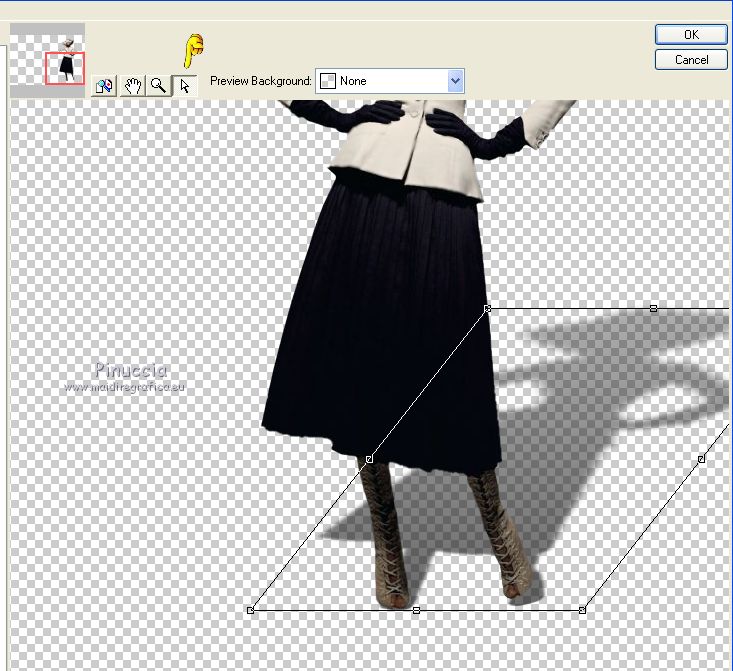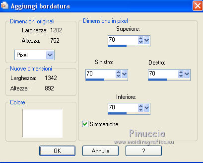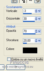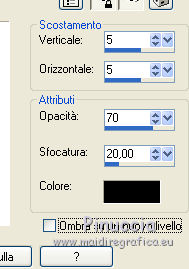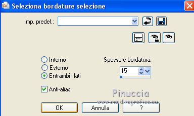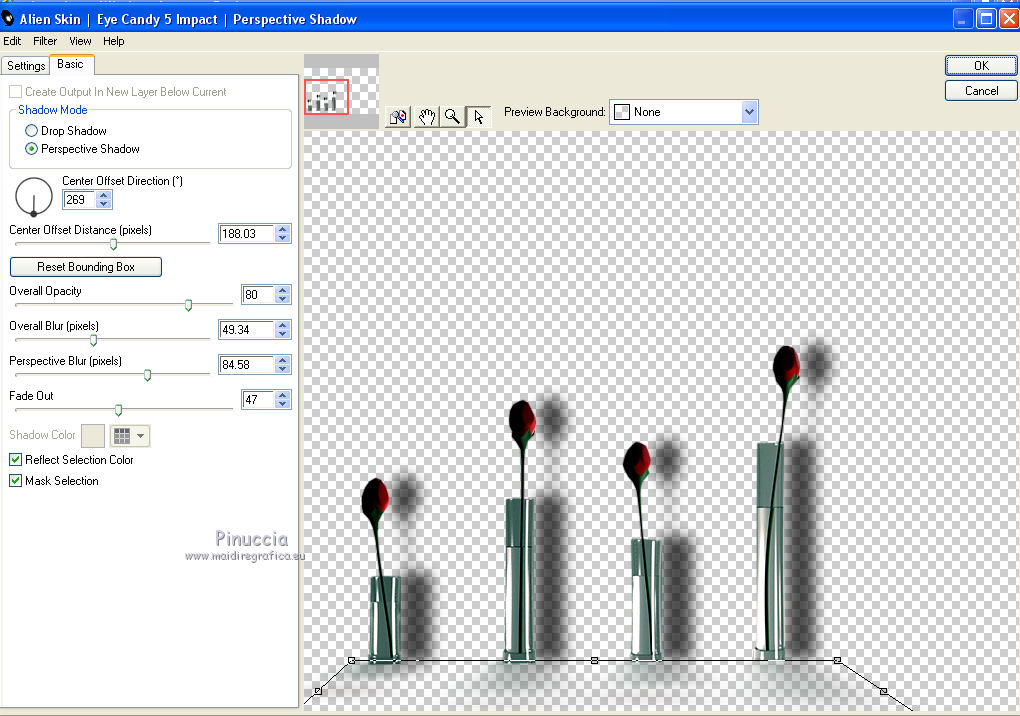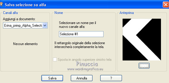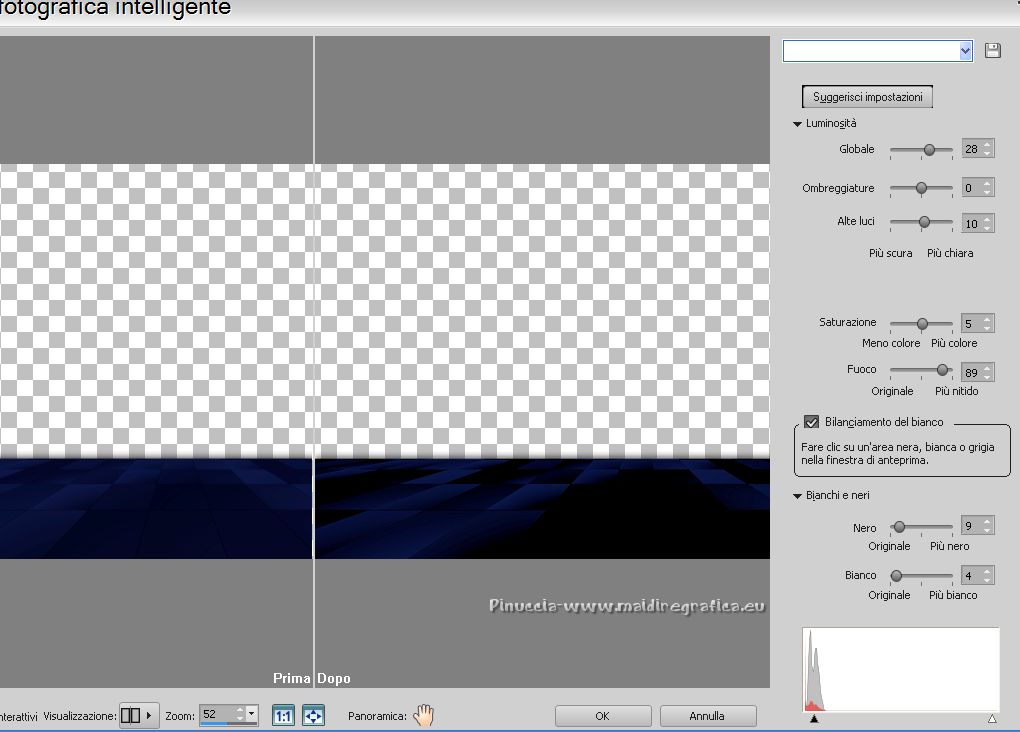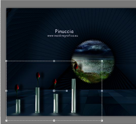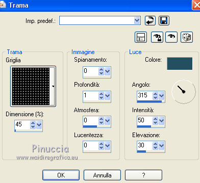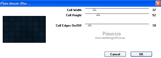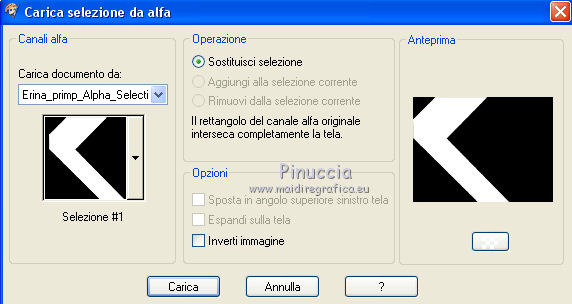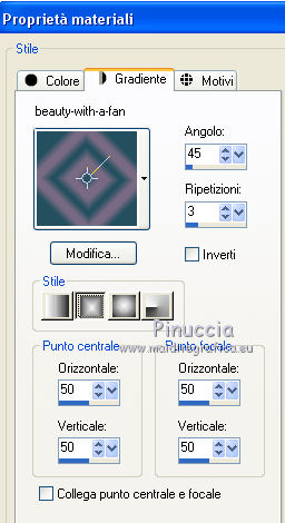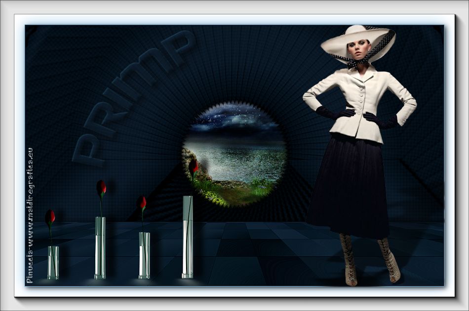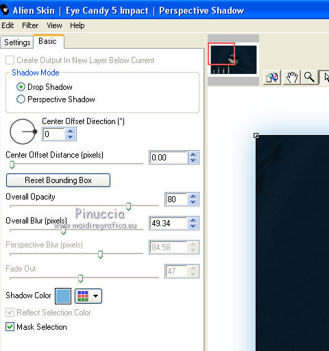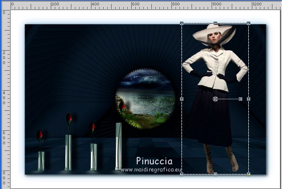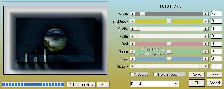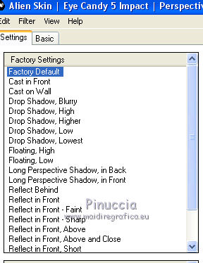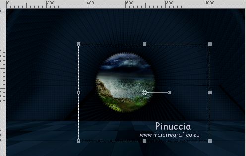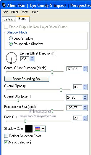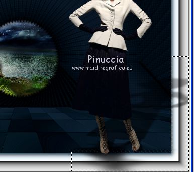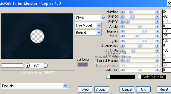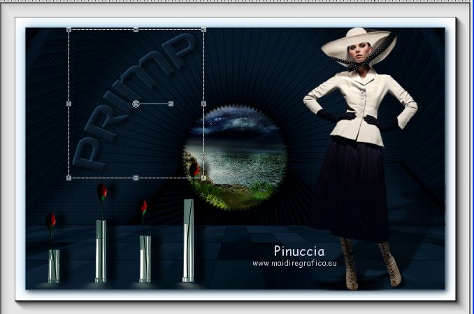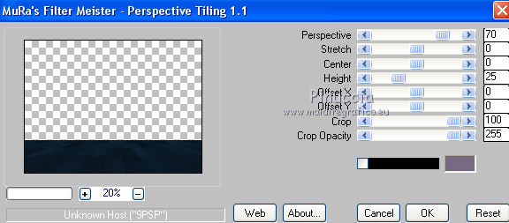 qui puoi trovare qualche risposta ai tuoi dubbi. Se l'argomento che ti interessa non è presente, ti prego di segnalarmelo. Questo tutorial è stato realizzato con Corel2018 e tradotto con Corel X, ma può essere realizzato anche con le altre versioni di PSP. Dalla versione X4, il comando Immagine>Rifletti è stato sostituito con Immagine>Capovolgi in orizzontale, e il comando Immagine>Capovolgi con Immagine>Capovolgi in verticale. Nelle versioni X5 e X6, le funzioni sono state migliorate rendendo disponibile il menu Oggetti. Con la nuova versione X7, sono tornati Rifletti>Capovolgi, ma con nuove varianti. Vedi la scheda sull'argomento qui traduzione in francese qui le vostre versioni qui Occorrente: Materiale qui Per il tube grazie Mina (in questa pagina trovi i links ai siti dei creatori di tubes) Filtri in caso di dubbi, ricorda di consultare la mia sezione filtri qui Filters Unlimited 2.0 qui Mura's Meister - Copies qui Alien Skin Eye Candy 5 Impact - Perspective Shadow qui Toadies - Plain Mosaic Blur qui I filtri Toadies si possono usare da soli o importati in Filters Unlimited (come fare vedi qui) Se un filtro fornito appare con questa icona ![]() non esitare a cambiare modalità di miscelatura e opacità secondo i colori utilizzati. Metti il gradiente nella cartella Gradienti. 1. Apri una nuova immagine trasparente 1200 x 750 pixels. Imposta il colore di primo piano con #244f5f, e il colore di sfondo con #786a83. ![]() Passa il colore di primo piano a Gradiente e seleziona il gradiente Beauty with a fun, stile Rettangolare. ![]() Se usi altri colori, anche il gradiente cambierà colore ![]() Riempi l'immagine trasparente con il gradiente.2. Apri "Erina_Alpha_Selection". Attiva lo strumento Bacchetta magica con i seguenti settaggi:![]() Clicca nella forma bianca per selezionarla. ![]() Selezione>Carica/Salva selezione>Salva selezione su canale alfa. ![]() 3. Minimizza la selezione e torna al tuo lavoro. Selezione>Carica/Salva selezione>Carica selezione da canale alfa. La selezione appena salvata è subito disponibile. Devi soltanto cliccare Carica. ![]() Selezione>Innalza selezione a livello. ![]() 4. Effetti>Effetti di trama>Trama - seleziona la trama Griglia, colore di primo piano #244f5f ![]() 5. Selezione>Modifica>Seleziona bordature selezione. ![]() io ho selezionato Entrambi i lati, per evitare una brutta ombra delle linee ![]() Premi sulla tastiera il tasto CANC ![]() Selezione>Deseleziona. 6. Attiva lo strumento Puntatore ![]() in modalità Scala ![]() usa i nodi centrali per allungare la figura fino ai bordi e nella metà sinistra della tela ![]() Livelli>Duplica. Immagine>Rifletti. Livelli>Unisci>Unisci giù e in alto dovresti avere lo spazio sufficiente per ottenere il cerchio del prossimo passaggio. Se necessario, usa ancora lo strumento Puntatore ![]() ![]() 7. Attiva il livello inferiore. Selezione>Seleziona tutto. Immagine>Ritaglia la selezione (per eliminare le tracce della figura rimaste all'esterno dei bordi) Attiva nuovamente il livello superiore. Effetti>Effetti 3D>Sfalsa ombra. ![]() 8. Effetti>Plugins>Mura's Meister - Copies. ![]() attendi pazientemente; secondo le risorse del tuo computer, l'attesa per l'elaborazione del filtro potrebbe dilungarsi ![]() Regola>Messa a fuoco>Metti a fuoco. 9. Adesso andiamo a preparare il "pavimento". Livelli>Duplica. Attiva lo strumento Pennello Distorsione ![]() ![]() Posiziona il mouse al centro dell'immagine. ![]() Tieni premuto il tasto sinistro del mouse finché non avrai un piccolo foro ![]() 10. Effetti>Plugins>Toadies - Plain Mosaic Blur. ![]() 11. Effetti>Plugins>Mura's Meister - Perspective Tiling. ![]() 12. Effetti>Effetti 3D>Sfalsa ombra. ![]() 13. questo punto è facoltativo: dipende dai tuoi colori Sul livello del "foro": Regola>Correzione fotografica intelligente ![]() Sul livello del "pavimento": Regola>Correzione fotografica intelligente ![]() 14. Attiva il livello Raster 1. Apri il tube del paesaggio di Mina Mina.5196mistpaesaggio e vai a Modifica>Copia. Torna al tuo lavoro e vai a Modifica>Incolla come nuovo livello. Immagine>Ridimensiona, se necessario (per il mio esempio ho ridimensionato al 75%), tutti i livelli non selezionato. Posiziona correttamente il tube usando lo strumento Puntatore ![]() ![]() 15. Attiva il livello superiore. Apri il tube dei fiori e vai a Modifica>Copia. Torna al tuo lavoro e vai a Modifica>Incolla come nuovo livello. Spostalo in basso a sinistra.Effetti>Effetti 3D>Sfalsa ombra. ![]() Effetti>Plugins>Alien Skin Eye Candy 5 Impact - Perspective Shadow. ![]() Attiva lo strumento Puntatore ![]() e tira il nodo inferiore, in modo che l'ombra tocchi il bordo ![]() 16. Immagine>Aggiungi bordatura, 1 pixel, simmetriche, colore #72b2dc. ![]() Selezione>Seleziona tutto. Immagine>Aggiungi bordatura, 70 pixels, simmetriche, colore bianco. ![]() Effetti>Plugins>Alien Skin Eye Candy 5 Impact - Perspective Shadow shadow color: #72b2dc. ![]() Effetti>Effetti 3D>Sfalsa ombra. ![]() Selezione>Deseleziona. 18. Effetti>Plugins>AAA Frames - Foto Frame. ![]() 19. Apri il tube della donna e vai a Modifica>Copia. Torna al tuo lavoro e vai a Modifica>Incolla come nuovo livello. Sposta il tube a destra.![]() Effetti>Plugins>Alien Skin Eye Candy 5 Impact - Perspective Shadow. Seleziona Factory Default ![]() e, se necessario, clicca sulla freccia per adattare l'ombra al tuo tube (per il mio esempio ho abbassato Overall opacity a 60) ![]() Di nuovo Effetti>Plugins>Alien Skin Eye Candy 5 impact - Perspective Shadow. ![]() Clicca sulla freccia per adattare l'ombra al tuo tube ![]() Attiva lo strumento Selezione ![]() e seleziona le ombre all'esterno dei bordi. ![]() Premi sulla tastiera il tasto CANC o cancella con lo strumento Gomma .Selezione>Deseleziona. 18. Apri il testo "primp" e vai a Modifica>Copia. Torna al tuo lavoro e vai a Modifica>Incolla come nuovo livello. Spostalo in alto a sinistra.![]() Abbassa l'opacità di questo livello al 60%. Effetti>Effetti 3D>Sfalsa ombra. ![]() Firma il tuo lavoro su