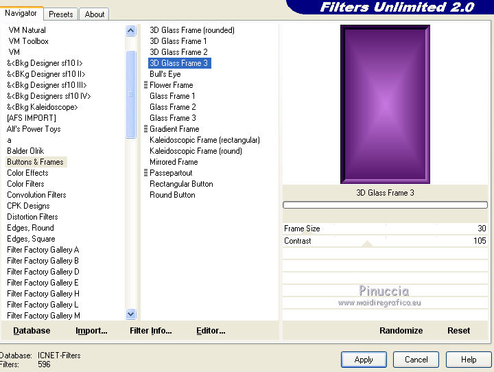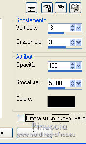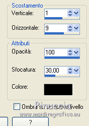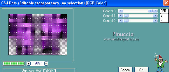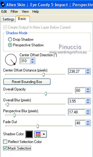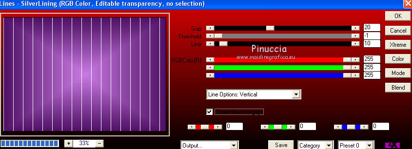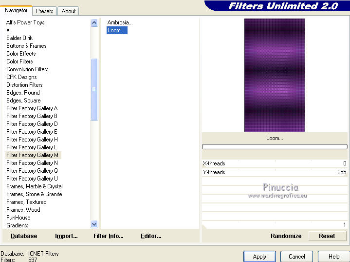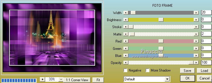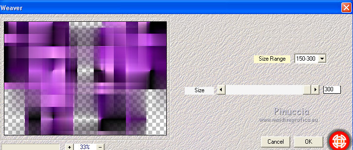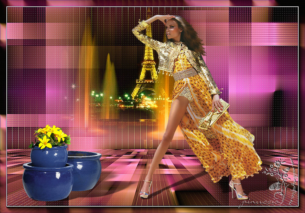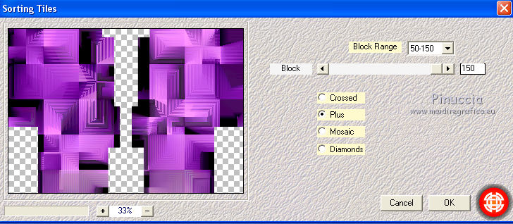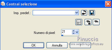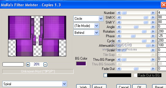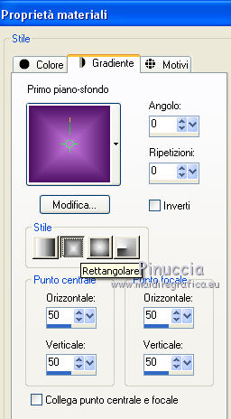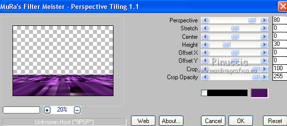 qui puoi trovare qualche risposta ai tuoi dubbi. Se l'argomento che ti interessa non è presente, ti prego di segnalarmelo. Questo tutorial è stato realizzato con Corel19 e tradotto con Corel X, ma può essere realizzato anche con le altre versioni di PSP. Dalla versione X4, il comando Immagine>Rifletti è stato sostituito con Immagine>Capovolgi in orizzontale, e il comando Immagine>Capovolgi con Immagine>Capovolgi in verticale. Nelle versioni X5 e X6, le funzioni sono state migliorate rendendo disponibile il menu Oggetti. Con la nuova versione X7, sono tornati Rifletti>Capovolgi, ma con nuove varianti. Vedi la scheda sull'argomento qui Occorrente: Tubes a scelta (una città, una donna e un tube accessorio). I tubes usati per il mio esempio sono di Beatriz Filtri in caso di dubbi, ricorda di consultare la mia sezione filtri qui Filters Unlimited 2.0 qui Mura's Meister - Perspective Tiling qui Mura's Meister - Copies qui FM Tile tools - Saturation Emboss qui Filter Factory Gallery M - Loom qui Mehdi - Sorting Tiles, Weaver qui AP 01 [Innovations] - Lines SilverLining qui Carolaine and Sensibility - CS-LDots qui AAA Frames - Foto Frame qui Alien Skin Eye Candy 5 Impact - Perspective Shadow qui I filtri Factory Gallery si possono usare da soli o importati in Filters Unlimited (come fare vedi qui) Se un filtro fornito appare con questa icona ![]() non esitare a cambiare modalità di miscelatura e opacità secondo i colori utilizzati. Nelle ultime versioni di PSP non c'è il gradiente di primo piano/sfondo (Corel_06_029) Puoi usare i gradienti delle versioni precedenti. Trovi qui i gradienti Corel X. 1. Apri una nuova immagine trasparente 800 x 700 pixels. 2. Imposta il colore di primo piano con #c97ae2, e il colore di sfondo con #4e1064. ![]() Passa il colore di primo piano a Gradiente di primo piano/sfondo, stile Lineare. ![]() Riempi l'immagine trasparente con il gradiente.4. Attiva lo strumento Selezione , rettangolo![]() Traccia un rettangolo da 200 a 600 pixels, per tutta l'altezza della tela ![]() 5. Riempi la selezione con il gradiente.Mantieni selezionato. 6. Effetti>Plugins>Filters Unlimited 2.0 - Buttons &Frames - 3D Glass Frame 3. ![]() 7. Selezione>Modifica>Contrai - 21 pixels. ![]() 8. Effetti>Effetti 3D>Sfalsa ombra, colore nero. ![]() 9. Effetti>Plugins>Filters Unlimited 2.0 - Filter Factory Gallery M - Loom ![]() 10. Effetti>Plugins>FM Tile Toolsa - Saturation emboss, con i settaggi standard. ![]() Selezione>Deseleziona. 11. Immagine>Dimensioni tela - 1000 x 700 pixels. ![]() 12. Effetti>Effetti di immagine>Scostamento ![]() 13. Livelli>Duplica. Immagine>Rifletti. Livelli>Unisci>Unisci giù. 14. Effetti>Plugins>Mura's Meister - Copies. ![]() 15. Effetti>Plugins>Mehdi - Sorting Tiles ![]() 16. Effetti>Plugins>Mehdi - Weaver ![]() 17. Effetti>Effetti 3D>Sfalsa ombra, colore nero ![]() 18. Livelli>Nuovo livello raster. Riempi con il gradiente.Livelli>Disponi>Porta sotto. 19. Effetti>Plugins>AP 01 [Innovations] - Lines SilverLining. ![]() 20. Modifica>Copia Unione. Modifica>Incolla come nuovo livello livello. 21. Effetti>Plugins>Mura's Meister - Perspective Tiling. ![]() 22. Effetti>Effetti 3D>Sfalsa ombra, colore nero. ![]() 23. Attiva il livello superiore - raster 1. Effetti>Plugins>Carolaine and Sensibility - CS-LDots ![]() 24. Attiva il livello sottostante - Raster 3 (il pavimento) Apri il tube della città e vai a Modifica>Copia. Torna al tuo lavoro e vai a Modifica>Incolla come nuovo livello. Attiva il livello superiore - Raster 1. Attiva lo strumento Gomma , dimensione 250 pixels,per il mio esempio ho usato la forma quadrata e ho abbassato l'opacità al 50% ![]() e cancella la parte centrale ![]() 25. Livelli>Unisci>Unisci visibile. 26. Effetti>Plugins>AAA Frames - Foto Frame. ![]() Regola>Messa a fuoco>Accentua messa a fuoco. 27. Aggiungi il tube della donna e un tube accessorio. Applica Effetti>Plugins>Alien Skin Eye Candy 5 Impact - Perspective Shadow, factory default Per il mio esempio ho abbassato l'opacità al 60%. ![]() 28. Firma il tuo lavoro. 29. Livelli>Unisci>Unisci tutto. I tubes di questo esempio sono di Tocha ![]() ![]() Le vostre versioni. Grazie ![]() Maria L. ![]() Puoi scrivermi se hai problemi o dubbi, o trovi un link che non funziona, o soltanto per un saluto. 15 Maggio 2017 |