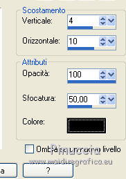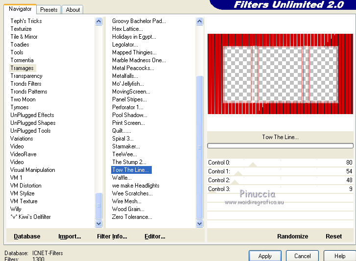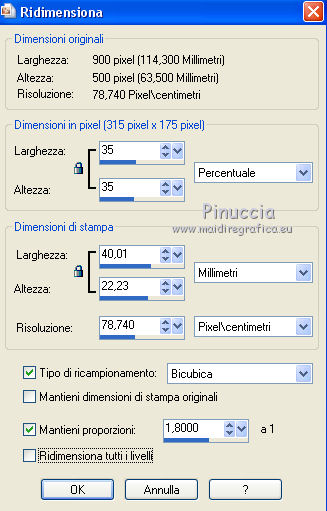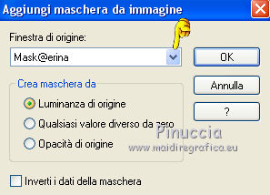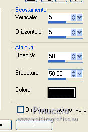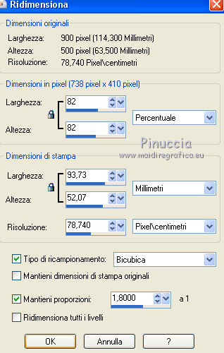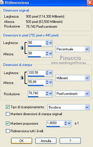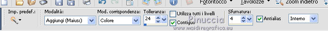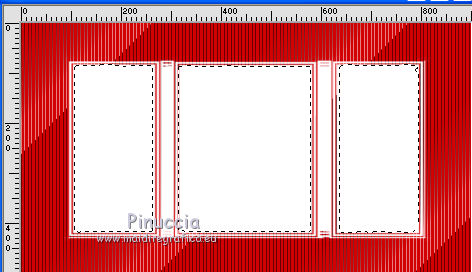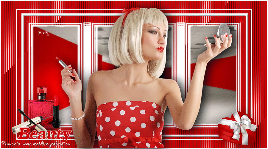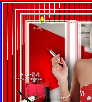 qui puoi trovare qualche risposta ai tuoi dubbi. Se l'argomento che ti interessa non è presente, ti prego di segnalarmelo. Questo tutorial è stato realizzato con Corel18 e tradotto con Corel X, ma può essere realizzato anche con le altre versioni di PSP. Dalla versione X4, il comando Immagine>Rifletti è stato sostituito con Immagine>Capovolgi in orizzontale, e il comando Immagine>Capovolgi con Immagine>Capovolgi in verticale. Nelle versioni X5 e X6, le funzioni sono state migliorate rendendo disponibile il menu Oggetti. Con la nuova versione X7, sono tornati Rifletti>Capovolgi, ma con nuove varianti. Vedi la scheda sull'argomento qui Occorrente: Materiale qui Per il tube della donna grazie Maryse. (nel materiale trovi i tube di altre donne "in rosso") Filtri in caso di dubbi, ricorda di consultare la mia sezione filtri qui Filters Unlimited 2.0 qui Tramages - Tow the line qui I filtri Tramages si possono usare da soli o importati in Filters Unlimited (come fare vedi qui) Se un filtro fornito appare con questa icona ![]() non esitare a cambiare modalità di miscelatura e opacità secondo i colori utilizzati. Apri la maschera in PSP e minimizzala con il resto del materiale. 1. Imposta il colore di primo piano con #d00004, e il colore di sfondo con il colore bianco #ffffff. 2. Apri una nuova immagine trasparente 900 x 500 pixels, e riempila con il colore bianco #ffffff.![]() 3. Livelli>Nuovo livello raster. Riempi con il colore rosso #d00004.4. Livelli>Nuovo livello maschera>Da immagine. Apri il menu sotto la finestra di origine e vedrai la lista dei files aperti. Seleziona la maschera Mask@erina. ![]() Livelli>Unisci>Unisci gruppo. 5. Effetti>Plugins>Filters Unlimited 2.0 - Tramages - Tow the line, con i settaggi standard. ![]() 6. Attiva lo strumento Bacchetta magica con i seguenti settaggi![]() Clicca nei riquadri bianchi della maschera per selezionarli. ![]() 7. Livelli>Nuovo livello raster. Apri l'immagine Images7 e vai a Modifica>Copia. Torna al tuo lavoro e vai a Modifica>Incolla nella selezione. Selezione>Deseleziona. 8. Livelli>Nuovo livello raster. Riempi con il colore bianco #ffffff.Selezione>Seleziona tutto. Selezione>Modifica>Contrai - 10 pixels. ![]() 9. Premi sulla tastiera il tasto CANC ![]() Selezione>Deseleziona. 10. Immagine>Ridimensiona, all'82%, tutti i livelli non selezionato. ![]() Attiva lo strumento Puntatore ![]() e allarga i bordi per ottenere un quadrato regolare ![]() ![]() 11. Efetti>Effetti 3D>Smusso a incasso. ![]() 12. Livelli>Nuovo l ivello raster. Riempi con il colore bianco #ffffff.Selezione>Seleziona tutto. Selezione>Modifica>Contrai - 4 pixels. ![]() Premi sulla tastiera il tasto CANC. Selezione>Deseleziona. 13. Immagine>Ridimensiona, all'88%, tutti i livelli non selezionato. ![]() 14. Livelli>Nuovo l ivello raster. Riempi con il colore bianco #ffffff.Selezione>Seleziona tutto. Selezione>Modifica>Contrai - 3 pixels. ![]() Premi sulla tastiera il tasto CANC. Selezione>Deseleziona. 15. Apri il tube MR_Retouche_maquillage e vai a Modifica>Copia. Torna al tuo lavoro e vai a Modifica>Incolla come nuovo livello. Immagine>Ridimensiona, all'88%, tutti i livelli non selezionato. ![]() 16. Effetti>Effetti di immagine>Scostamento. ![]() 17. Effetti>Effetti 3D>Sfalsa ombra. ![]() 18. Apri il tube Red_Heart_Gift_Box e vai a Modifica>Copia. Torna al tuo lavoro e vai a Modifica>Incolla come nuovo livello. Immagine>Ridimensiona, al 35%, tutti i livelli non selezionato. ![]() 19. Effetti>Effetti di immagine>Scostamento. ![]() 20. Effetti>Effetti 3D>Sfalsa ombra. ![]() 21. Apri il tube p11-dozi e vai a Modifica>Copia. Torna al tuo lavoro e vai a Modifica>Incolla come nuovo livello. 22. Apri il tube tch rouge levres 011, e vai a Modifica>Copia. Torna al tuo lavoro e vai a Modifica>Incolla come nuovo livello. Immagine>Ridimensiona, al 35%, tutti i livelli non selezionato. 23. Apri il tube mascarager2a e vai a Modifica>Copia. Torna al tuo lavoro e vai a Modifica>Incolla come nuovo livello. Immagine>Ridimensiona, al 35%, tutti i livelli non selezionato. Posiziona i tre tubes a tuo piacimento, o vedi il mio esempio.![]() 24. Sui tre livelli: Effetti>Effetti 3D>Sfalsa ombra, con i settaggi precedenti. ![]() 25. Apri il file di testo felirat@erina, e vai a Modifica>Copia. Torna al tuo lavoro e vai a Modifica>Incolla come nuovo livello. 26. Effetti>Effetti di immagine>Scostamento. ![]() 27. Firma il tuo lavoro su un nuovo livello. 28. Livelli>Unisci>Unisci tutto e salva in formato jpg, se non vuoi realizzare l'animazione. Animazione Per animare il lavoro: Modifica>Copia. Apri Animation Shop e vai a Modifica>Incolla>Incolla come nuova animazione. 29. Modifica>Duplica e ripeti finché non avrai tot fotogrammi. Clicca sul primo fotogramma per selezionarlo e vai a Modifica>Seleziona tutto. 30. Apri l'animazione, anche questa composta da fotogrammi. Modifica>Seleziona tutto. Modifica>Copia. Attiva il tuo lavoro e vai a Modifica>Incolla>Incolla nel fotogramma selezionato. Posiziona l'animazione a tuo piacimento o vedi il mio esempio. ![]() 31. Controlla il risultato cliccando su Visualizza e salva in formato gif.![]() Puoi scrivermi se hai problemi o dubbi, o trovi un link che non funziona, o soltanto per un saluto. 2 Novembre 2016 |