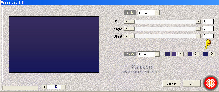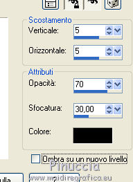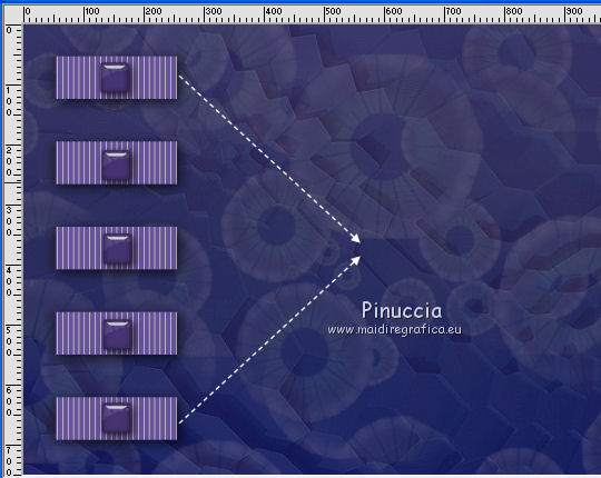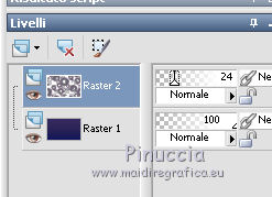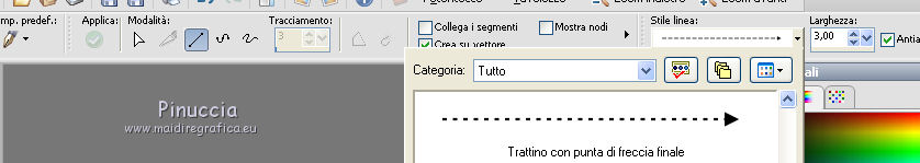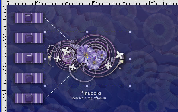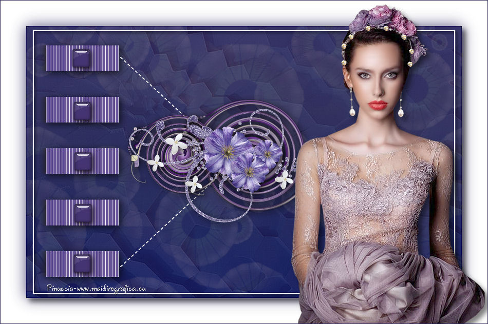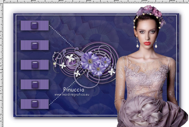 qui puoi trovare qualche risposta ai tuoi dubbi. Se l'argomento che ti interessa non è presente, ti prego di segnalarmelo. Questo tutorial è stato realizzato con Corel2018 e tradotto con Corel X, ma può essere realizzato anche con le altre versioni di PSP. Dalla versione X4, il comando Immagine>Rifletti è stato sostituito con Immagine>Capovolgi in orizzontale, e il comando Immagine>Capovolgi con Immagine>Capovolgi in verticale. Nelle versioni X5 e X6, le funzioni sono state migliorate rendendo disponibile il menu Oggetti. Con la nuova versione X7, sono tornati Rifletti>Capovolgi, ma con nuove varianti. Vedi la scheda sull'argomento qui traduzione in francese qui le vostre versioni qui Occorrente: Un tube a scelta Il resto del materiale qui Per il tube grazie Mina. Il resto del materiale è di Erina (in questa pagina trovi i links ai siti dei creatori di tubes) Filtri in caso di dubbi, ricorda di consultare la mia sezione filtri qui Mehdi - Wavy Lab 1.1 qui Alien Skin Eye Candy 5 Impact - Perspective Shadow qui ![]() non esitare a cambiare modalità di miscelatura e opacità secondo i colori utilizzati. 1. Apri una nuova immagine trasparente 1200 x 750 pixels. Imposta il colore di primo piano con #4b3a77, e il colore di sfondo con #2b2457. ![]() Effetti>Plugins>Mehdi - Wavy Lab 1.1 Questo filtro lavora con i colori della paletta: il primo è il colore di sfondo, il secondo quello di primo piano degli ultimi due colori creati dal filtro cambia l'ultimo con #1a1630. ![]() 2. Selezione>Seleziona tutto. Apri il tube Erina_Circle_decor e vai a Modifica>Copia. Torna al tuo lavoro e vai a Modifica>Incolla nella selezione. Abbassa l'opacità di questo livello al 24%. ![]() Mantieni selezionato. 3. Livelli>Nuovo livello raster. Apri l'immagine Background_jpg e vai a Modifica>Copia. Torna al tuo lavoro e vai a Modifica>Incolla nella selezione. Abbassa l'opacità di questo livello al 12%. ![]() Selezione>Deseleziona. Effetti>Effetti di bordo>Aumenta di più. Livelli>Unisci>Unisci visibile. 4. Apri il tube Csikok_decor e vai a Modifica>Copia. Torna al tuo lavoro e vai a Modifica>Incolla come nuovo livello. Sposta il tube a sinistra.![]() Effetti>Effetti 3D>Sfalsa ombra. ![]() Colorizza se necessario. 5. Apri "Erina_buttons" e vai a Modifica>Copia. Torna al tuo lavoro e vai a Modifica>Incolla come nuovo livello. Sposta il tube a sinistra, sopra i rettangoli![]() Colorizza, se necessario. 6. Imposta il colore di primo piano con il colore bianco Attiva lo strumento Penna , linea di stile Trattino con punta di freccia finale![]() Traccia due linee come nell'esempio ![]() 7. Apri "flower_decor" e vai a Modifica>Copia. Torna al tuo lavoro e vai a Modifica>Incolla come nuovo livello. Sposta il tube un po' più a sinistra.![]() 8. Livelli>Nuovo livello raster. Selezione>Seleziona tutto. Riempi il livello con il colore bianco.Selezione>Modifica>Contrai - 3 pixels. ![]() Premi sulla tastiera il tasto CANC ![]() Selezione>Deseleziona. 9. Immagine>Ridimensiona, al 97%, tutti i livelli non selezionato. ![]() Effetti>Effetti 3D>Sfalsa ombra. ![]() 10. Immagine>Aggiungi bordatura, 1 pixel, simmetriche, colore bianco. Selezione>Seleziona tutto. Immagine>Aggiungi bordatura, 70 pixels, simmetriche, colore bianco. 11. Effetti>Plugins>Alien Skin Eye Candy 5 Impact - Perspective Shadow. Shadow Color: #29245a ![]() Effetti>Effetti 3D>Sfalsa ombra. ![]() 12. Apri il tube della donna e vai a Modifica>Copia. Torna al tuo lavoro e vai a Modifica>Incolla come nuovo livello. Immagine>Ridimensiona, al 130%, tutti i livelli non selezionato. Spostalo a destra.![]() 13. Immagine>Aggiungi bordatura, 1 pixel, simmetriche, colore scuro. Immagine>Ridimensiona, 950 pixels di larghezza, tutti i livelli selezionato. 14. Firma il tuo lavoro e salva in formato jpg. Piccola nota sul watermark. Non chiedo mai di mettere il watermark nelle versioni fatte seguendo le mie traduzioni. Ma, se decidi di utilizzare il watermark fornito dall'autore, apprezzerei che anche il mio lavoro fosse rispettato. Per questo, ho aggiunto al materiale il mio watermark. ![]() ![]() Puoi scrivermi se hai problemi o dubbi, o trovi un link che non funziona, o soltanto per un saluto. 2 Maggio 2018 |