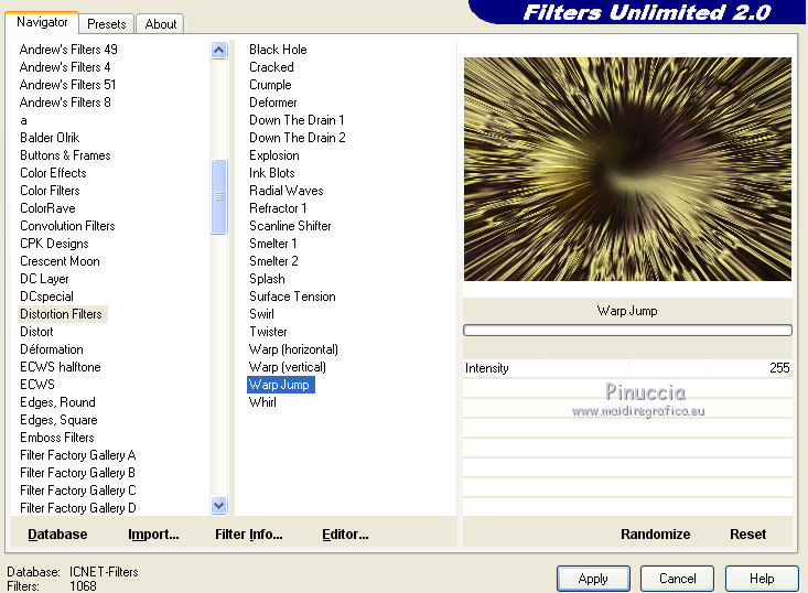 6. Effets>Modules Externes>Filters Unlimited 2.0 - Distortion Filters - Warp Jump