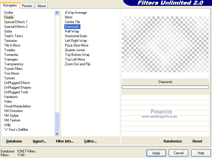 12. Effets>Modules Externes>Filters Unlimited 2.0 - Simple - Diamonds.