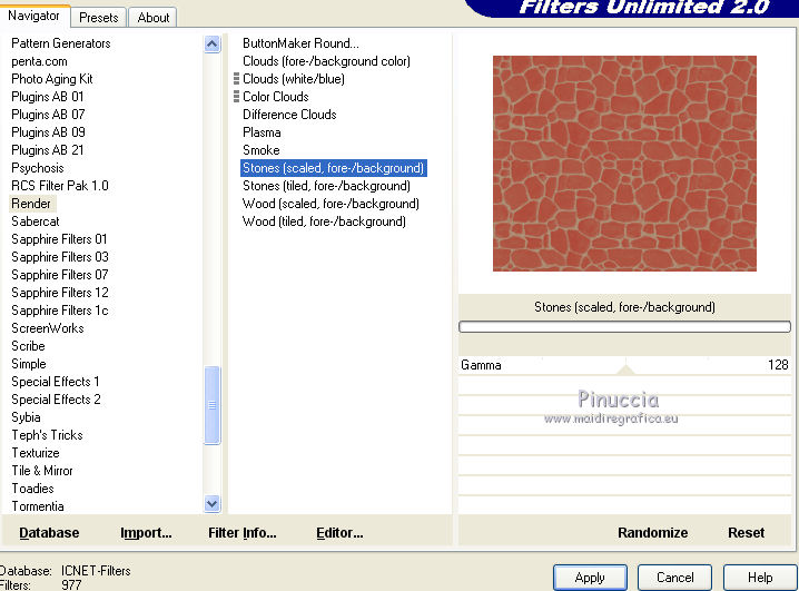 15. Effets>Modules Externes>Filters Unlimited 2.0 - Render: Stone (scaled, fore-/background).