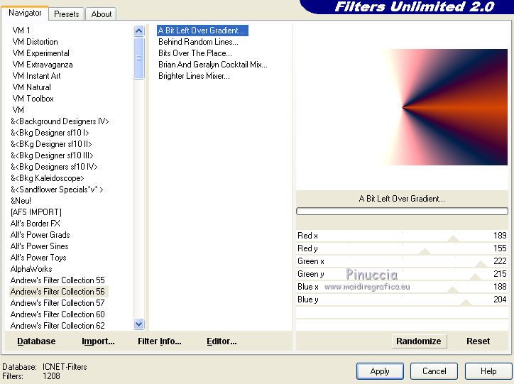 11. Effets>Modules Externes>Filters Unlimited 2.0 - Andrew's Filter Collection 56 - A Bit Left Over Gradient, par défaut.