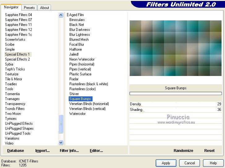 14. Effets>Modules Externes>Filters Unlimited 2.0 - Special Effects 1 - Square Bumps.