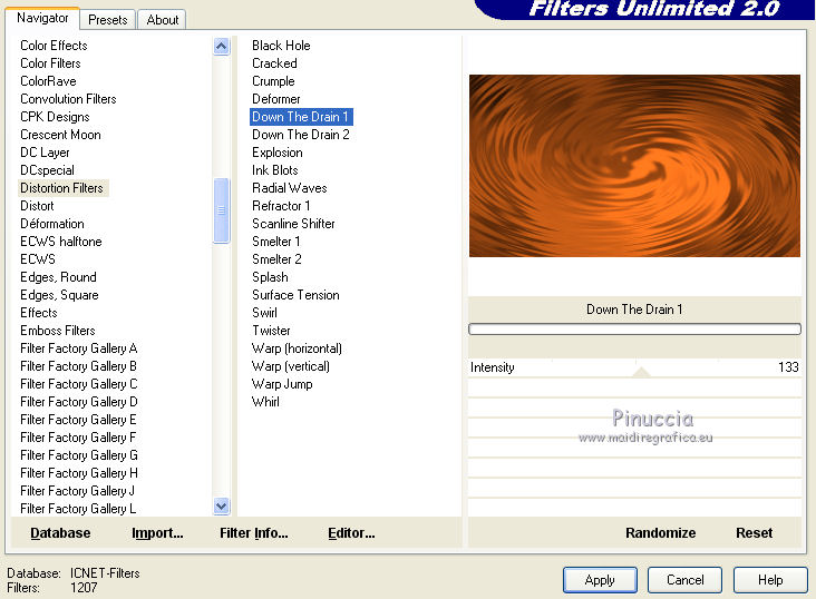 13. Effets>Modules Externes>>Filters Unlimited 2.0 - Distortion Filters - Down The Drain 1, comme précédemment.