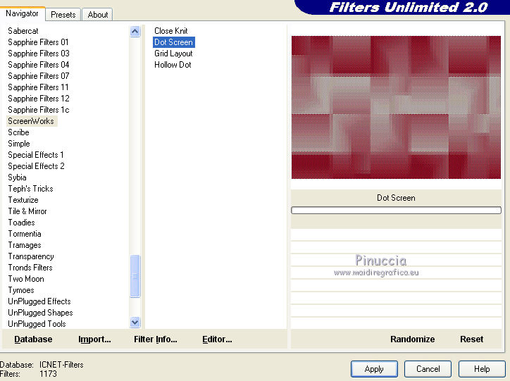 Effets>Modules Externes>Filters Unlimited 2.0 - Cybia - Screenworks - Dot Screen.