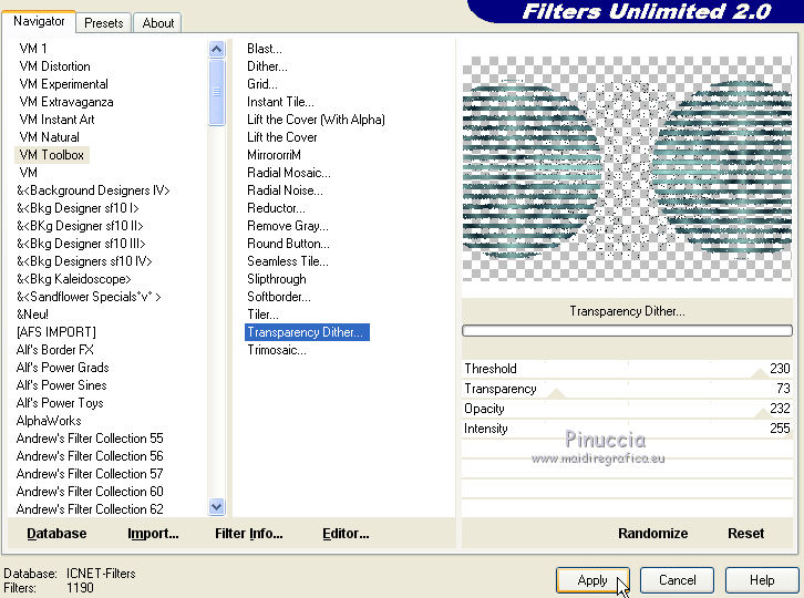 Effets>Modules Externes>Filters Unlimited 2.0 - VM Toolbox - Transparency Dither