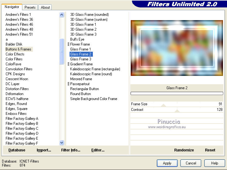 2. Effets>Modules Externes>Filters Unlimited 2.0 - Buttons & Frames - Glass Frame 2.
