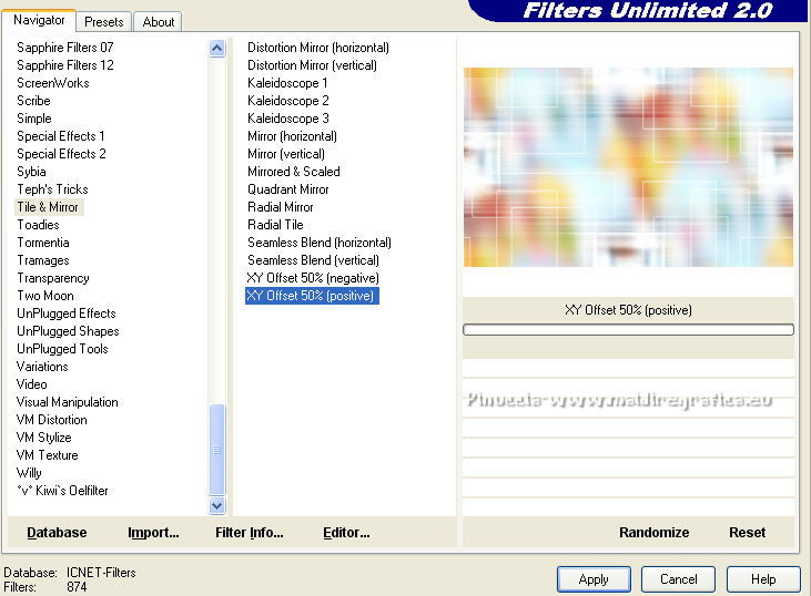 8. Effets>Modules Externes>Filters Unlimited 2.0 - Tile &Mirror - XY Offset 50% (positive)