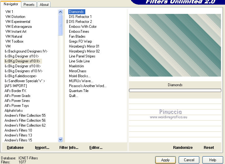 4. Effets>Modules Externes>Filters Unlimited 2.0 - &<Bkg Designer sf10II> - Diamonds.