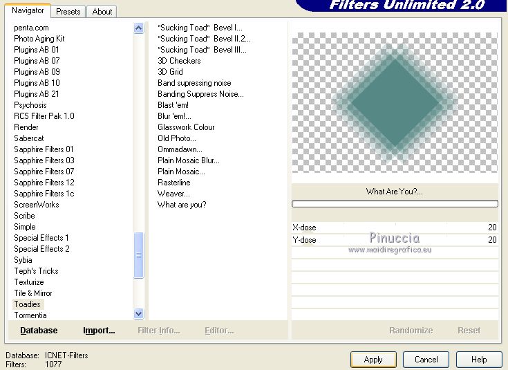 12. Effets>Modules Externes>Filters Unlimited 2.0 - Toadies - What are you, par défaut.