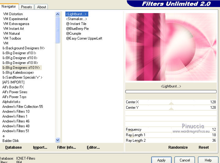 Effets>Modules Externes>Filters Unlimited 2.0 - &<Bkg Designers sf10IV> - <Lightburst>...