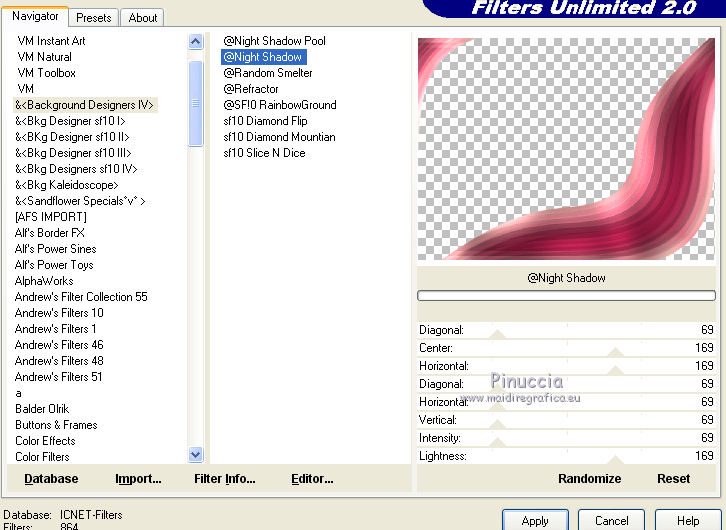 Effets>Modules Externes>Filters Unlimited 2.0 - &<Bkg Designers sf10IV> - @Night Shadow, comme précédemment.