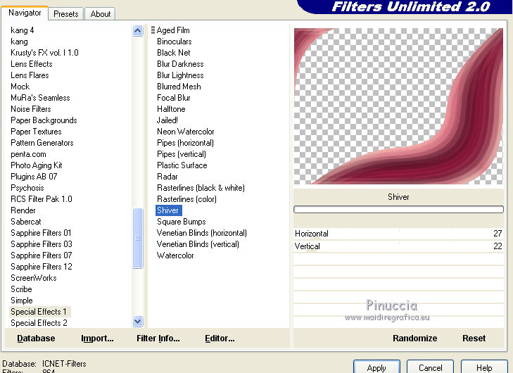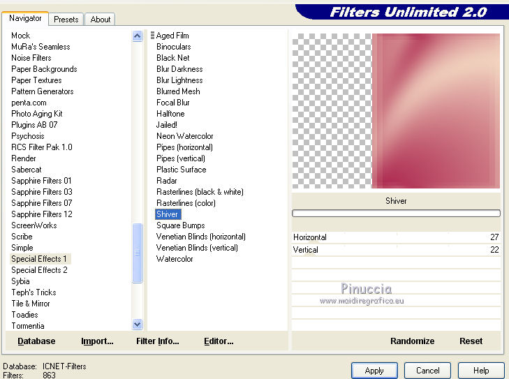 Effets>Modules Externes>Filters Unlimited 2.0 - Special Effects 1 - Shiver