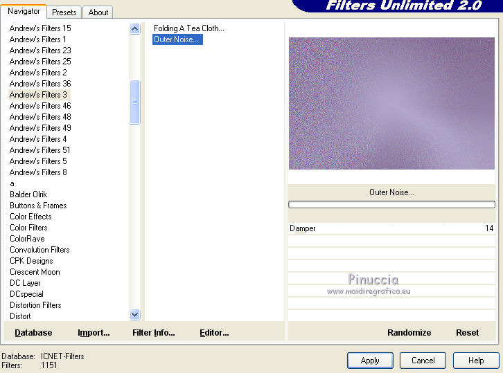 2. Effets>Modules Externes>Filters Unlimited 2.0 - Andrew's Filters 3 - Outer Noise.