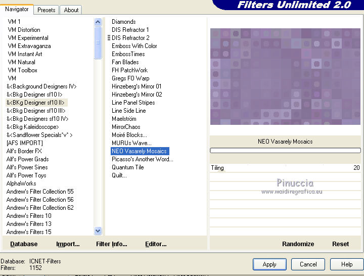 8. Effets>Modules Externes>Filters unlimited 2.0 - &<Bkg Designer sf10II> - NEO Vasarely Mosaics.