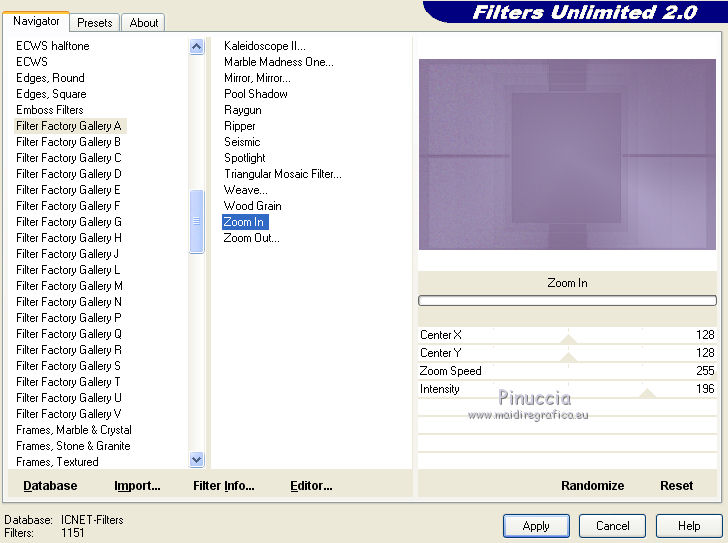 6. Effets>Modules Externes>Filters unlimited 2.0 - Filter Factory Gallery A - Zoom In, par défaut.
