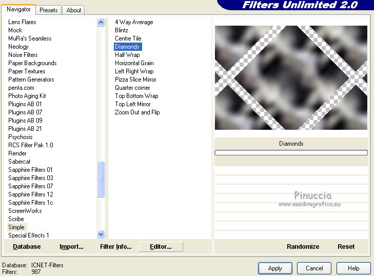 6. Effets>Modules Externes>Filters Unlimited 2.0 - Simple - Diamonds