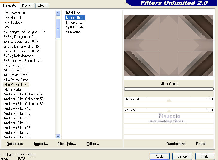 Effets>Modules Externes>Filters Unlimited 2.0 - Alf's Power Toys - Mirror Offset, par défaut.