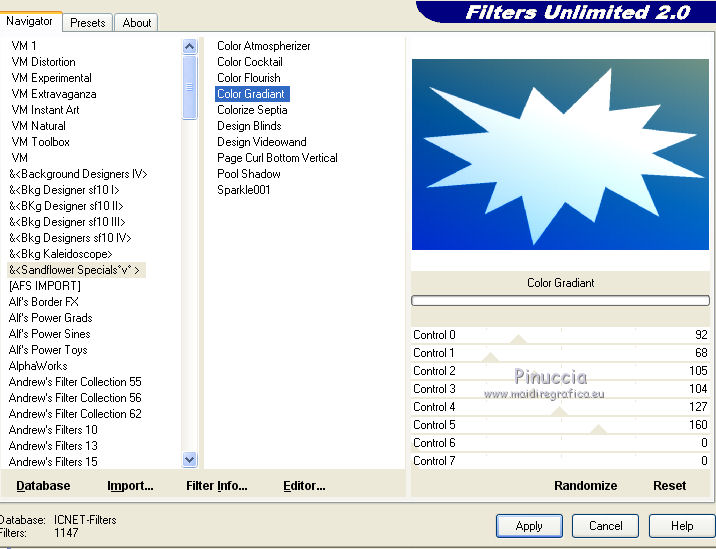 4. Effets>Modules Externes>Filters Unlimited 2.0 - &<Sandflowers Specials "V"> - Color Gradiant.