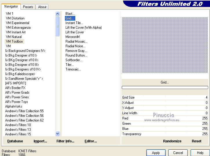 15. Effets>Modules Externes>Filters Unlimited 2.0 - VM Toolbox - Grid