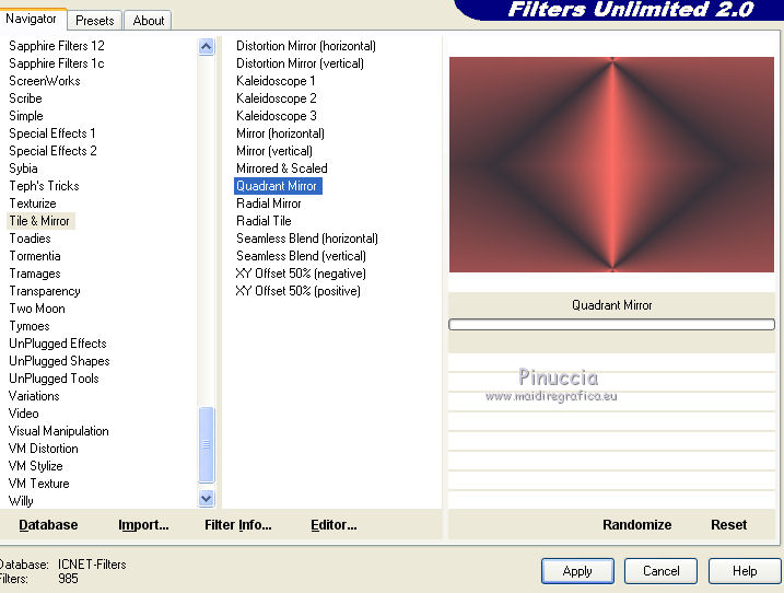 2. Effets>Modules Externes>Filters Unlimited 2.0 - Tile &Mirror - Quadrant Mirror.