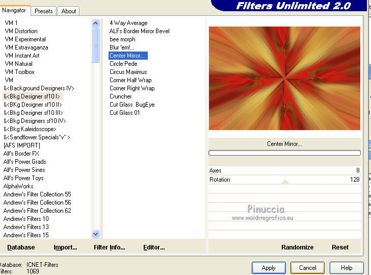 4. Effets>Modules Externes>Filters Umlimited 2.0 - &<Bkg Designer sf10I> - Center Mirror, par défaut.