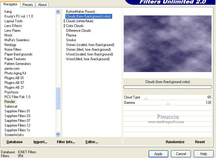 2. Effets>Modules Externes>Filters Unlimited 2.0 - Render - Clouds(fore-/background color)