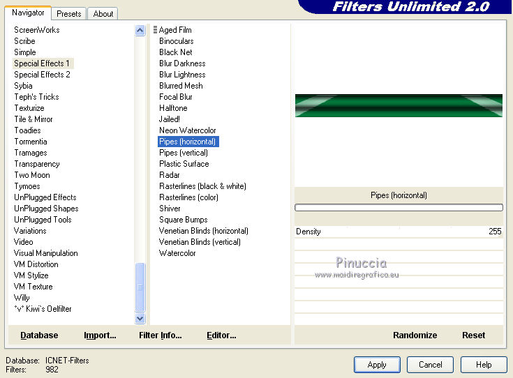 12. Effets>Modules Externes>Filters Unlimited 2.0 - Special Effects 1 - Pipes (horizontal)