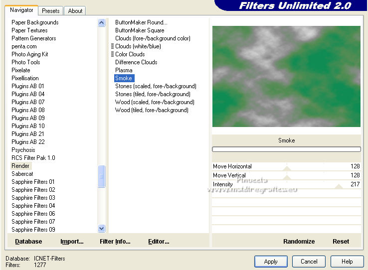 3. Effets>Modules Externes>Filters Unlimited 2.0 - Render - Smoke, par défaut.