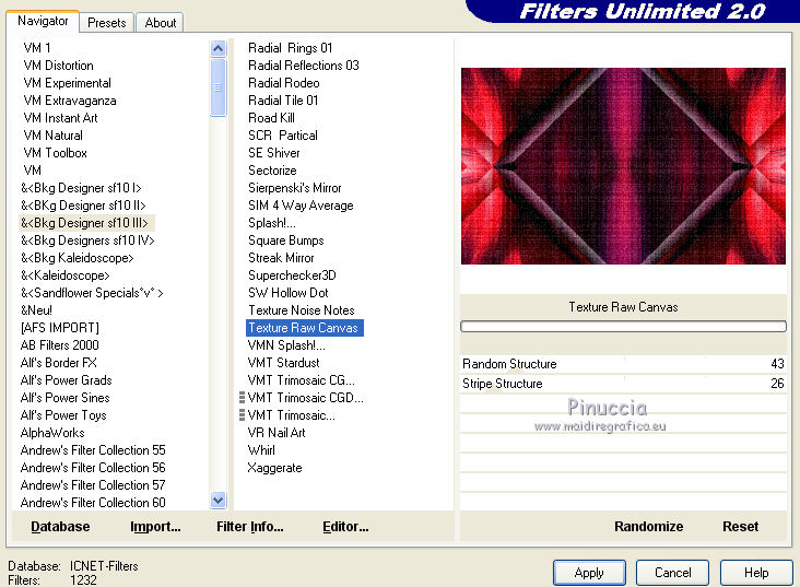 6. Effets>Modules Externes>Filters Unlimited 2.0 - &<Bkg Designer sf10III> - Texture Raw Canvas.